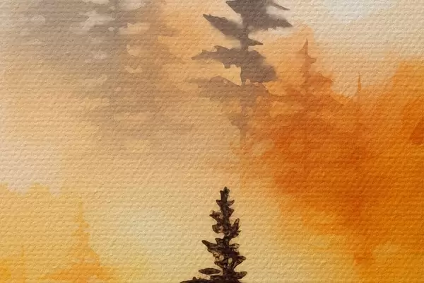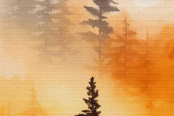 Picturi rotunde O imitație de pictură peisaj acuarelă a unei păduri cu pini înalți și munți în fundal Nr r45170