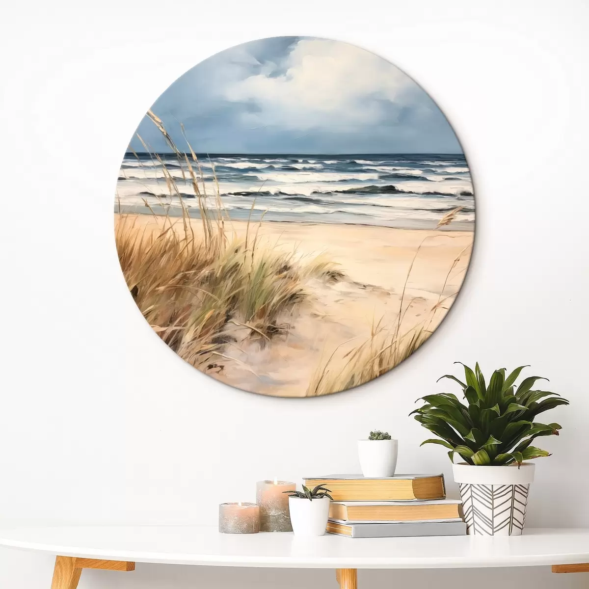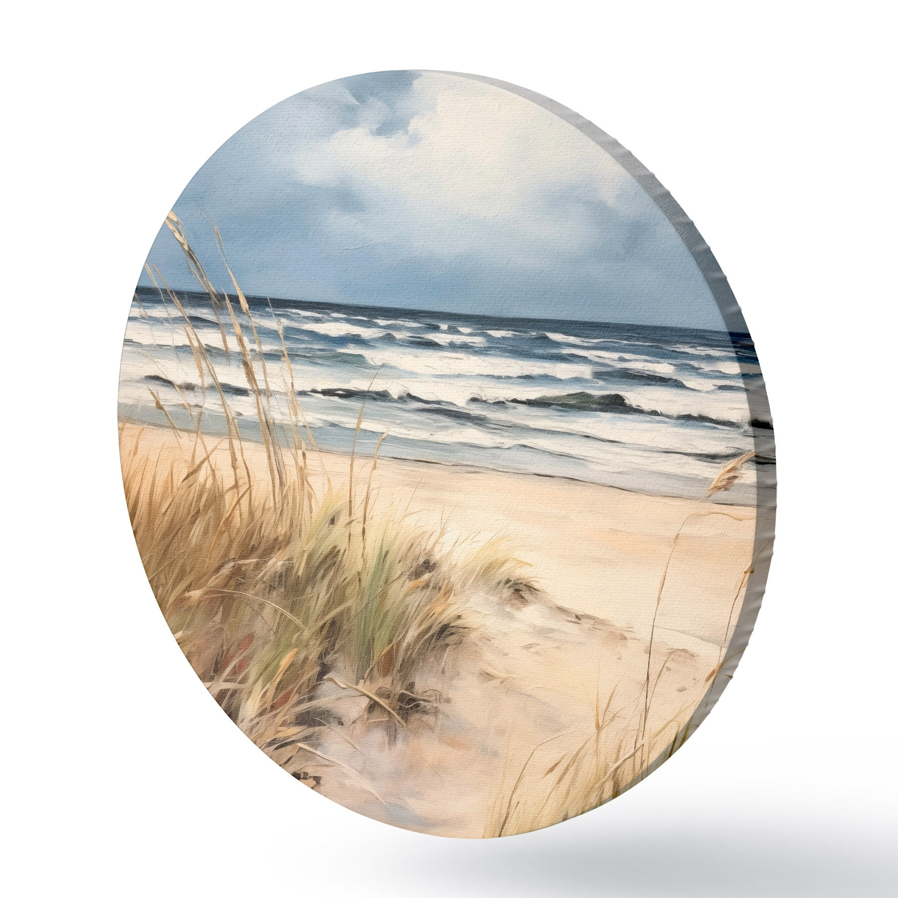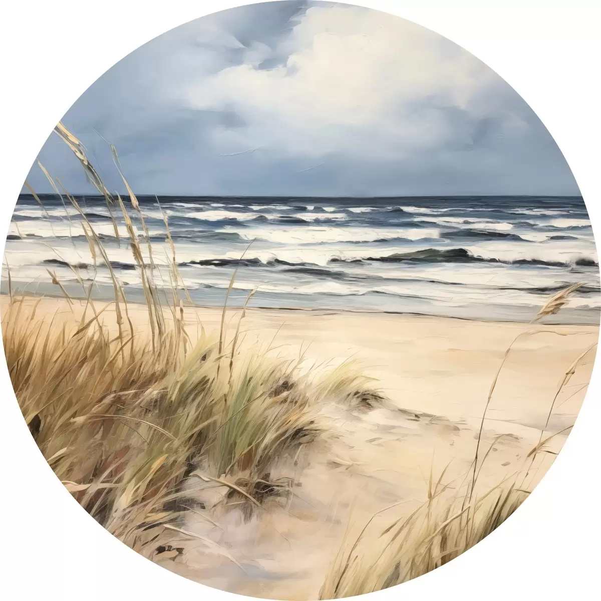 Picturi rotunde O plajă nisipoasă cu iarbă înaltă în prim-plan, oceanul cu valuri și un cer înnorat în fundal r45173