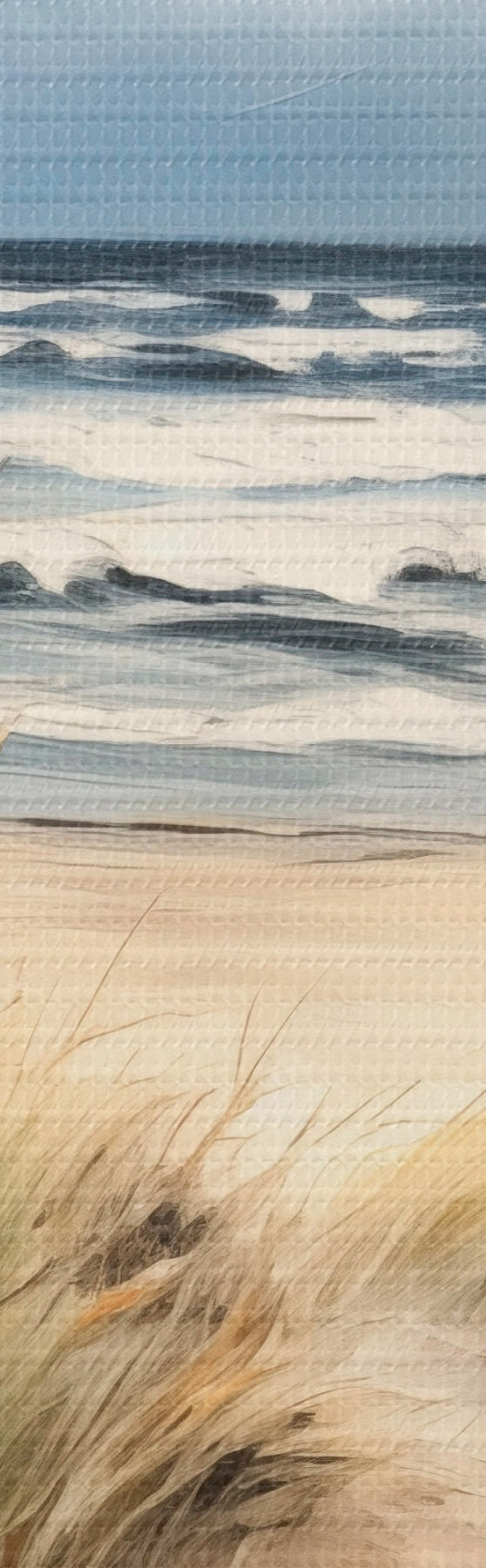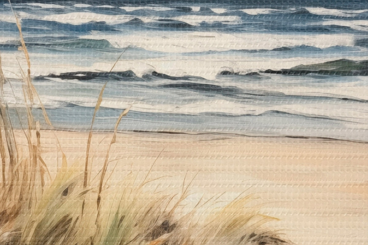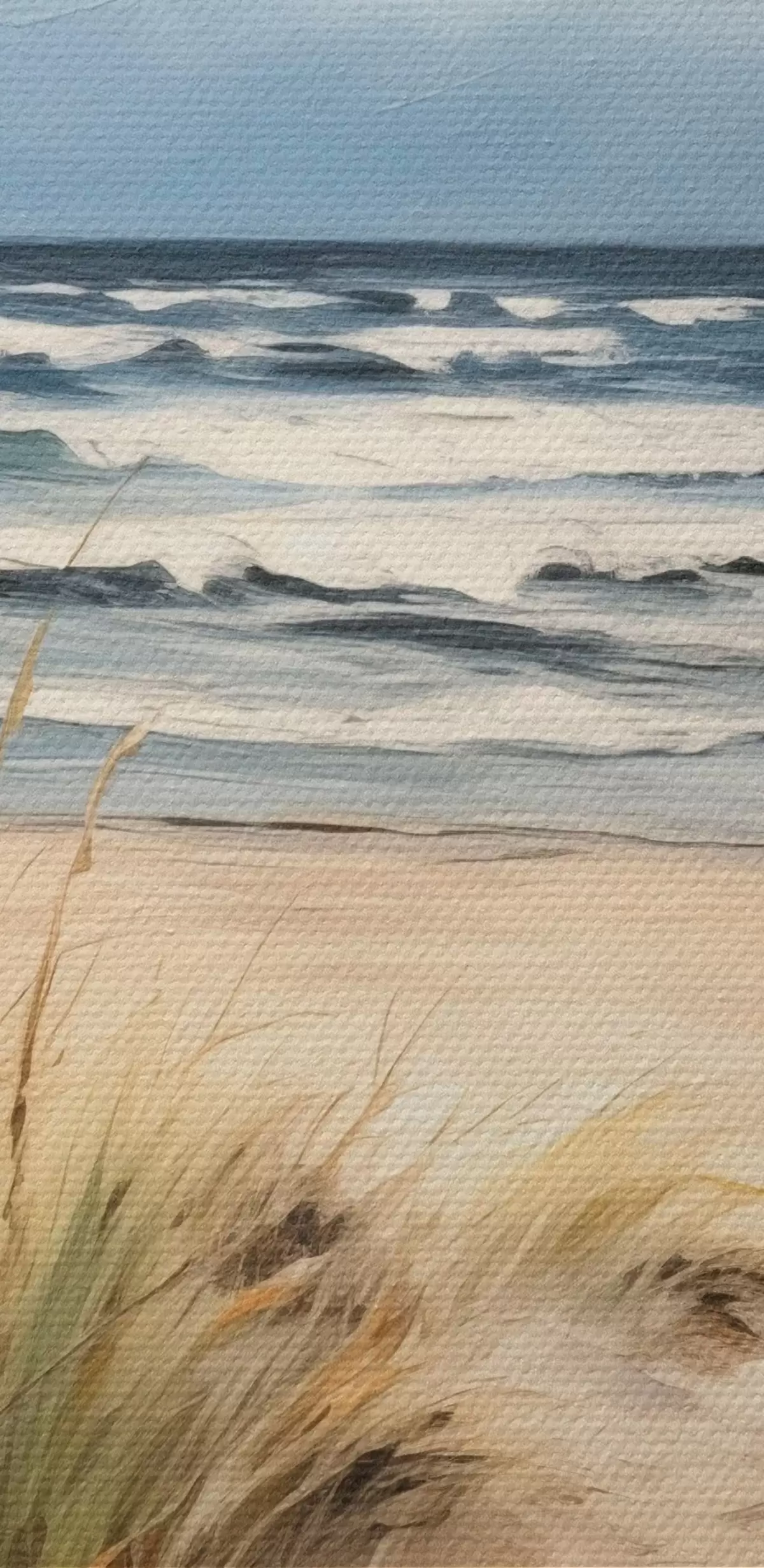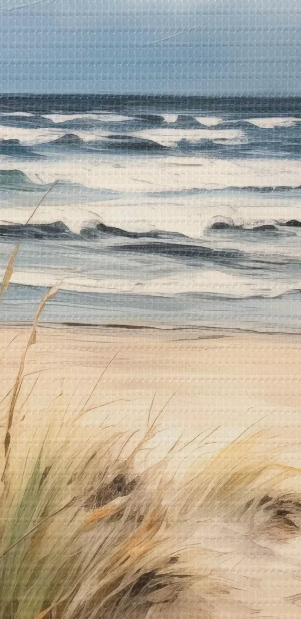 Picturi rotunde O plajă nisipoasă cu iarbă înaltă în prim-plan, oceanul cu valuri și un cer înnorat în fundal Nr r45173