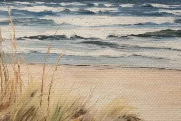 Picturi rotunde O plajă nisipoasă cu iarbă înaltă în prim-plan, oceanul cu valuri și un cer înnorat în fundal Nr r45173