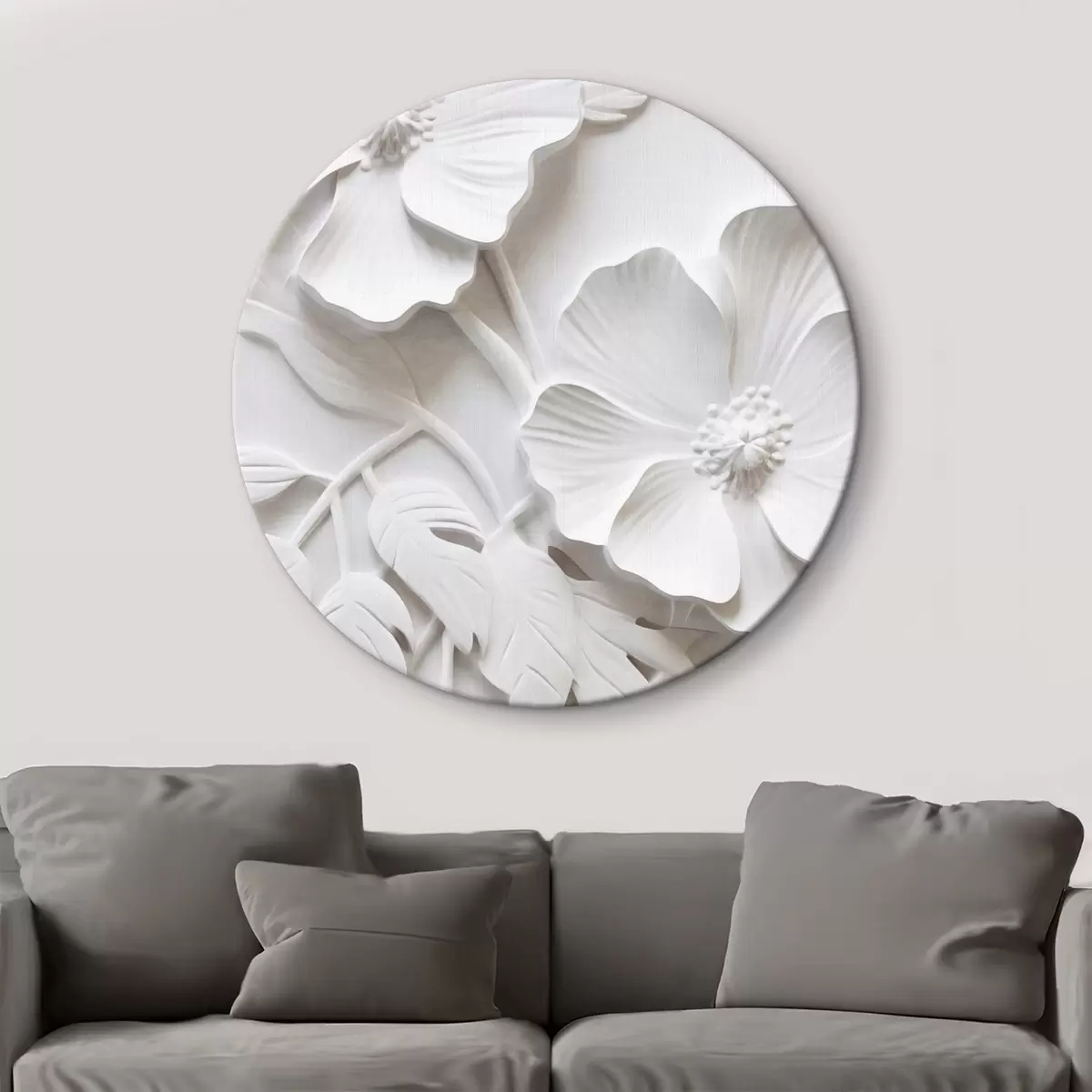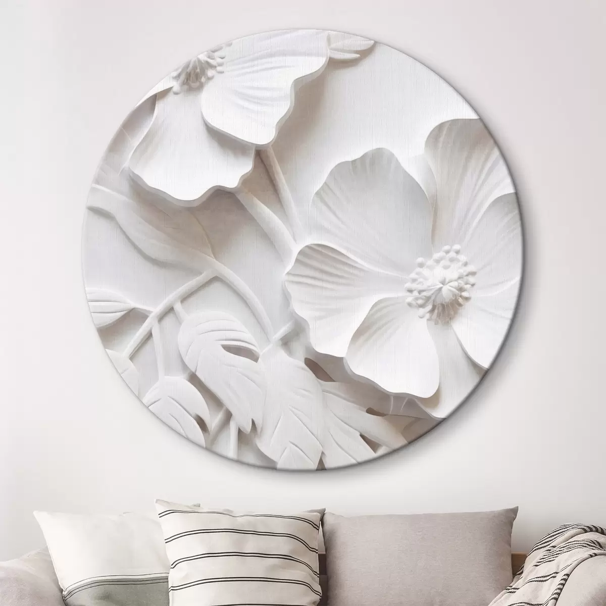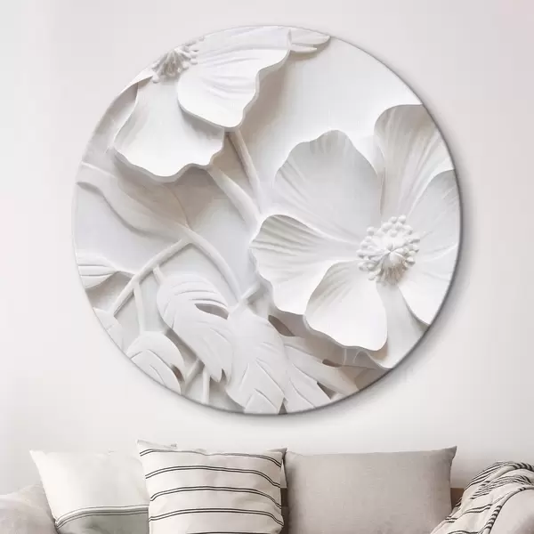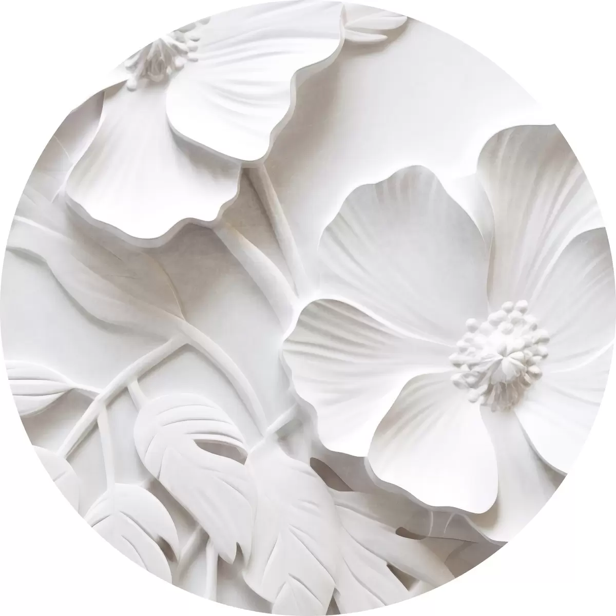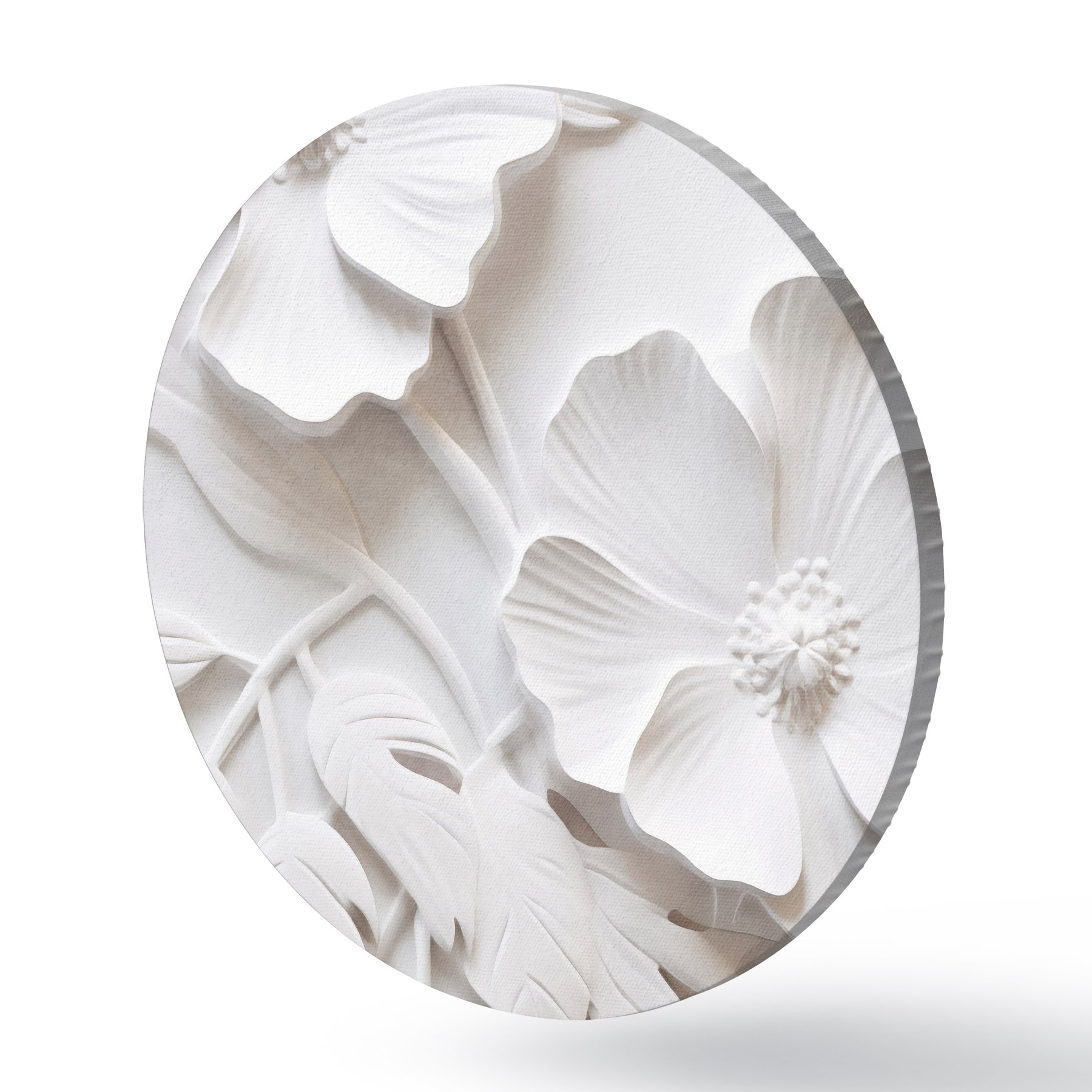 Picturi rotunde Decorative minimaliste flori albe cu frunze, imitație de relief, fundal alb Nr r45179