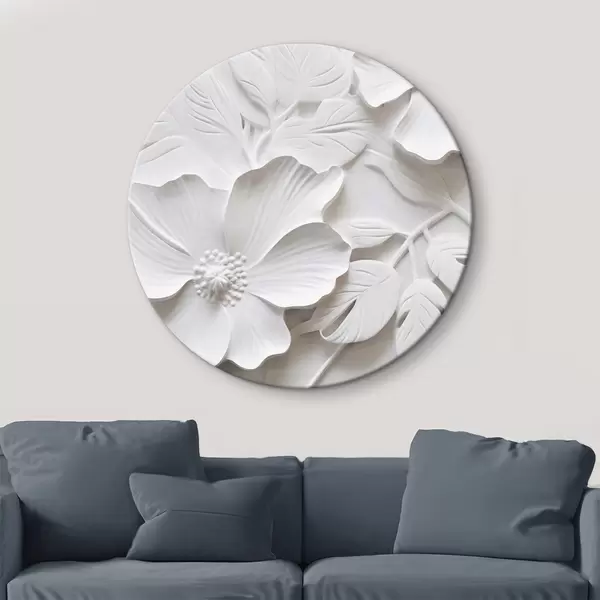Picturi rotunde Decorative minimaliste flori albe cu frunze, imitație de relief, fundal alb Nr r45180
