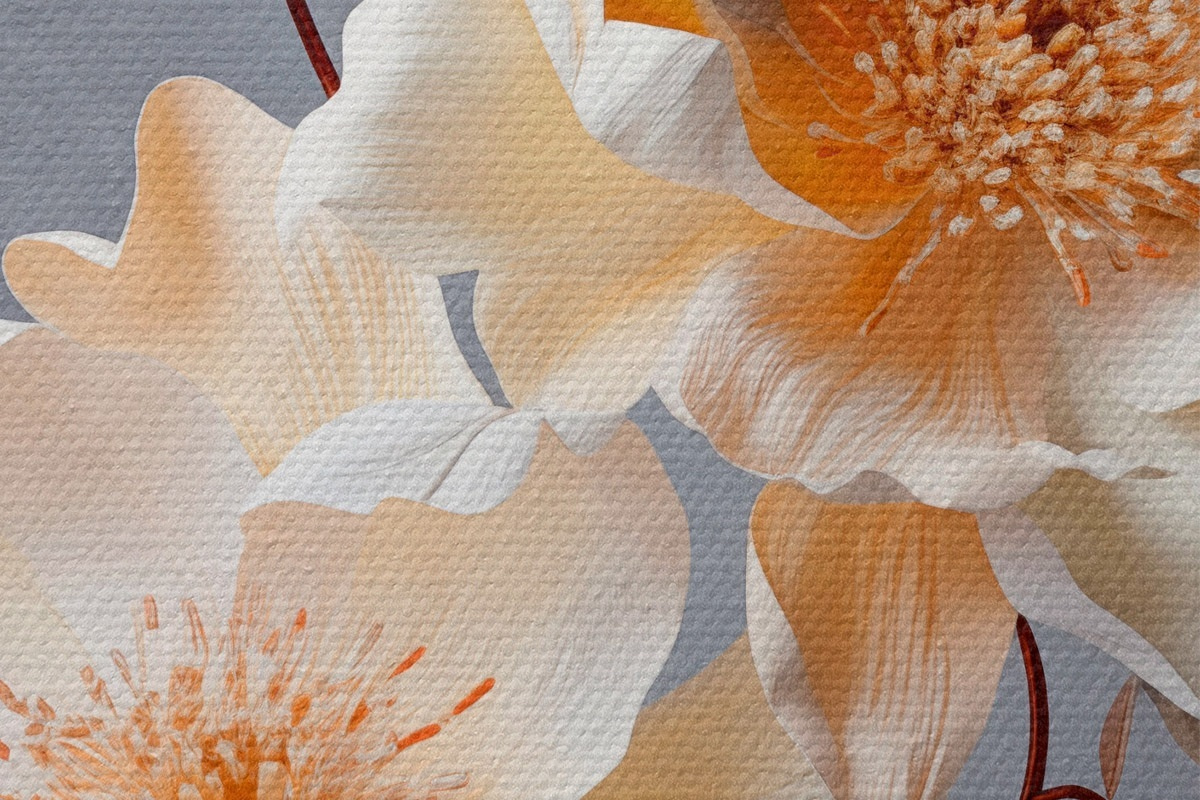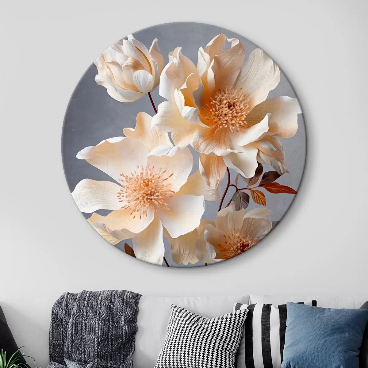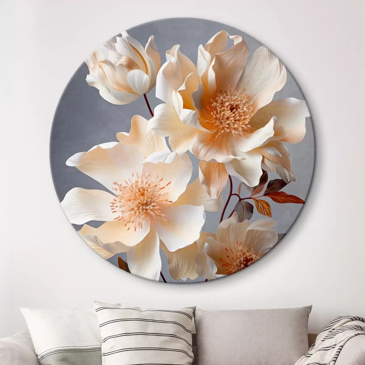 Picturi rotunde Flori texturate cu pistil portocaliu și frunze portocalii pe fundal gri, lumină moale, elegant, detaliat, realist r45181