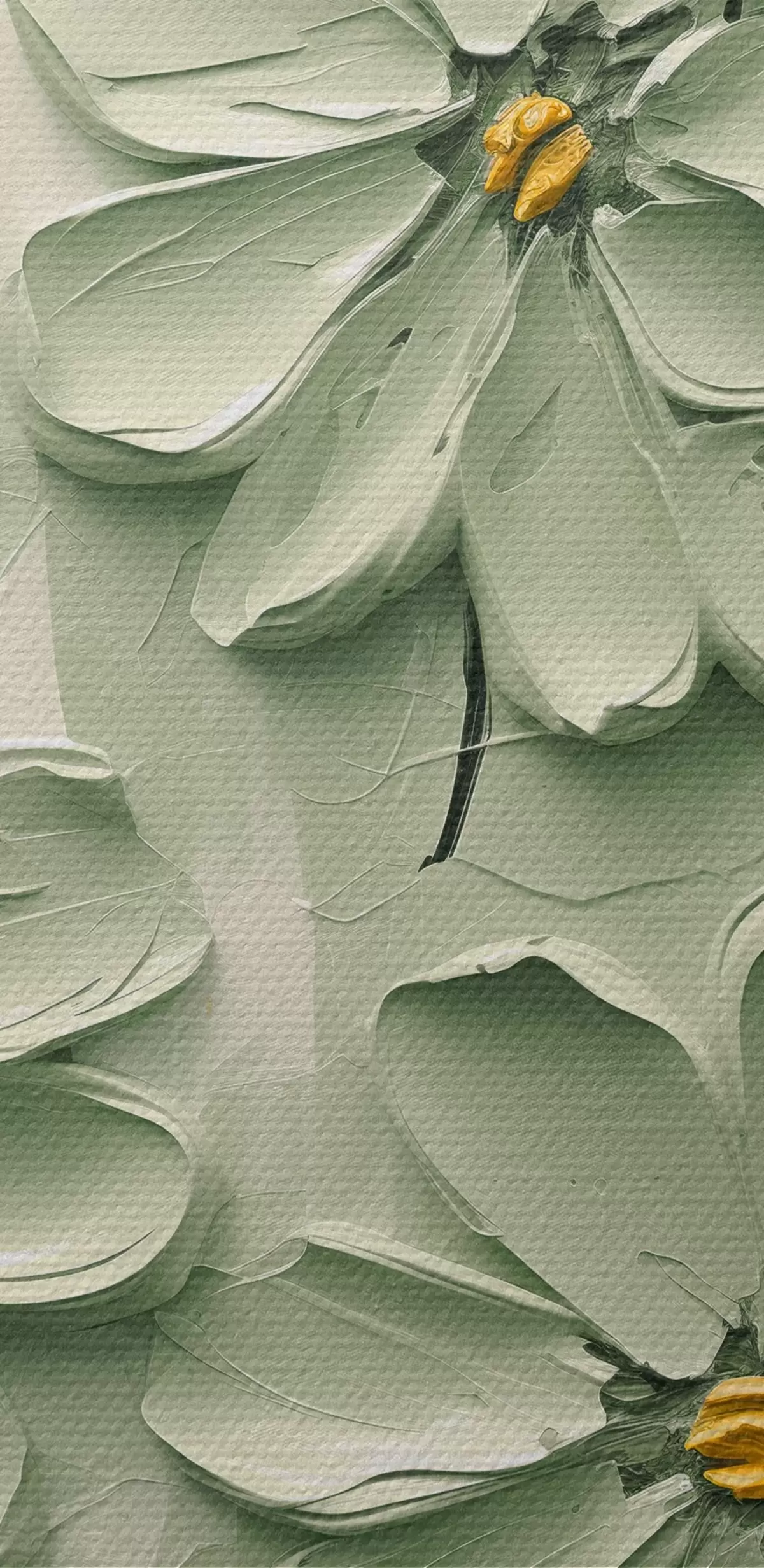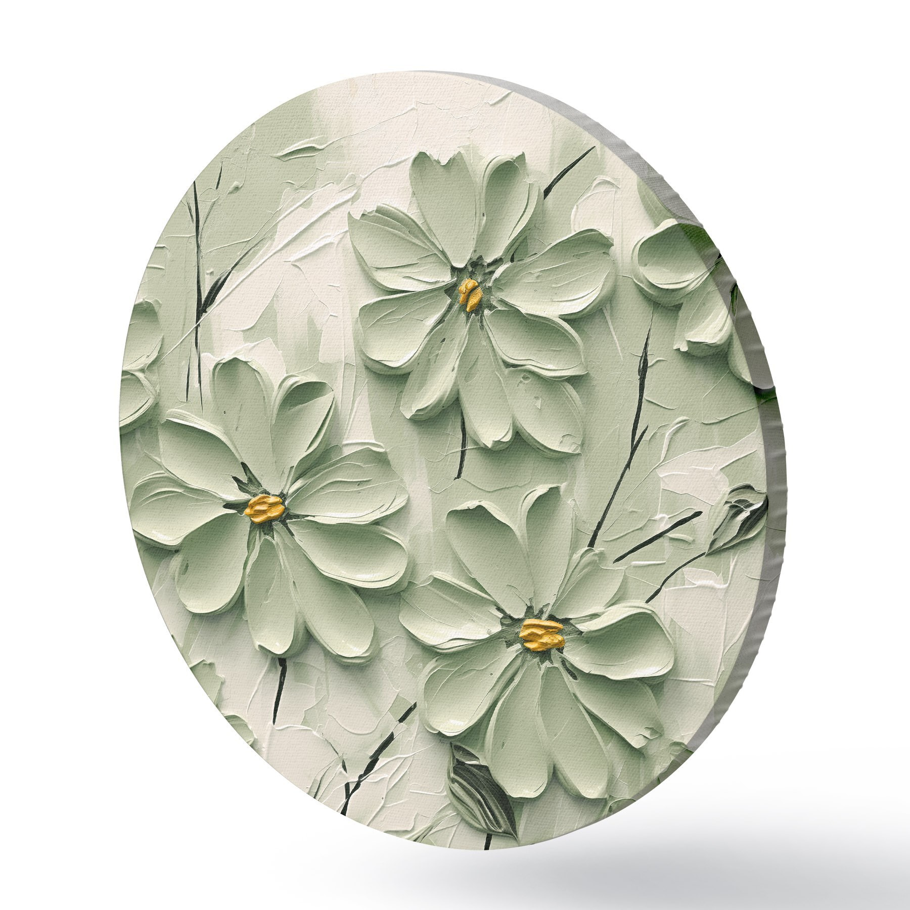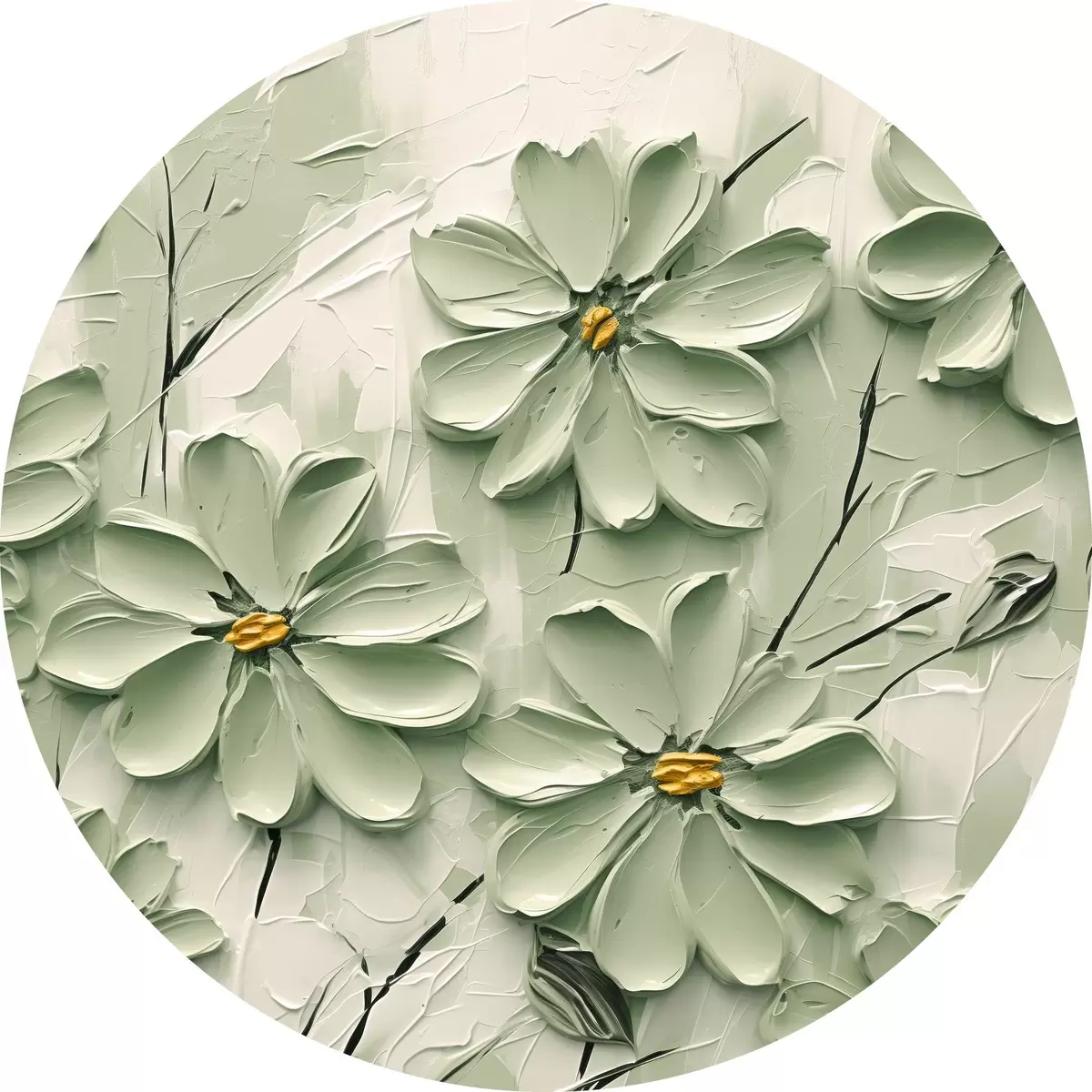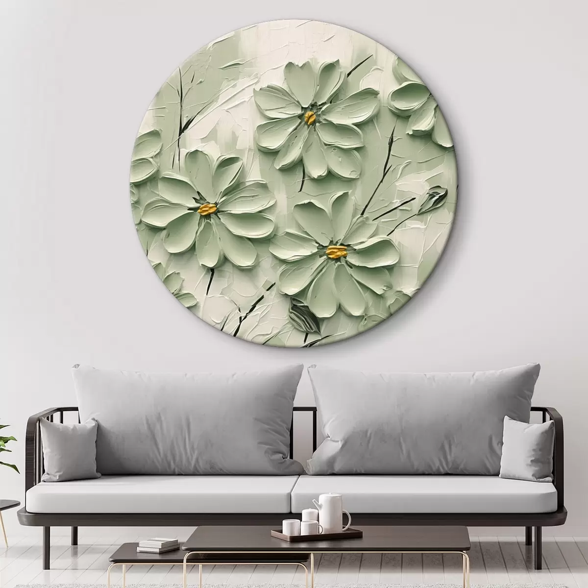 Picturi rotunde Flori verzi cu centre galbene pictate în tușe groase pe un fundal deschis Nr r45265