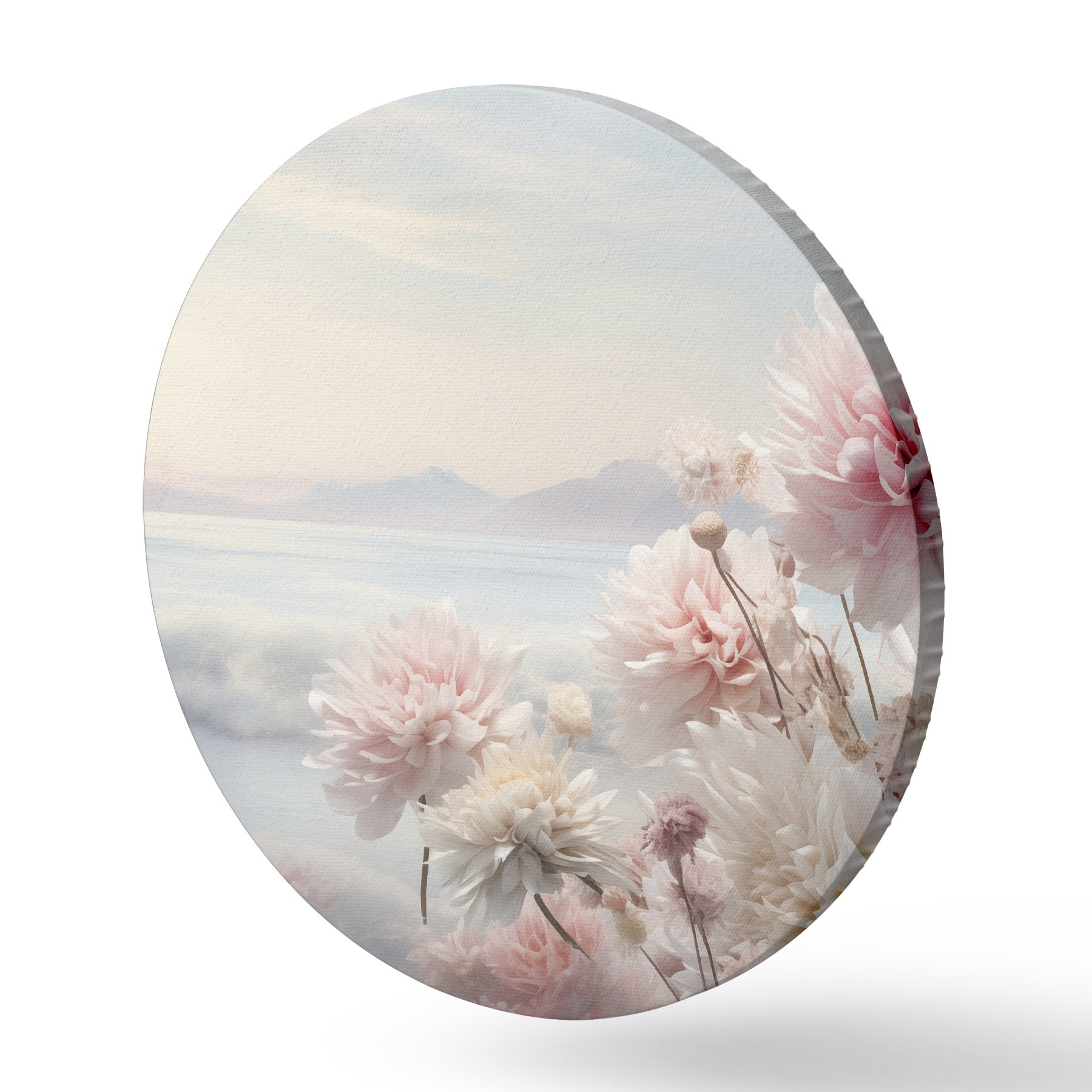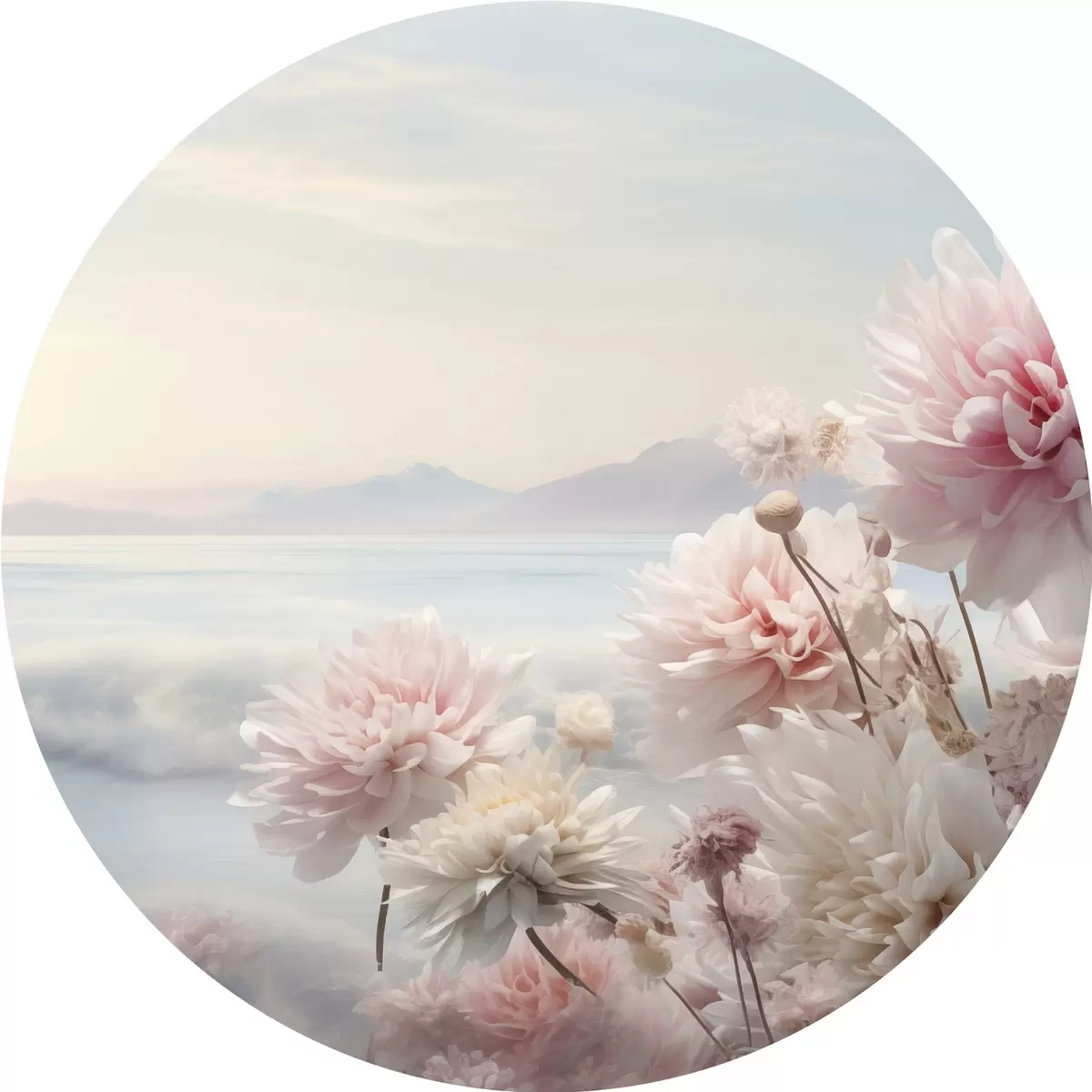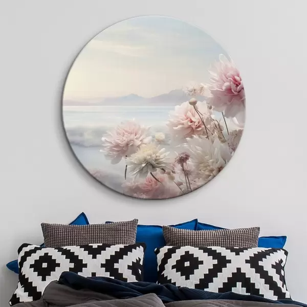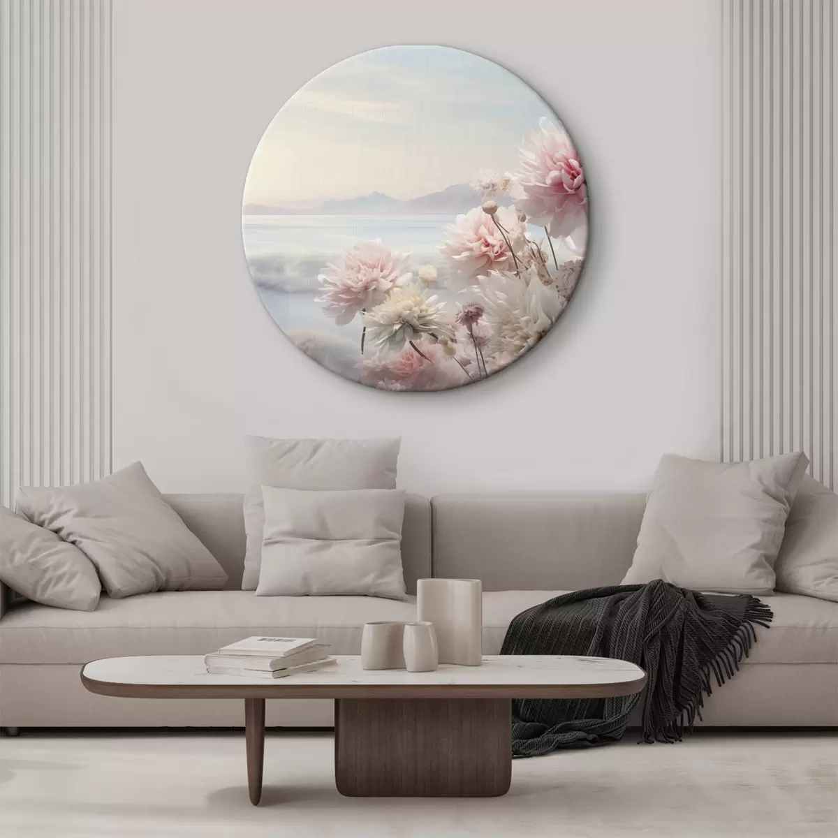 Picturi rotunde Delicate flori roz pe malul mării în zori Nr r45496