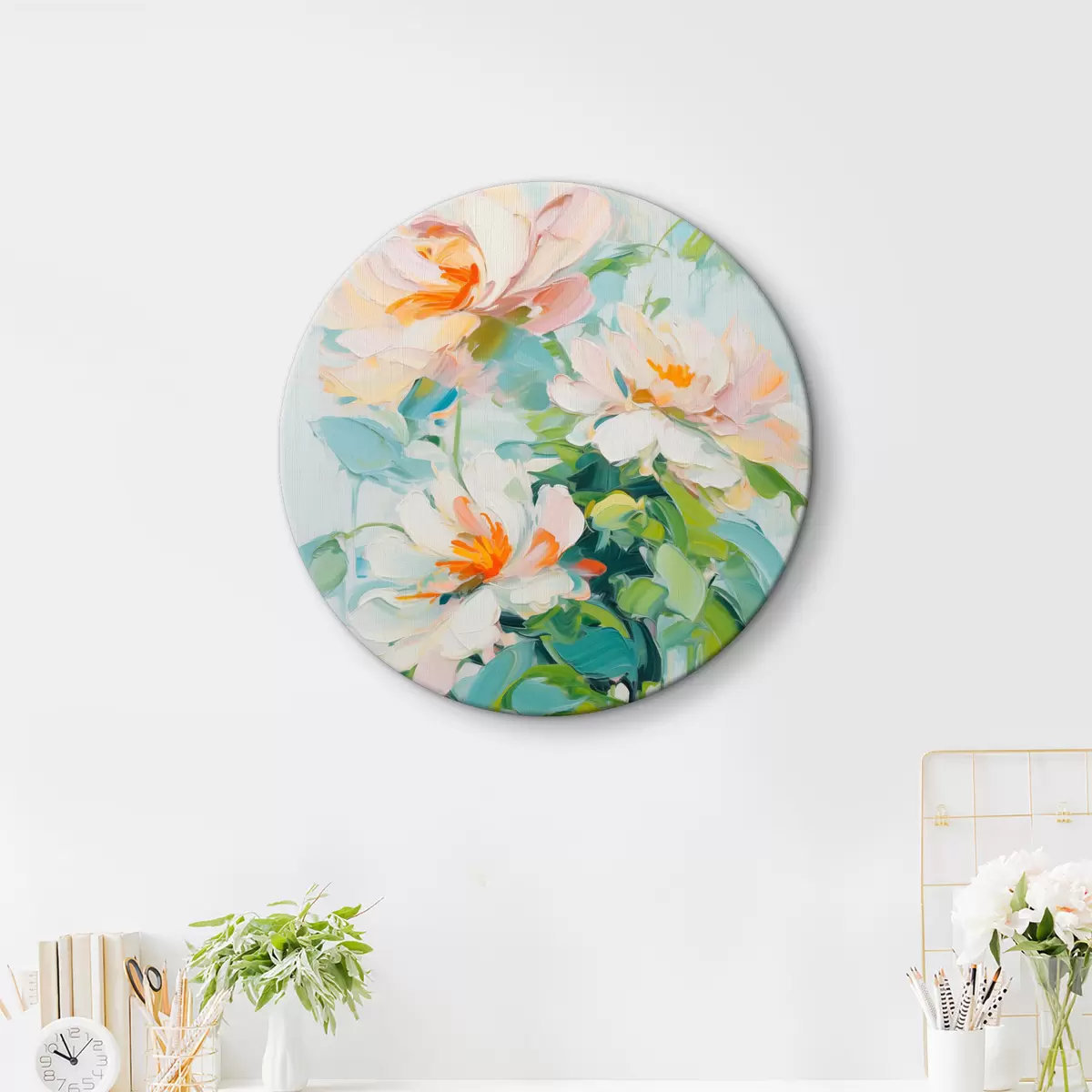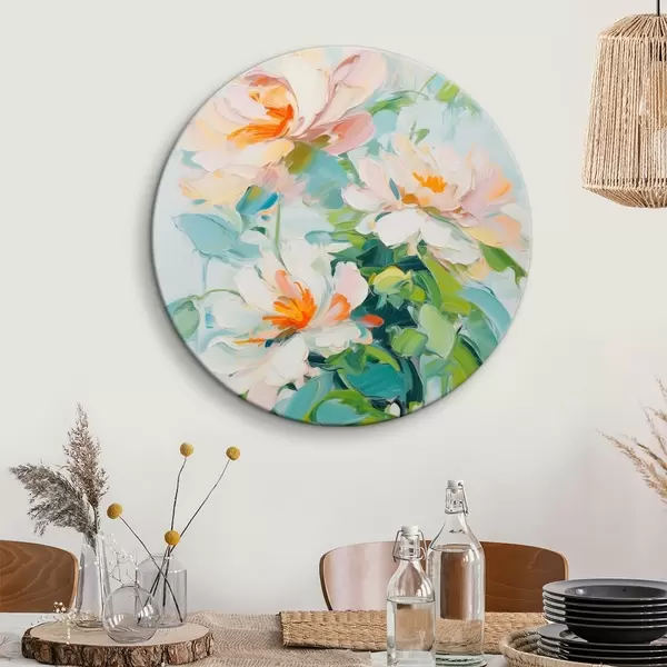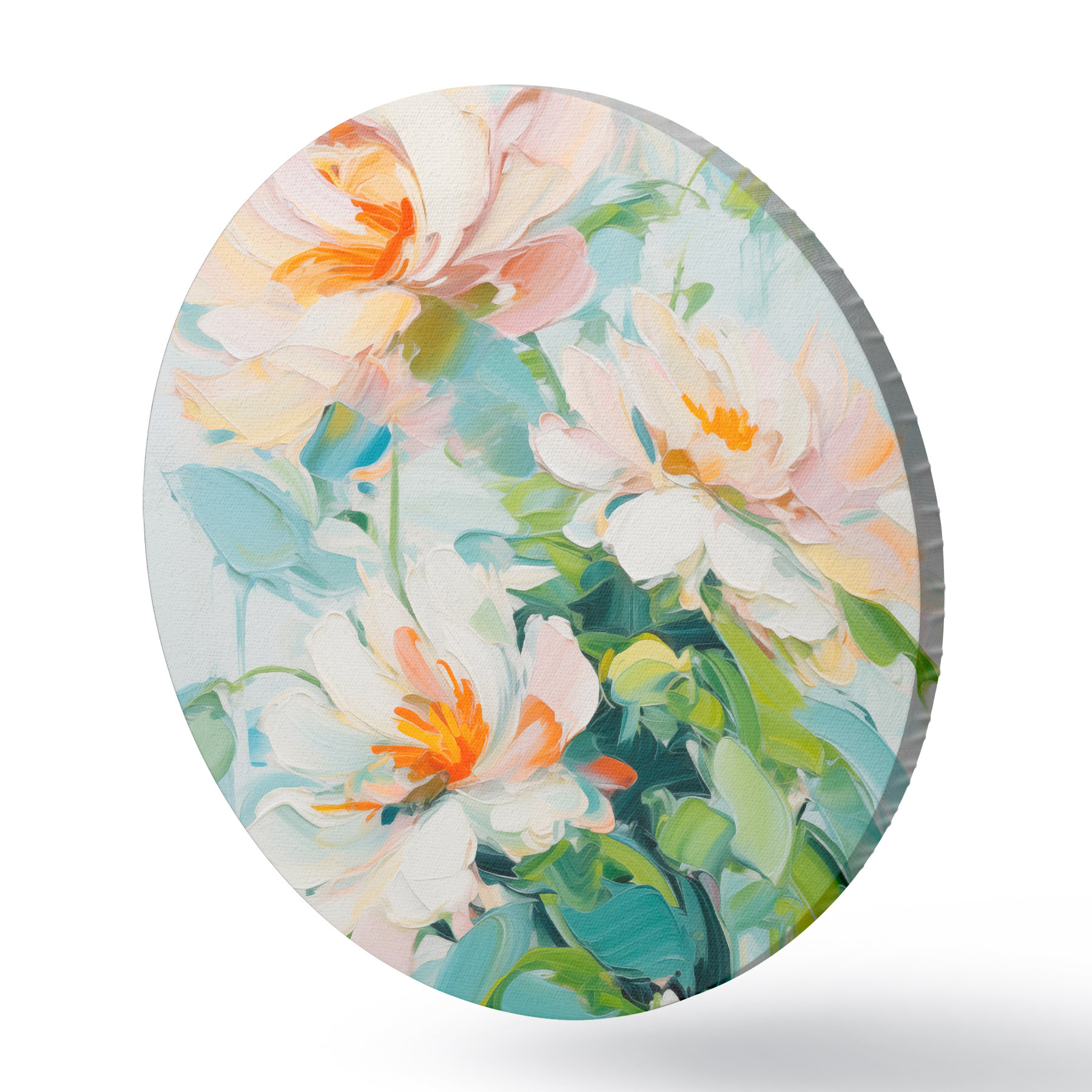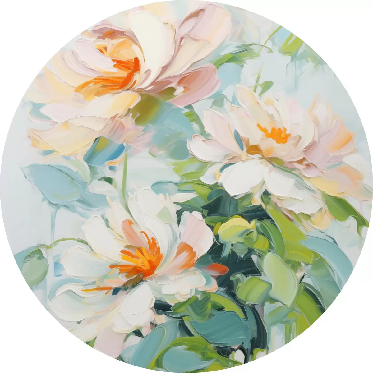 Picturi rotunde Flori de piersici albe și pastelate, frunze verzi, imitație de pictură în ulei cu tușe moi, fundal albastru deschis Nr r45550