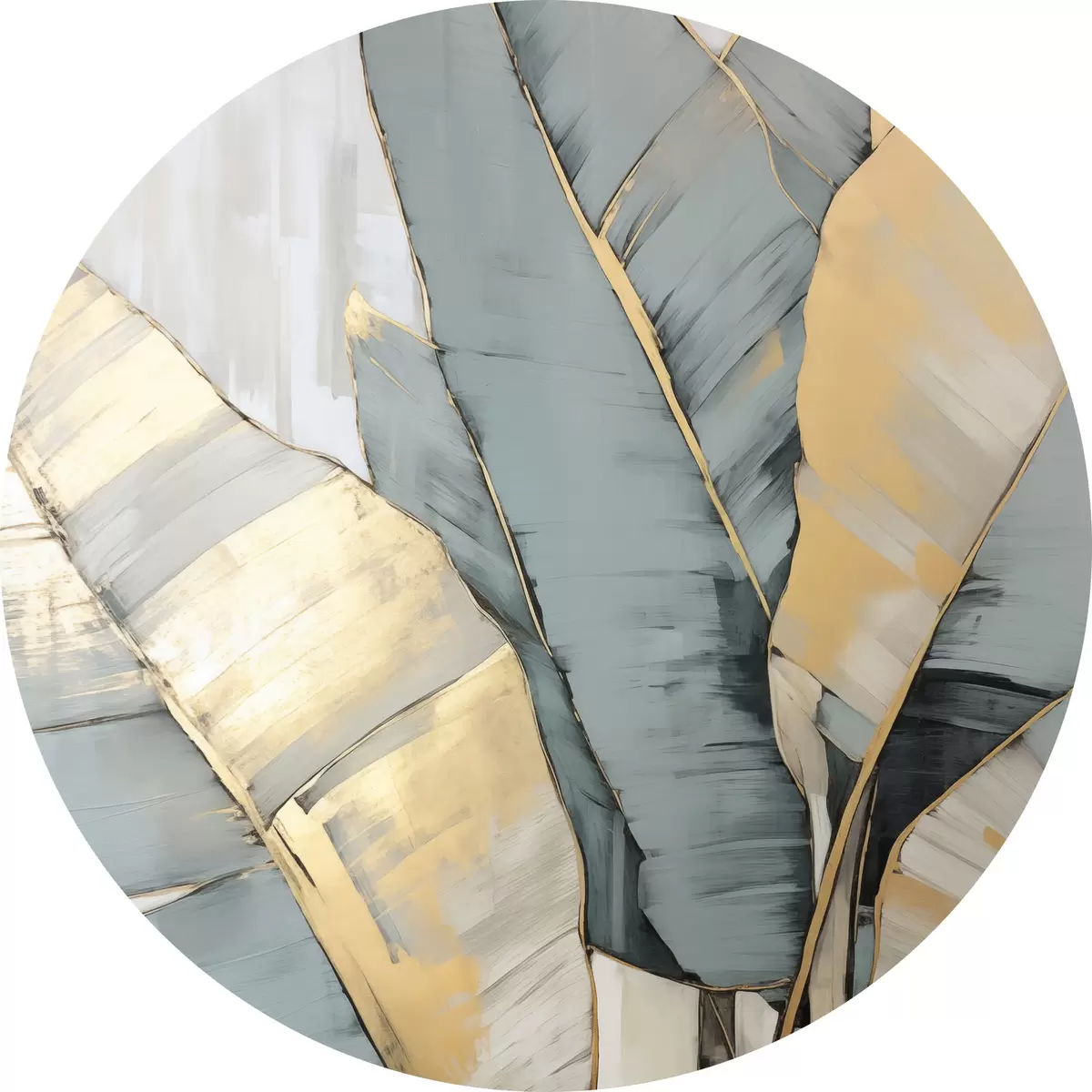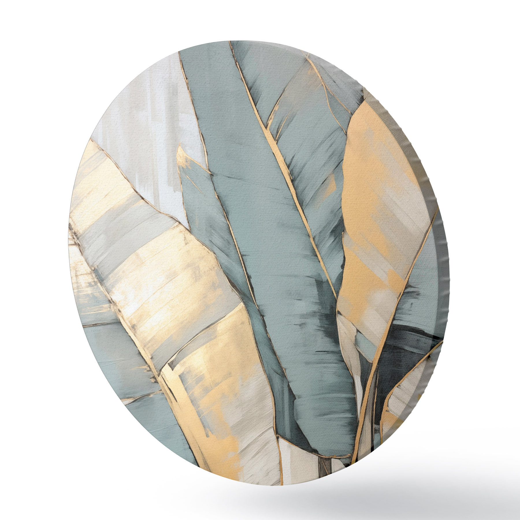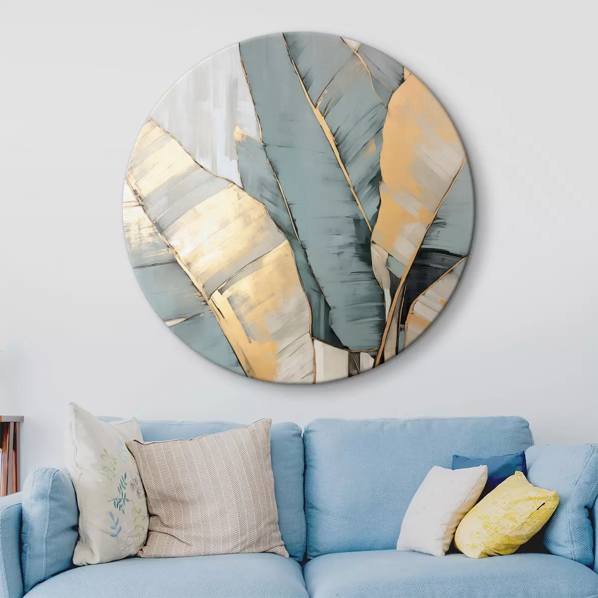 Picturi rotunde Frunze de banane albastre, gri și galbene cu tușe de pensulă vizibile, pe un fundal alb abstract r45552