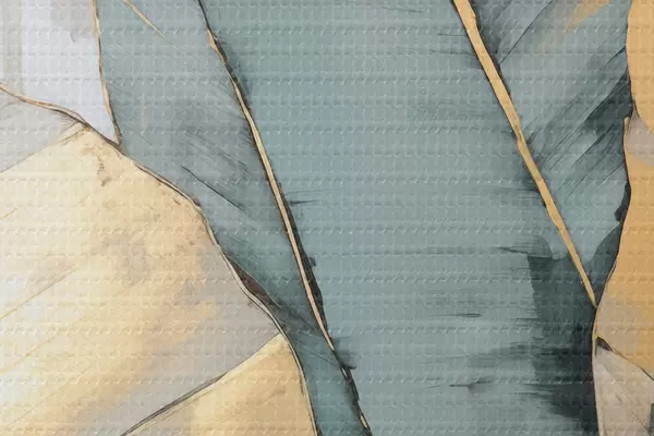Picturi rotunde Frunze de banane albastre, gri și galbene cu tușe de pensulă vizibile, pe un fundal alb abstract r45552