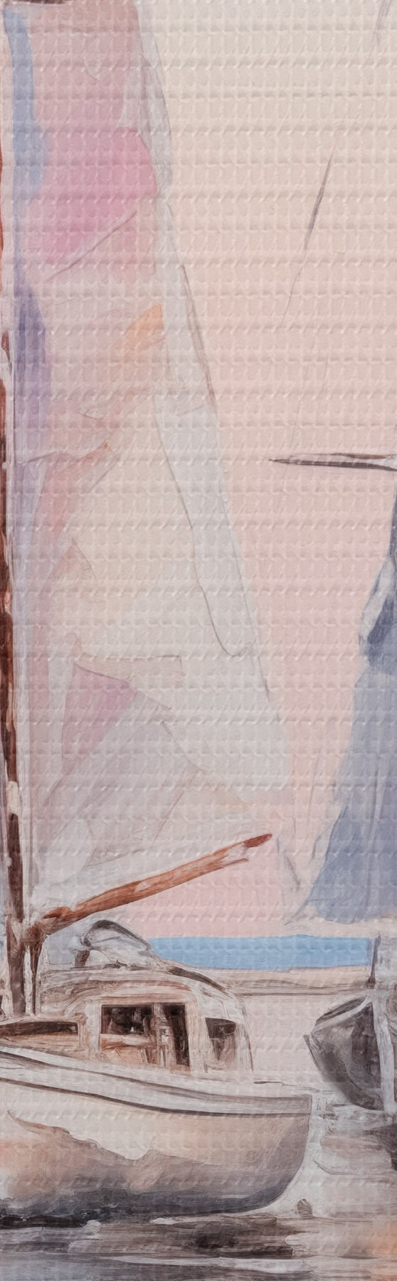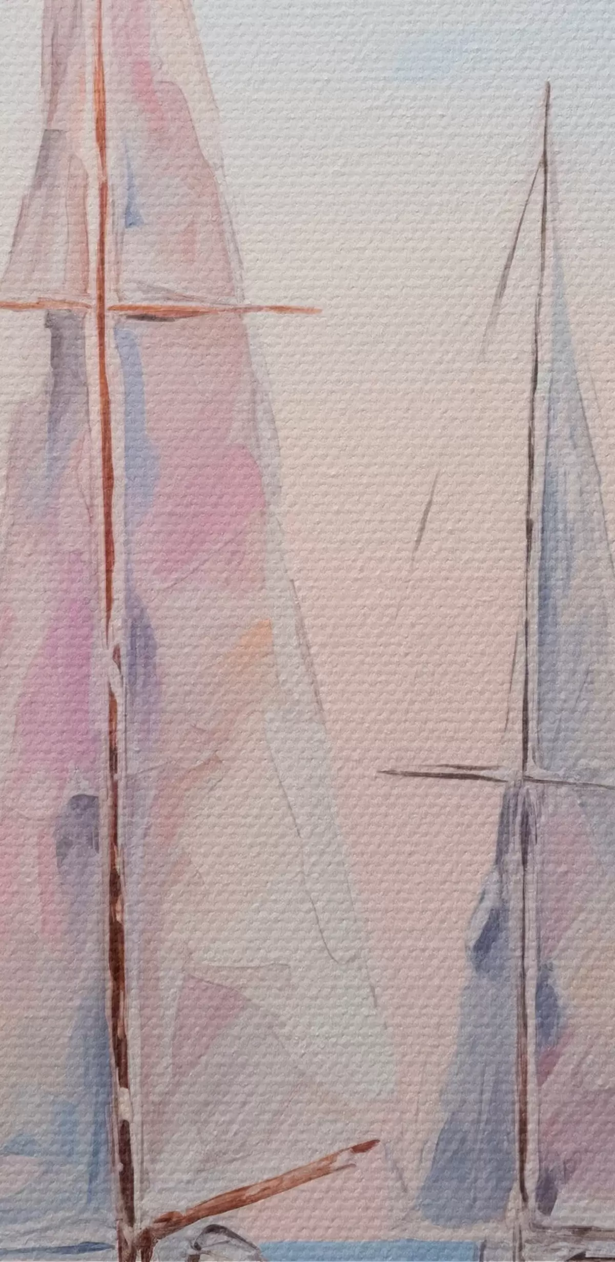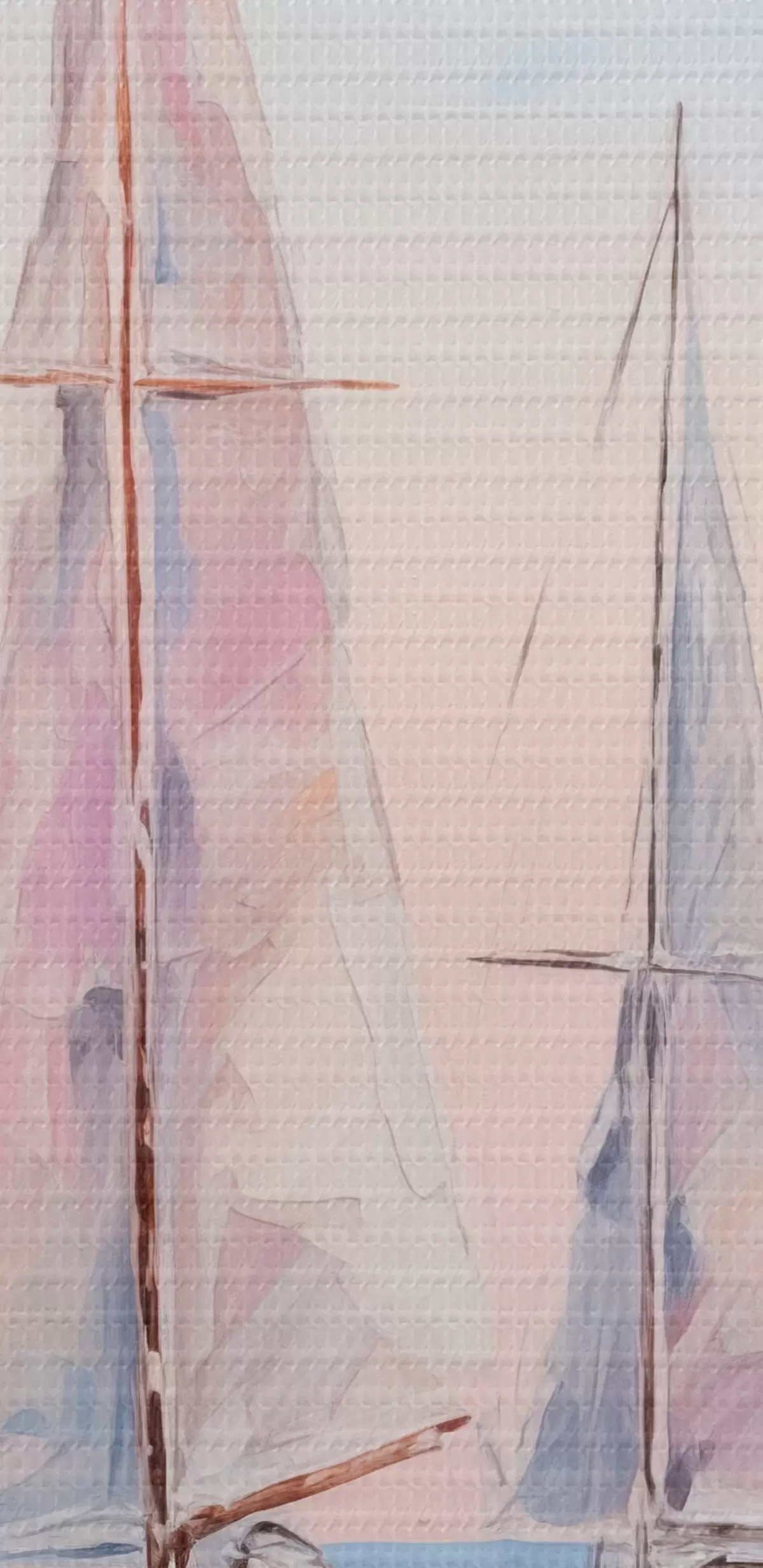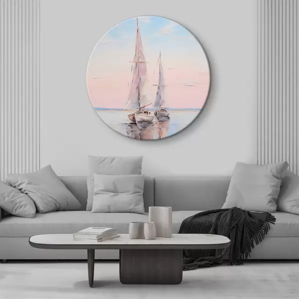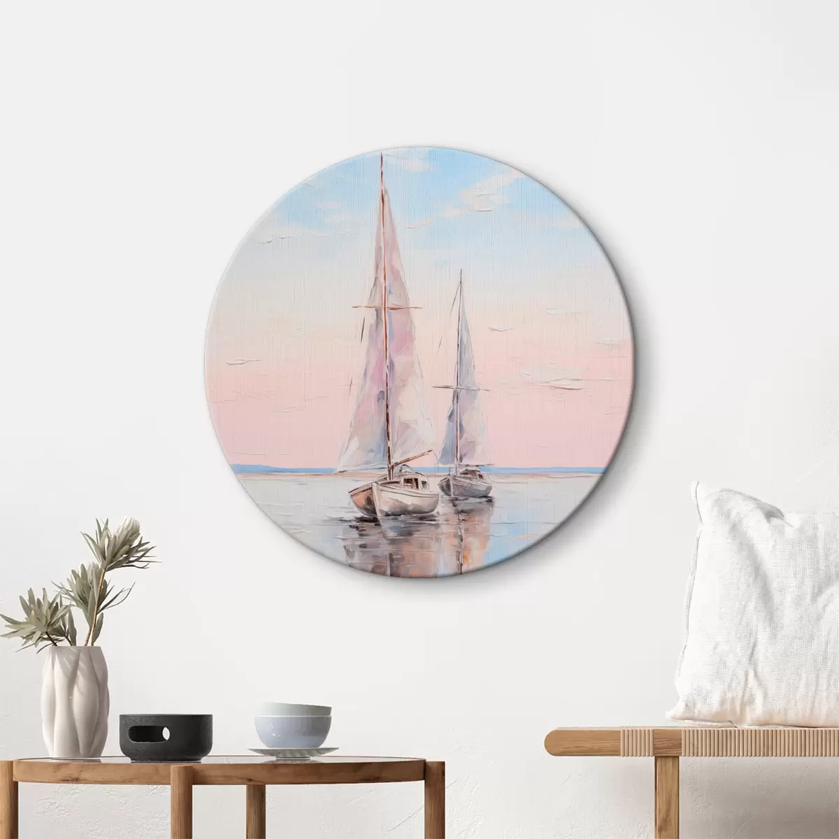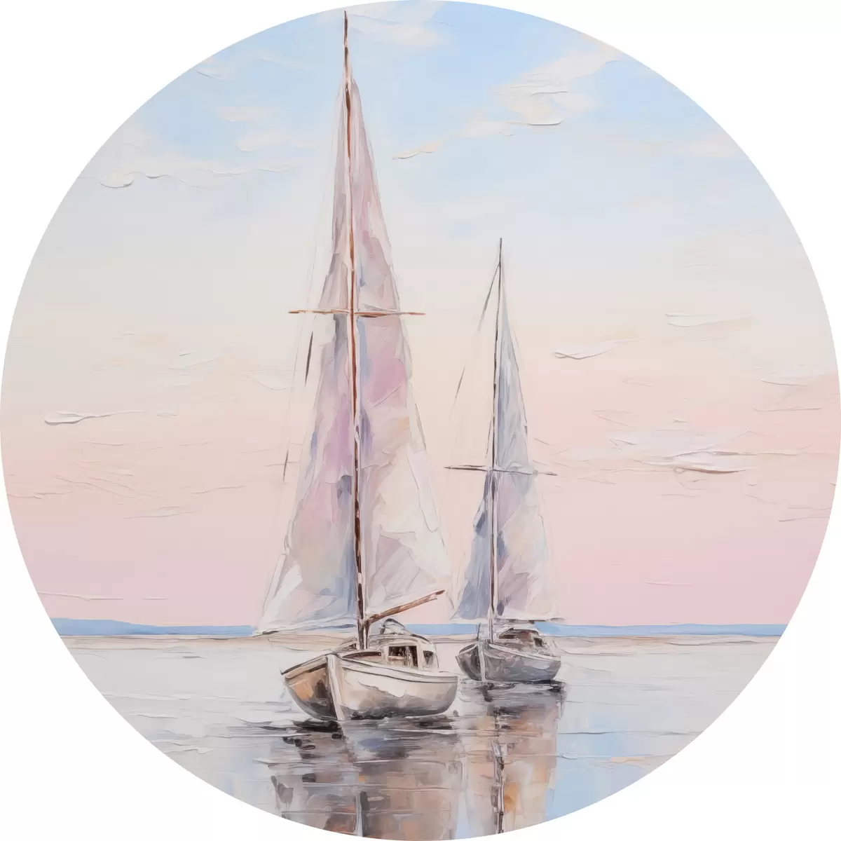 Picturi rotunde Bărci cu vele roz plutind pe o mare calmă, reflecții ale bărcilor în apă, culori pastelate moi Nr r45558