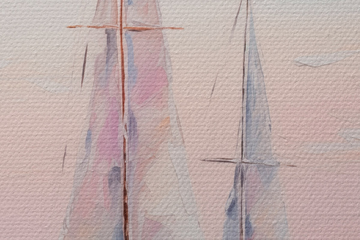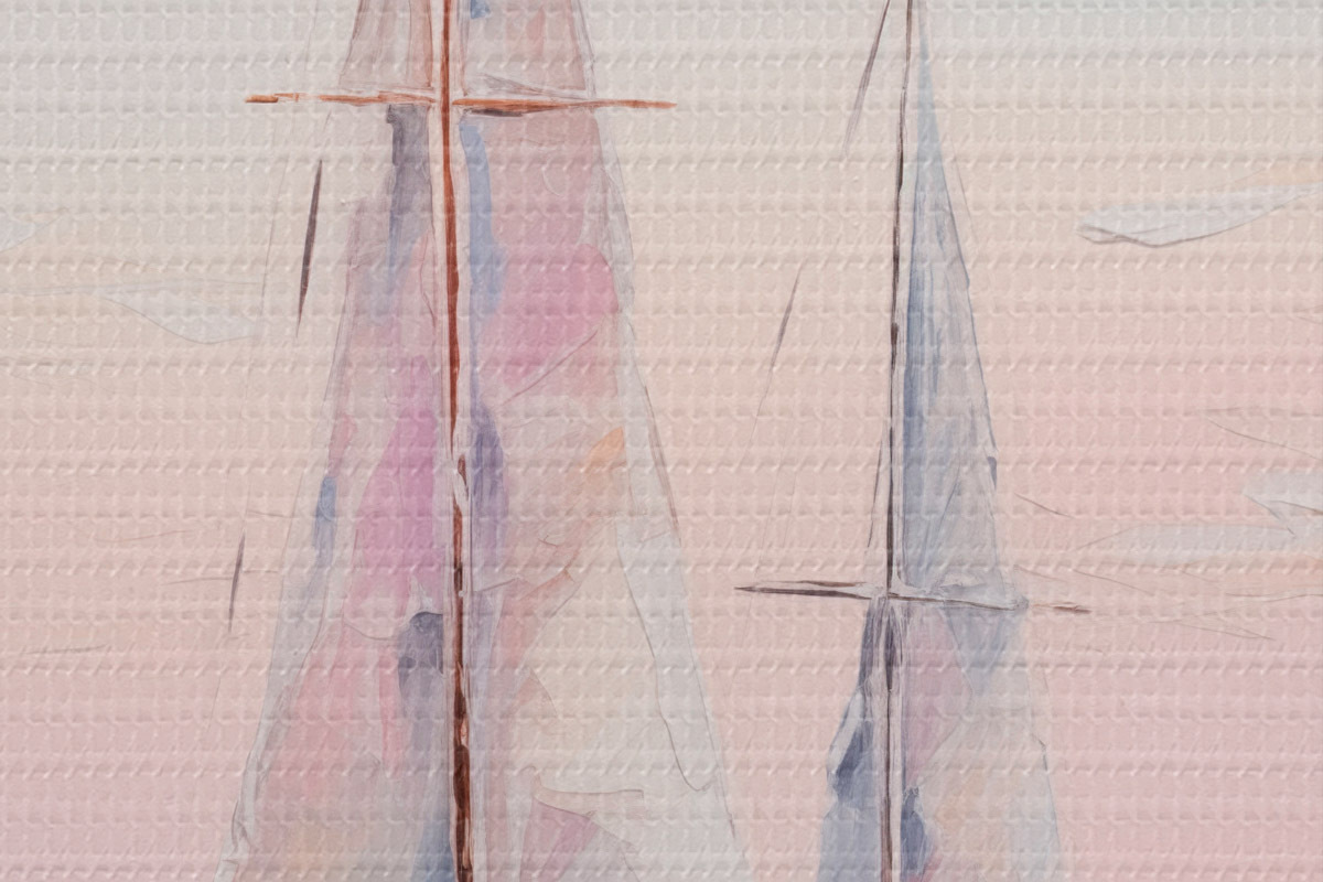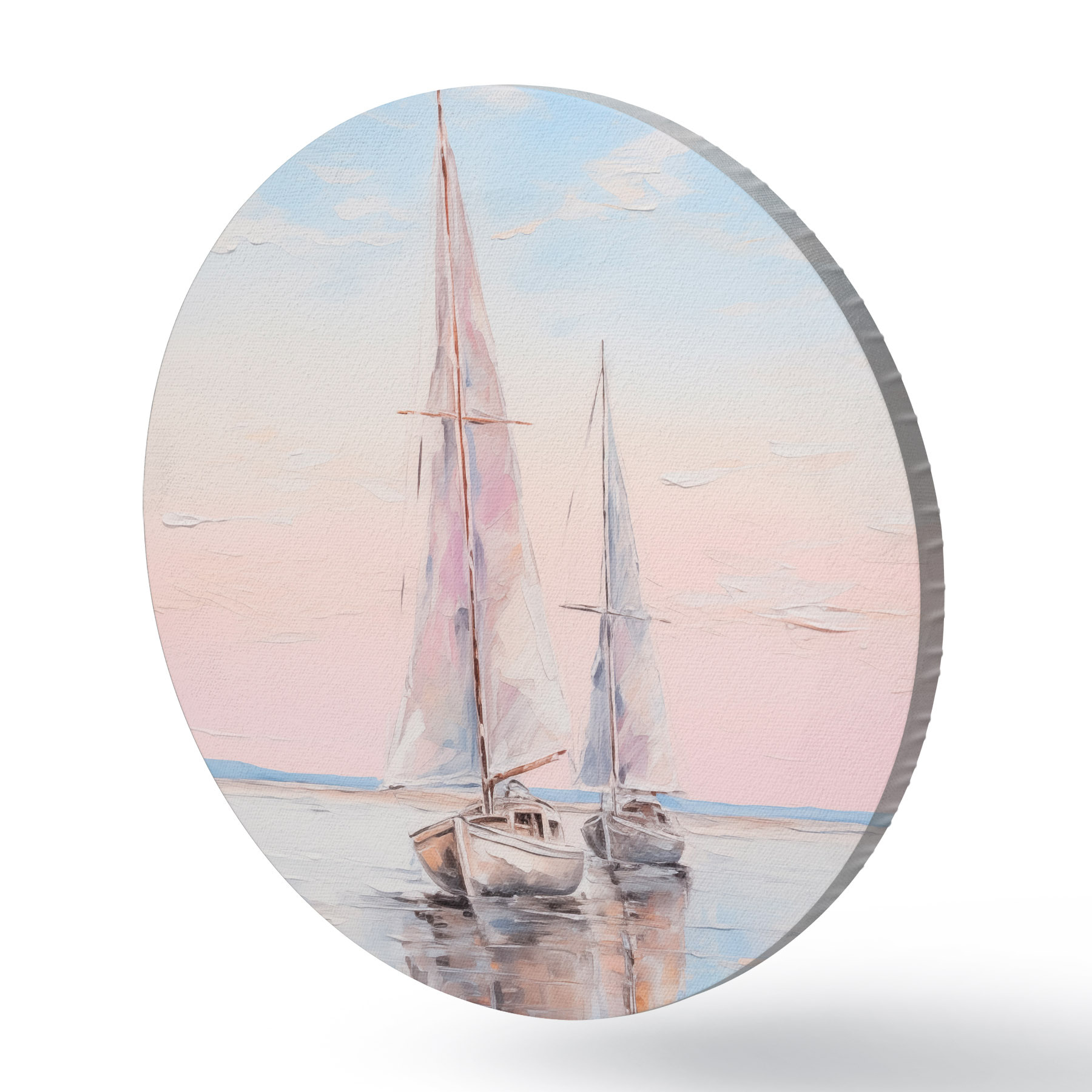 Picturi rotunde Bărci cu vele roz plutind pe o mare calmă, reflecții ale bărcilor în apă, culori pastelate moi r45558