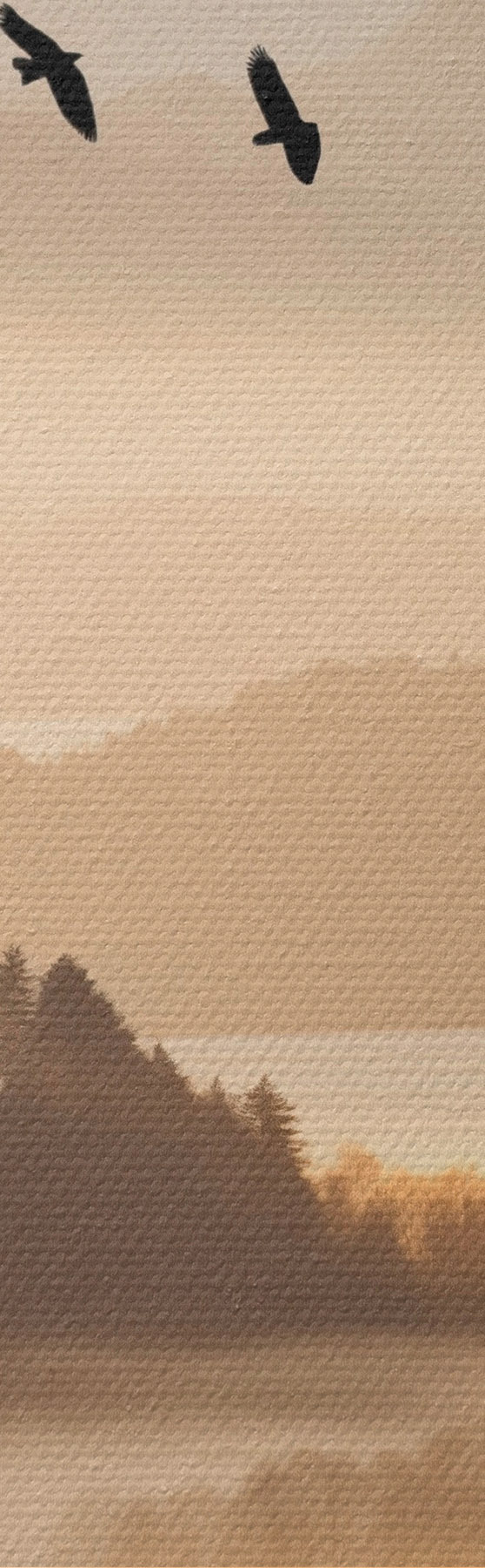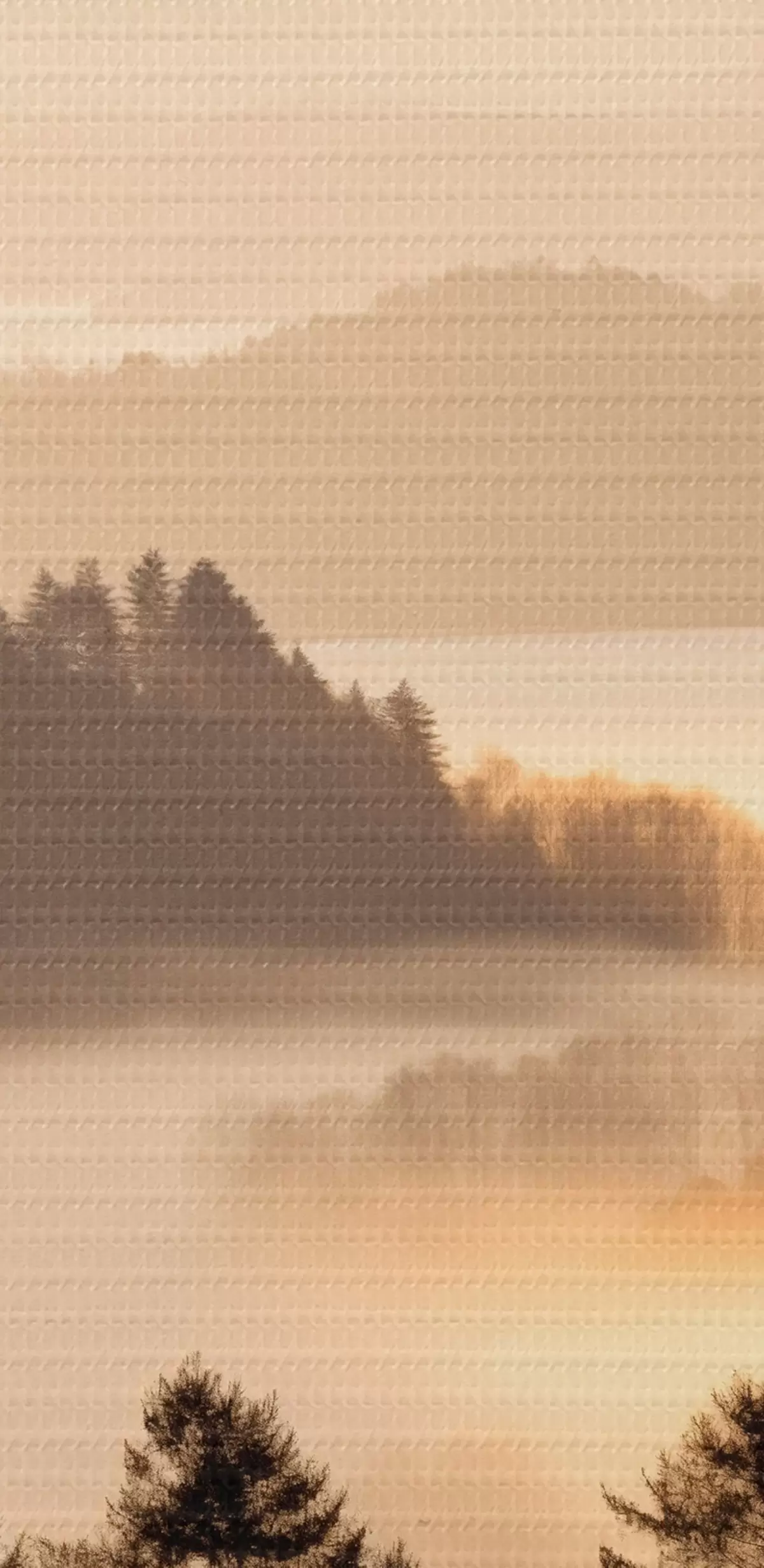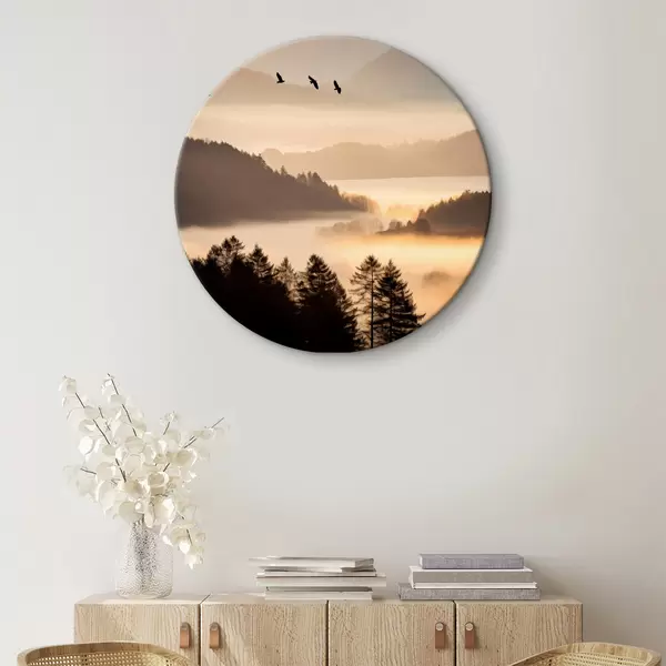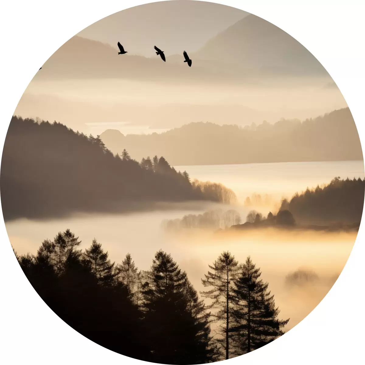 Picturi rotunde Un peisaj montan cu o pădure și păsări care zboară pe cer , toate acoperite de un strat gros de ceață în timpul răsăritului Nr r45564