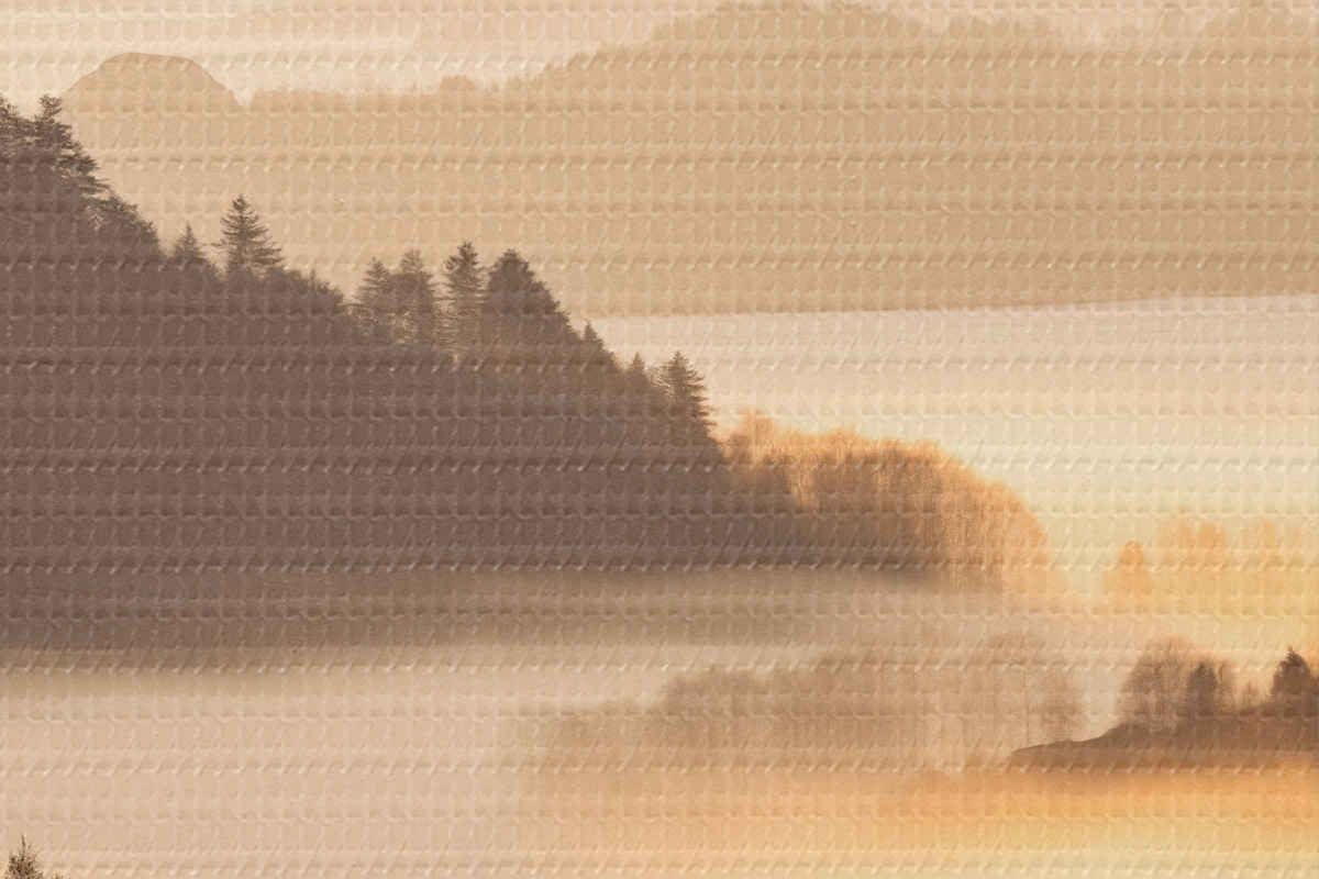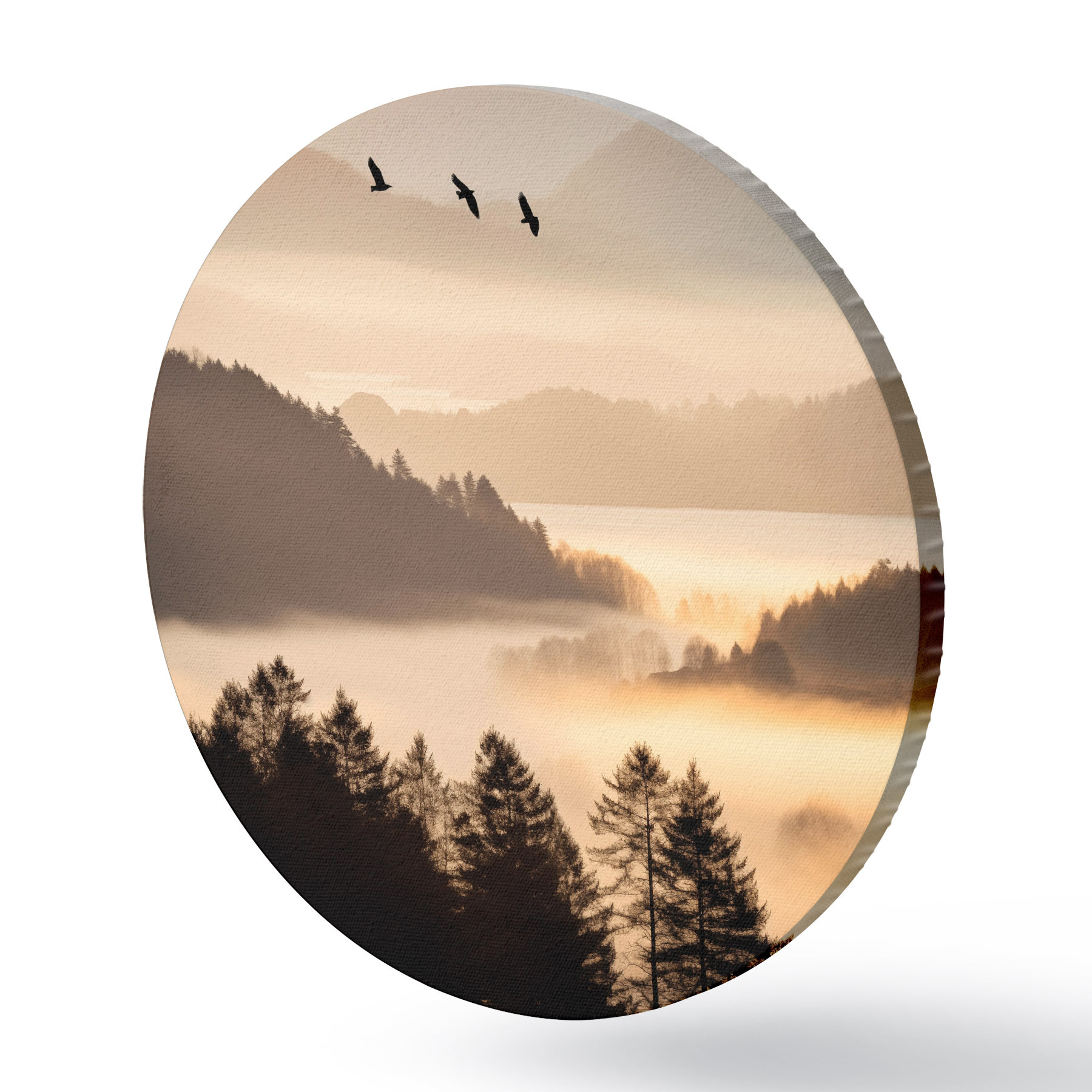 Picturi rotunde Un peisaj montan cu o pădure și păsări care zboară pe cer , toate acoperite de un strat gros de ceață în timpul răsăritului r45564