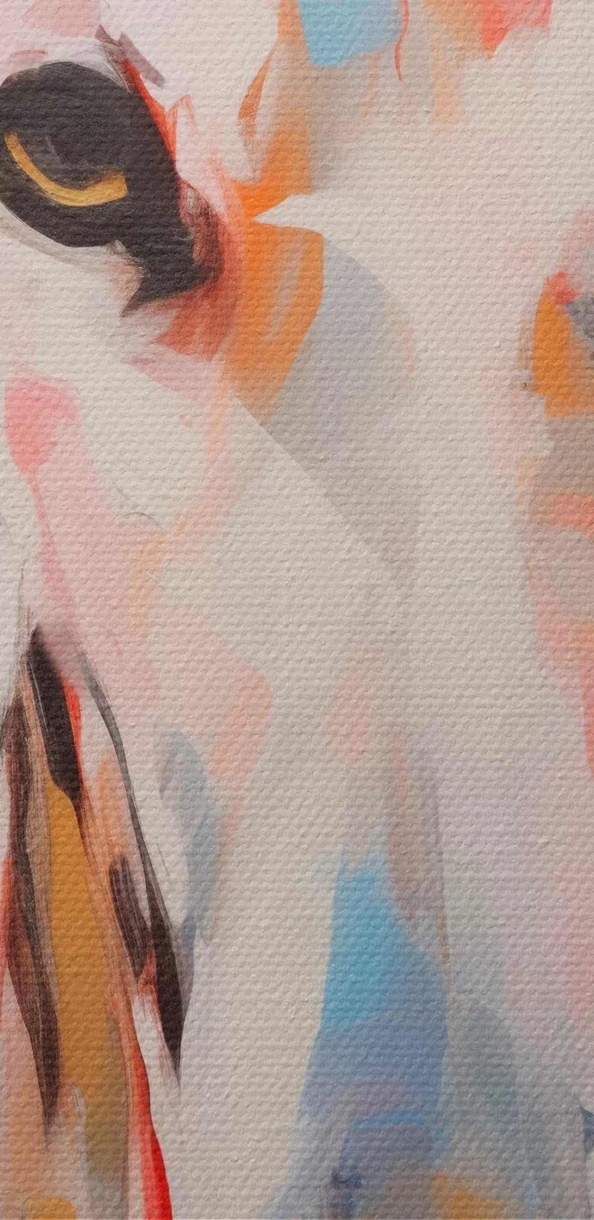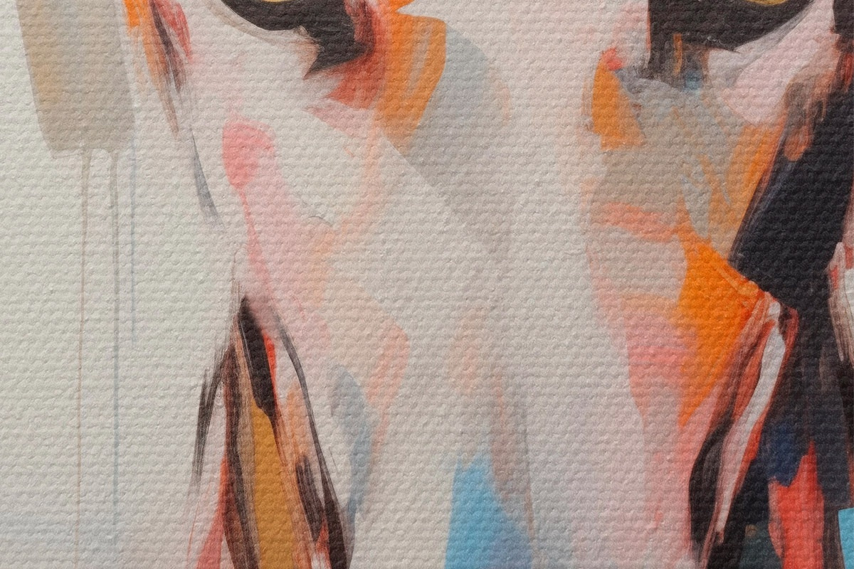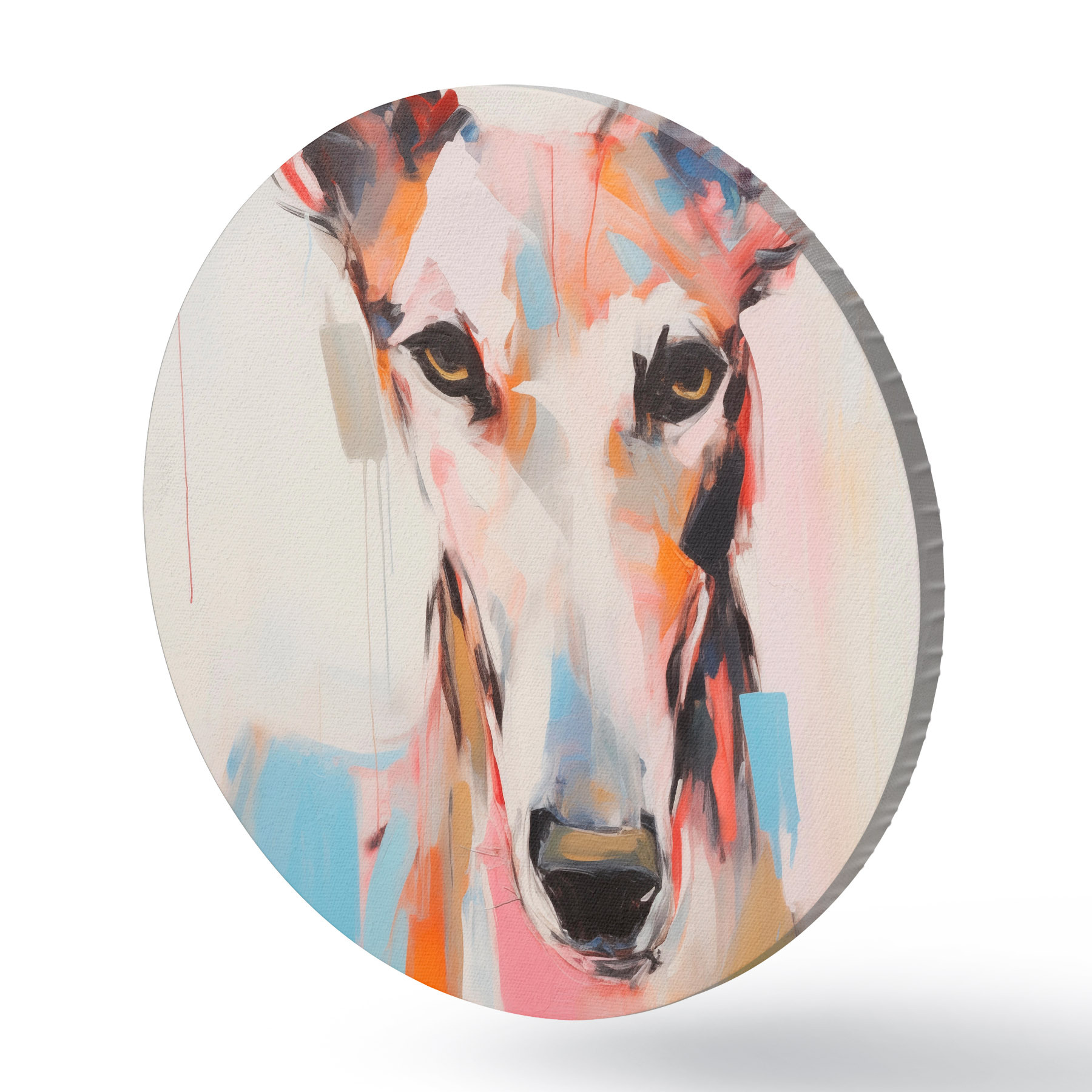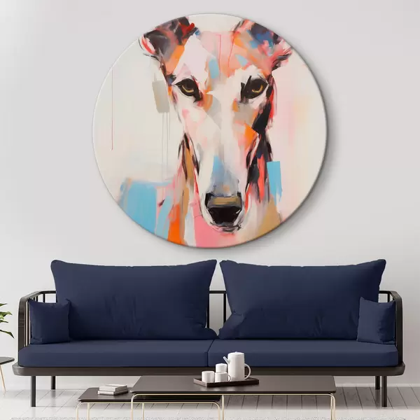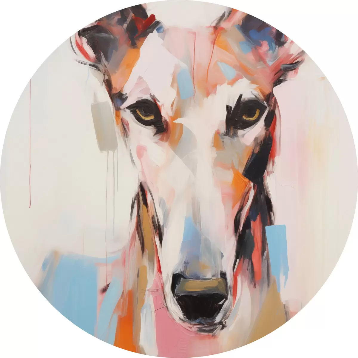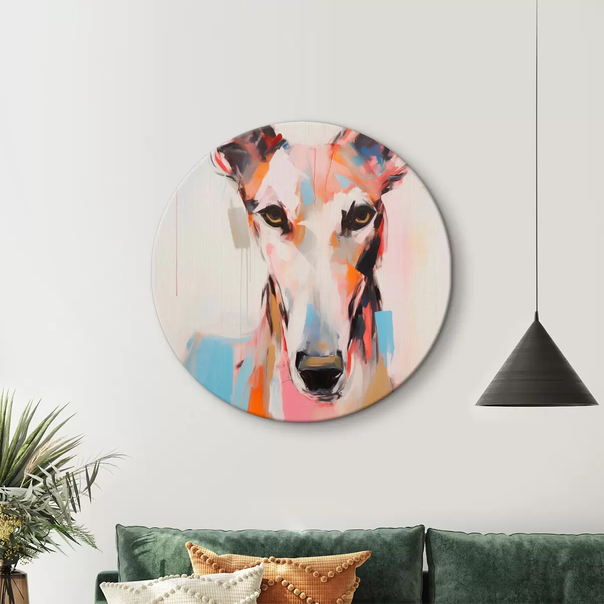 Picturi rotunde Un câine greyhound, pictat cu culori vibrante precum portocaliu, roz și albastru, pe un fundal alb simplu Nr r45565