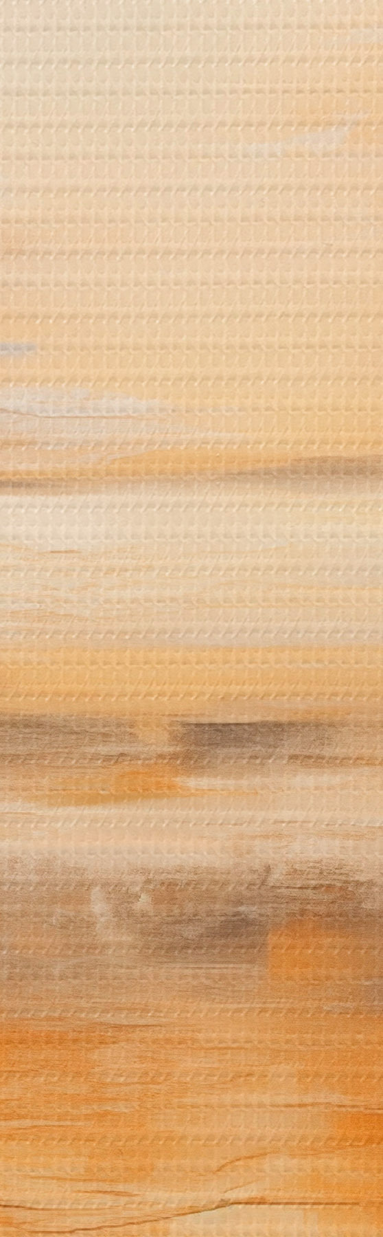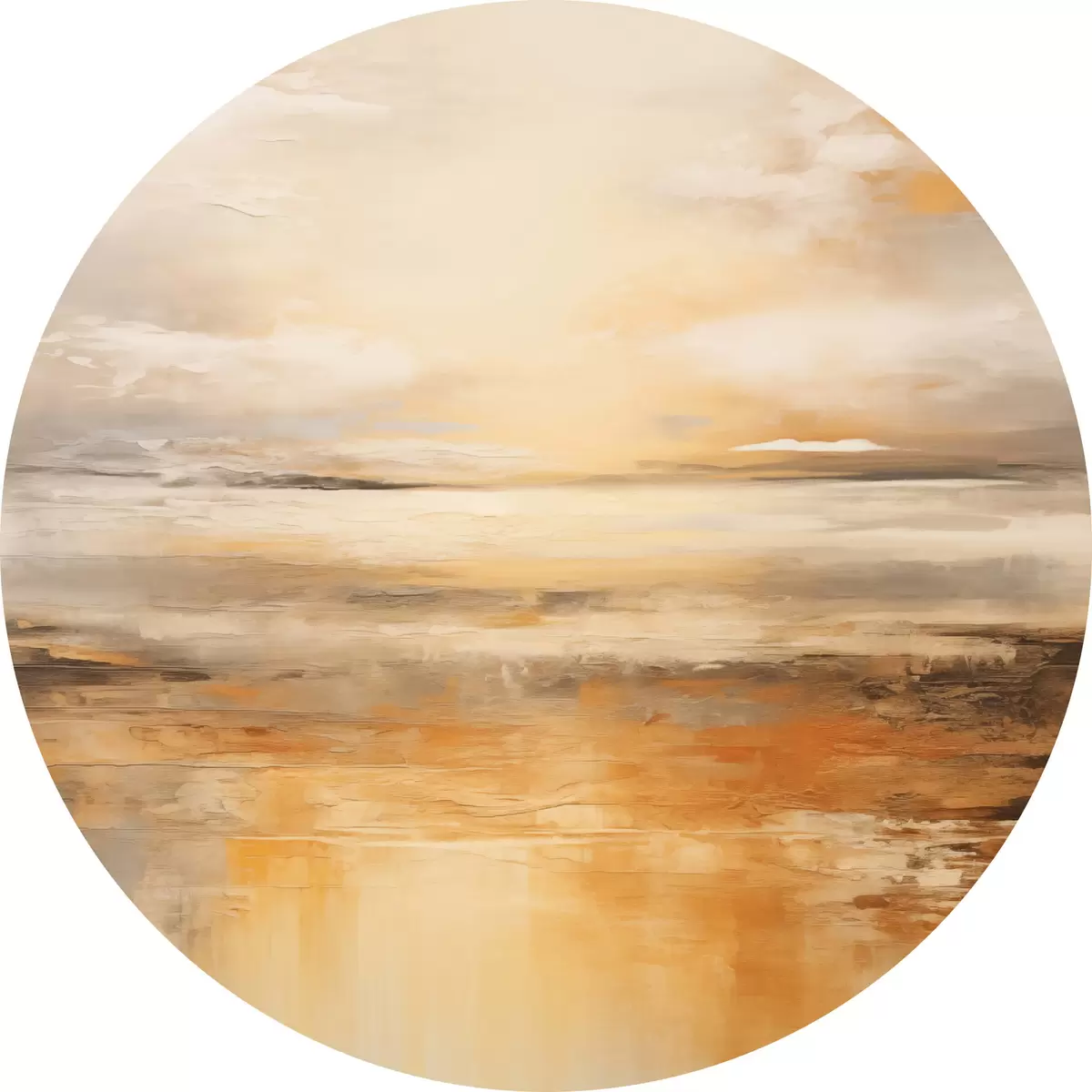 Picturi rotunde O pictură abstractă a unui peisaj de plajă cu un ocean calm, nisip portocaliu și un cer noros cu soare r45567