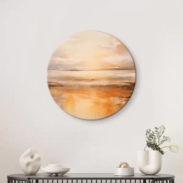 Picturi rotunde O pictură abstractă a unui peisaj de plajă cu un ocean calm, nisip portocaliu și un cer noros cu soare r45567