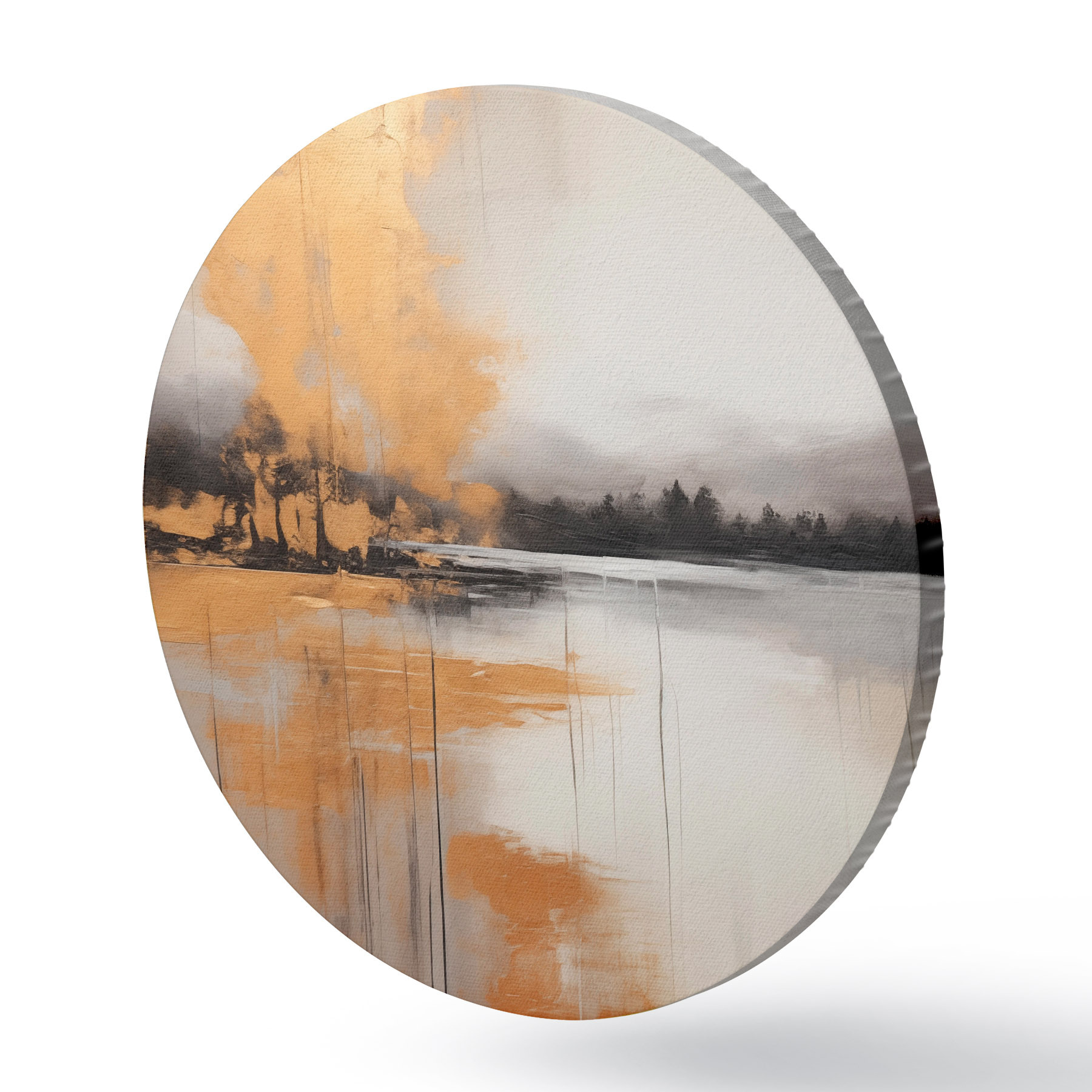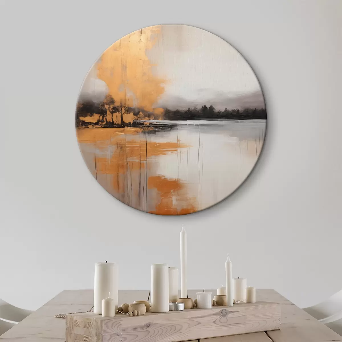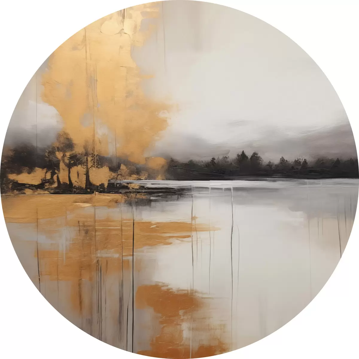 Picturi rotunde Un peisaj abstract cu un lac, copac și ceață galbenă , apa reflectă și cerul înnorat Nr r45575