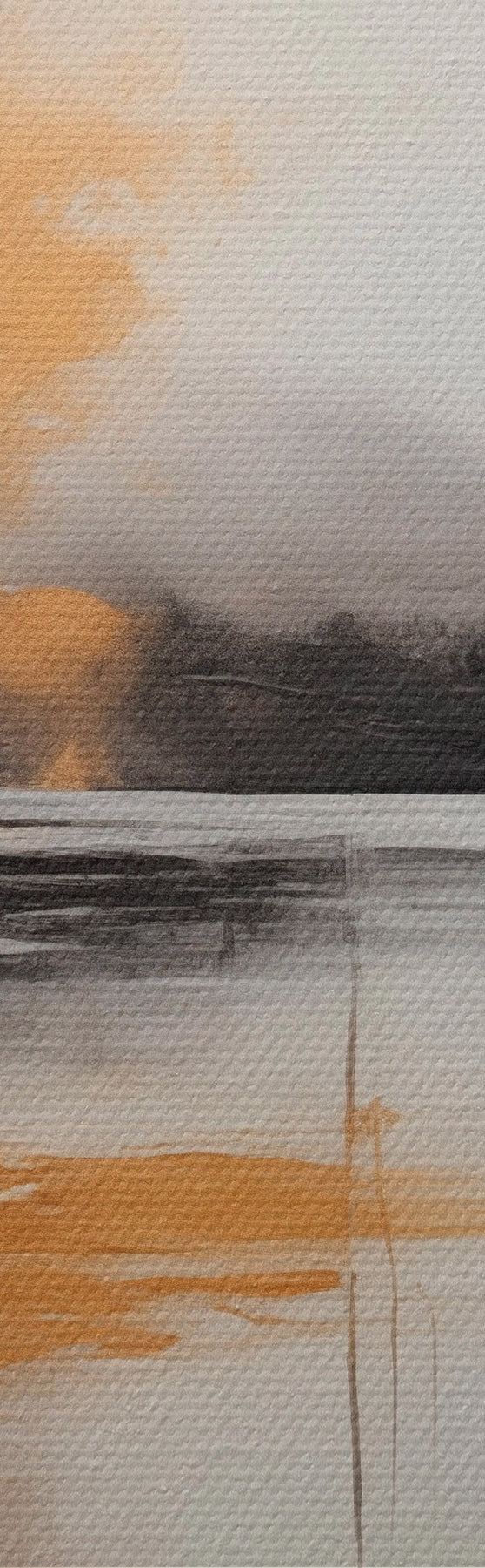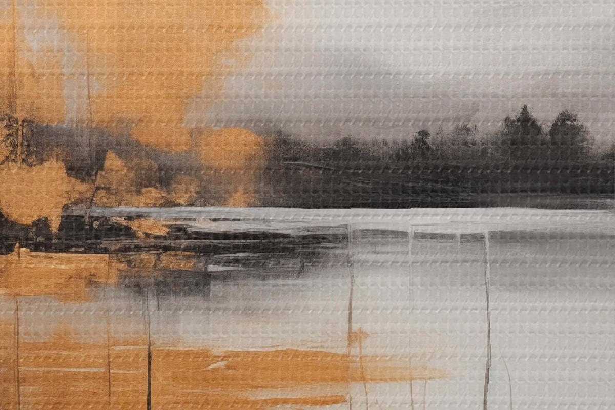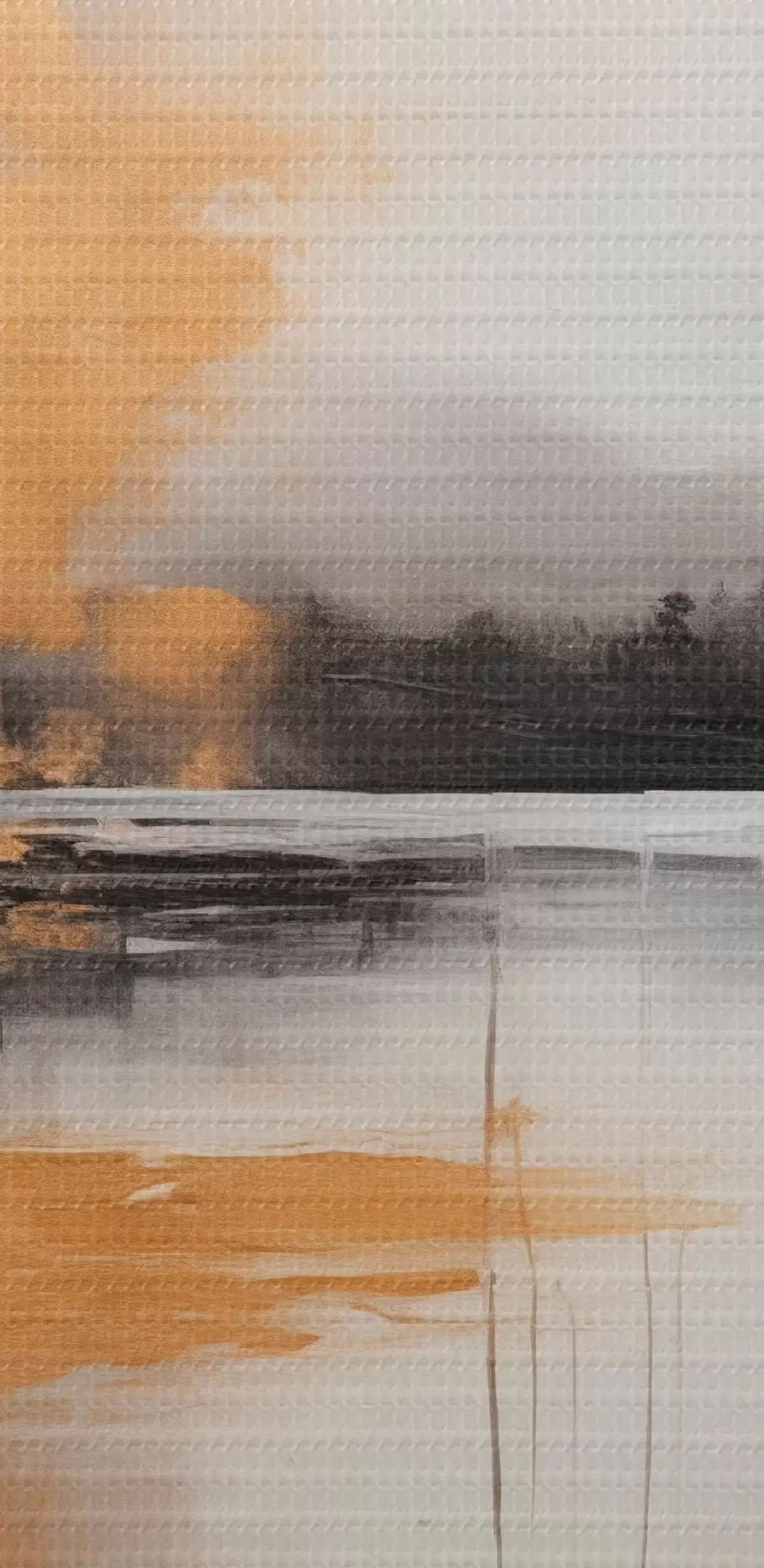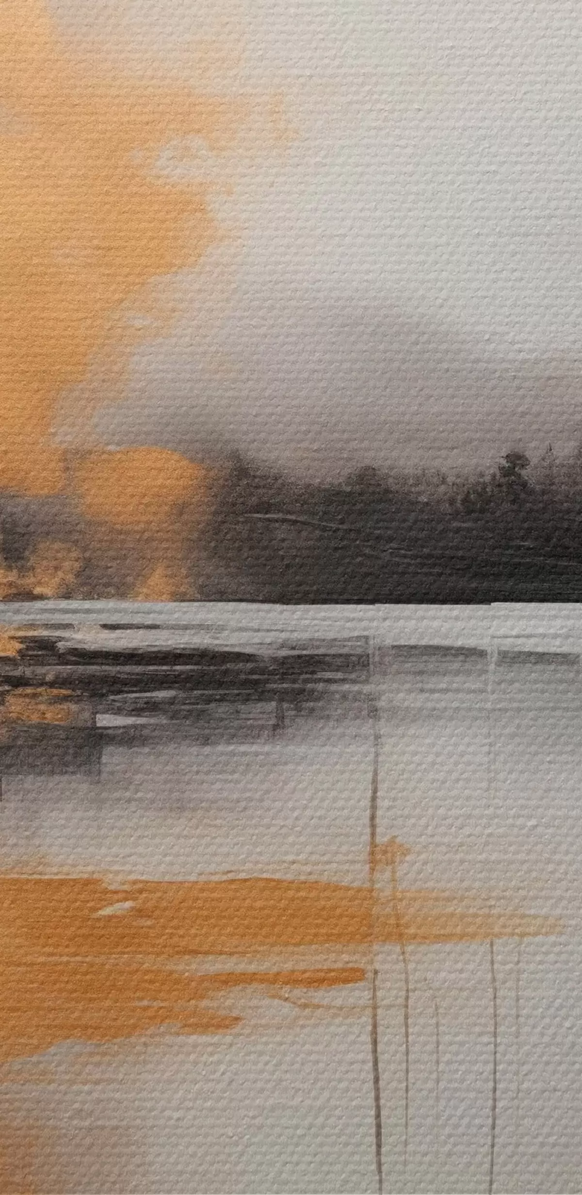 Picturi rotunde Un peisaj abstract cu un lac, copac și ceață galbenă , apa reflectă și cerul înnorat Nr r45575