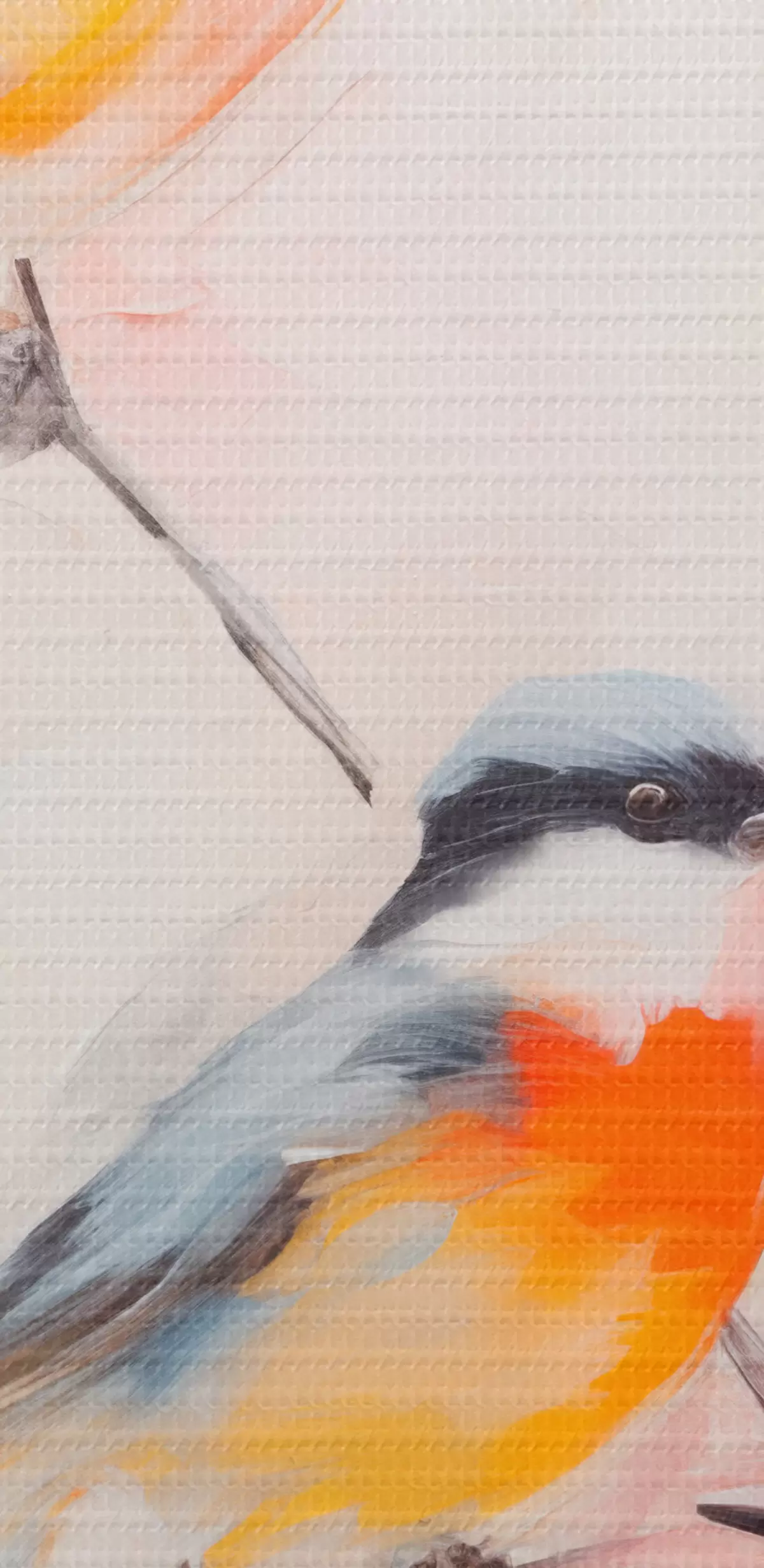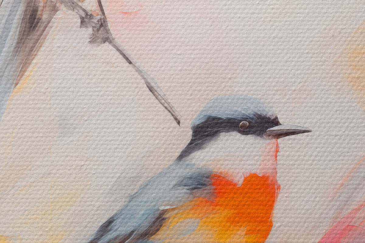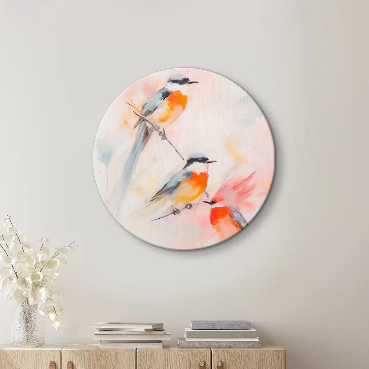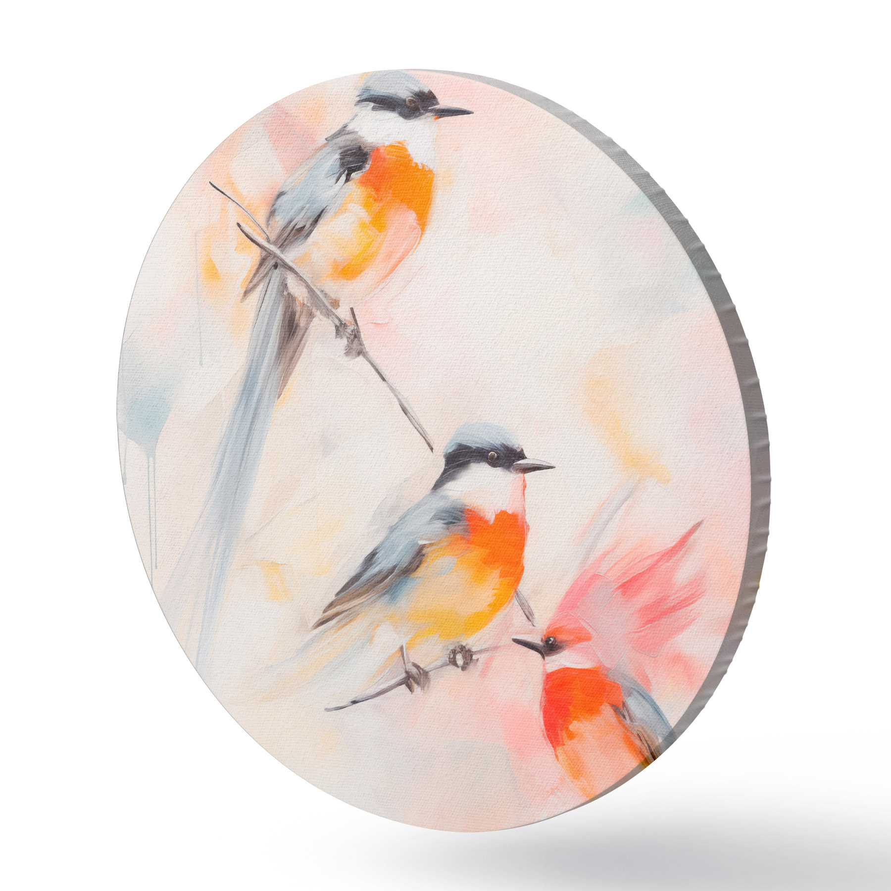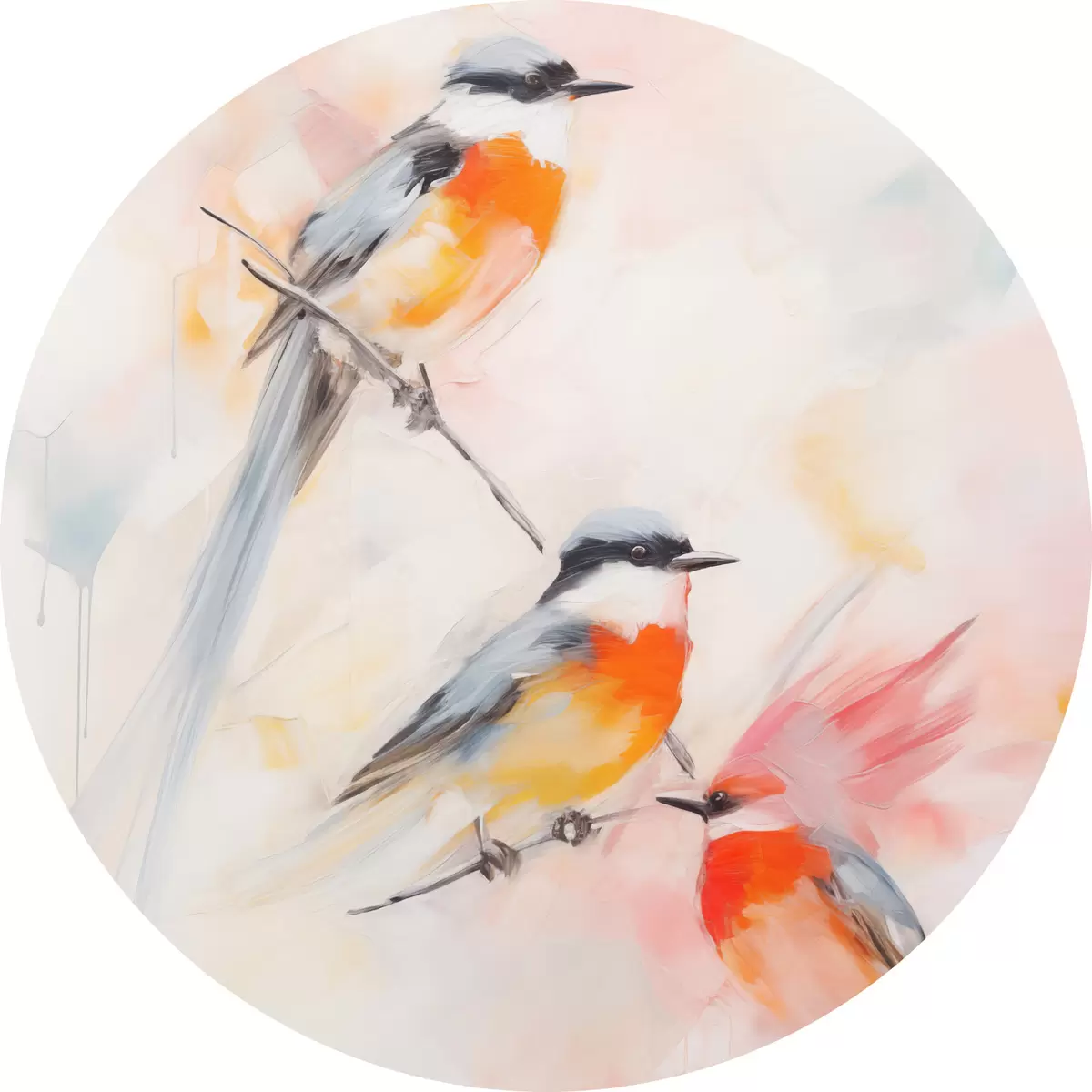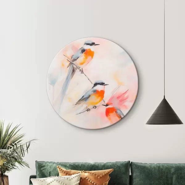 Picturi rotunde Păsări cocoțate pe ramuri, culori pastelate moi, fundal deschis cu nuanțe de roz și alb Nr r45577