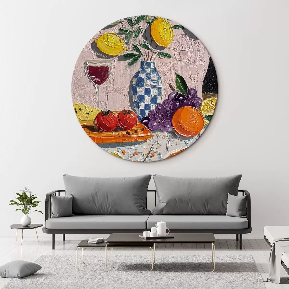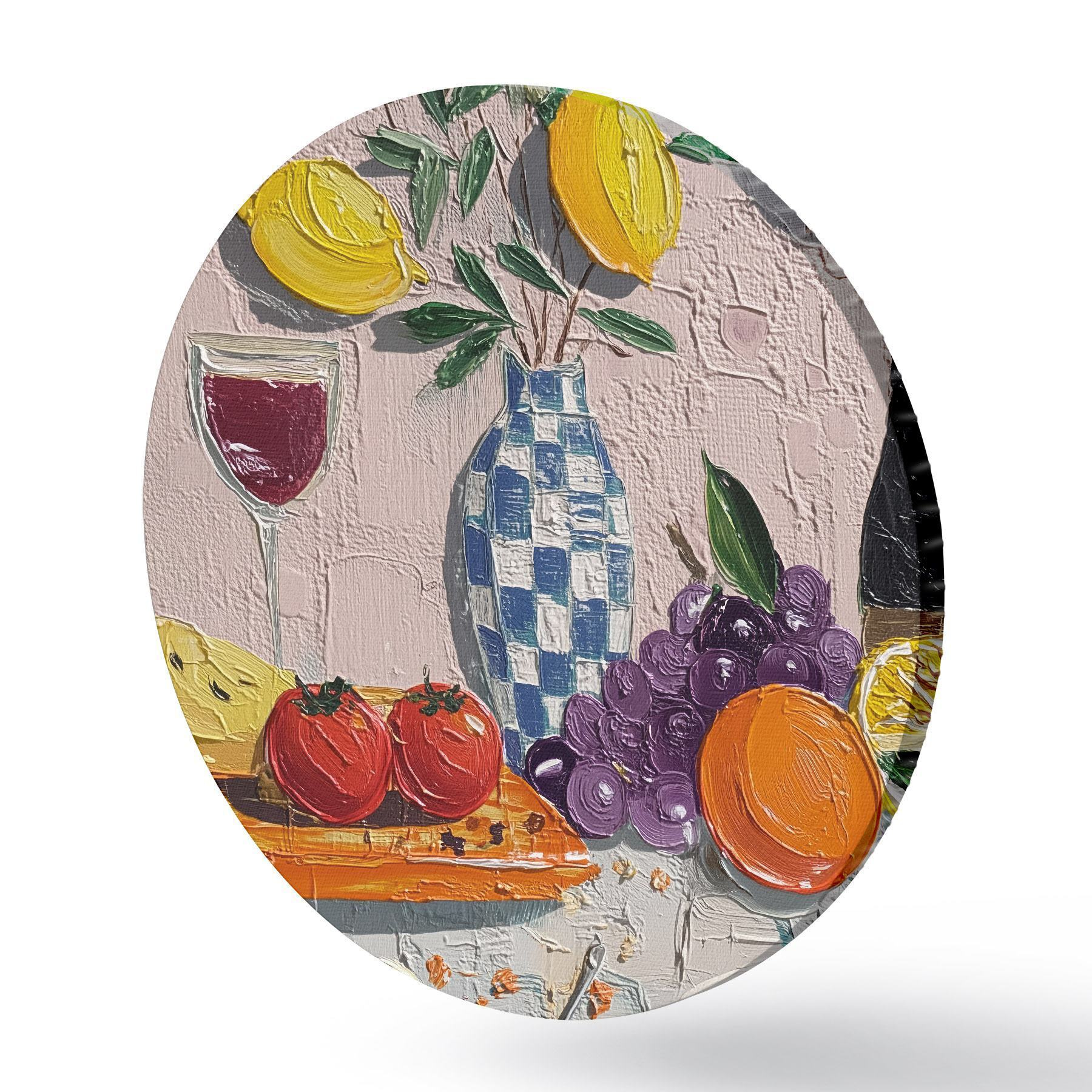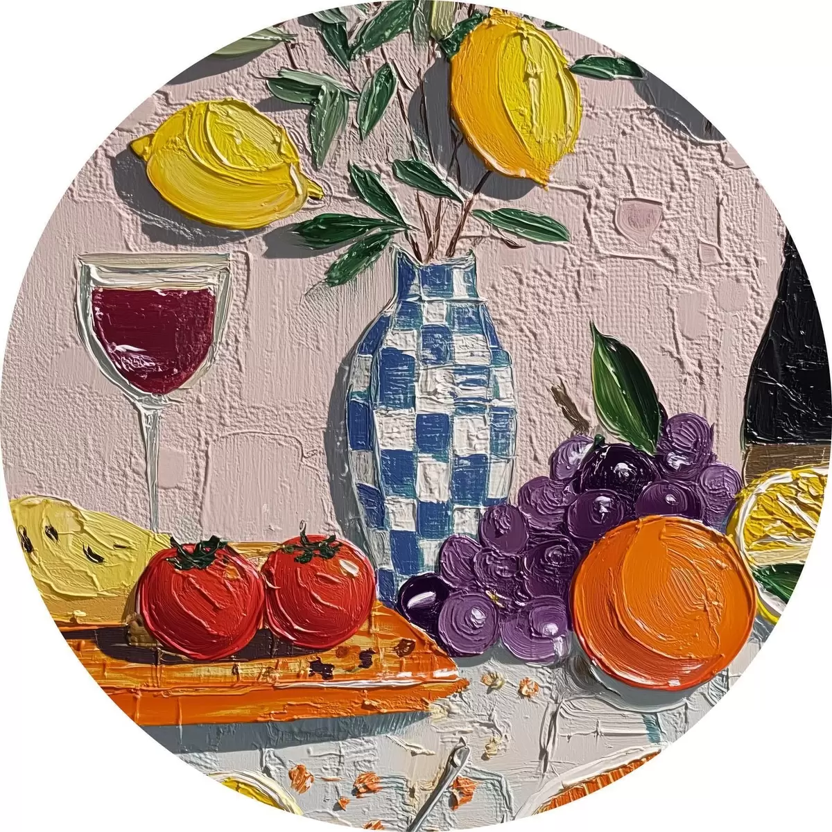 Picturi rotunde Natură moartă în culori pastelate: lămâi, struguri și roșii, impasto r45876