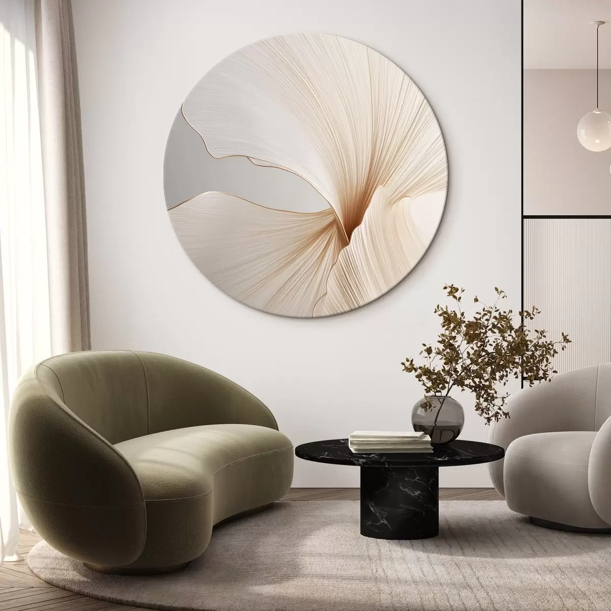 Picturi rotunde Flori abstracte cu petale subțiri și delicate, în nuanțe de alb și bej Nr r45923