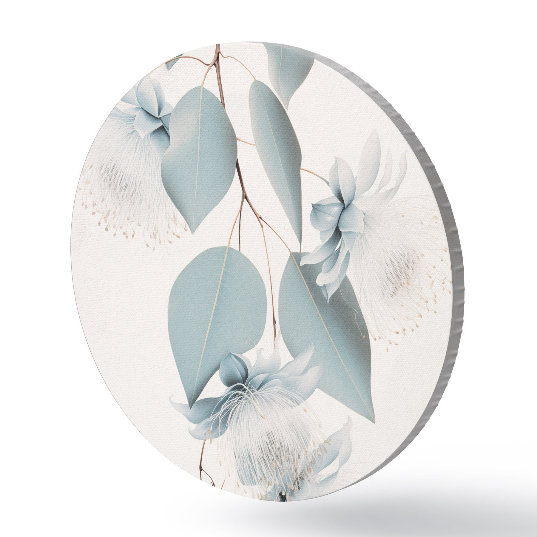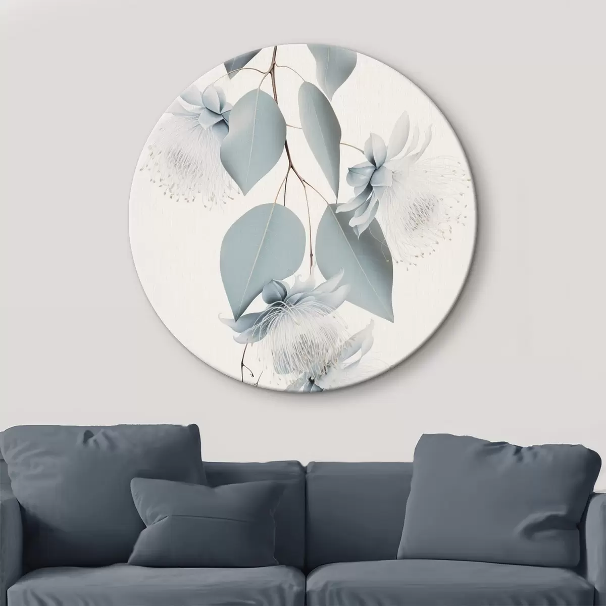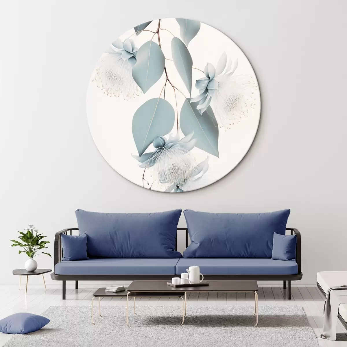 Picturi rotunde Ramură de eucalipt cu frunze albastre și flori albe, fundal deschis Nr r45947