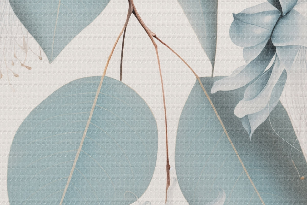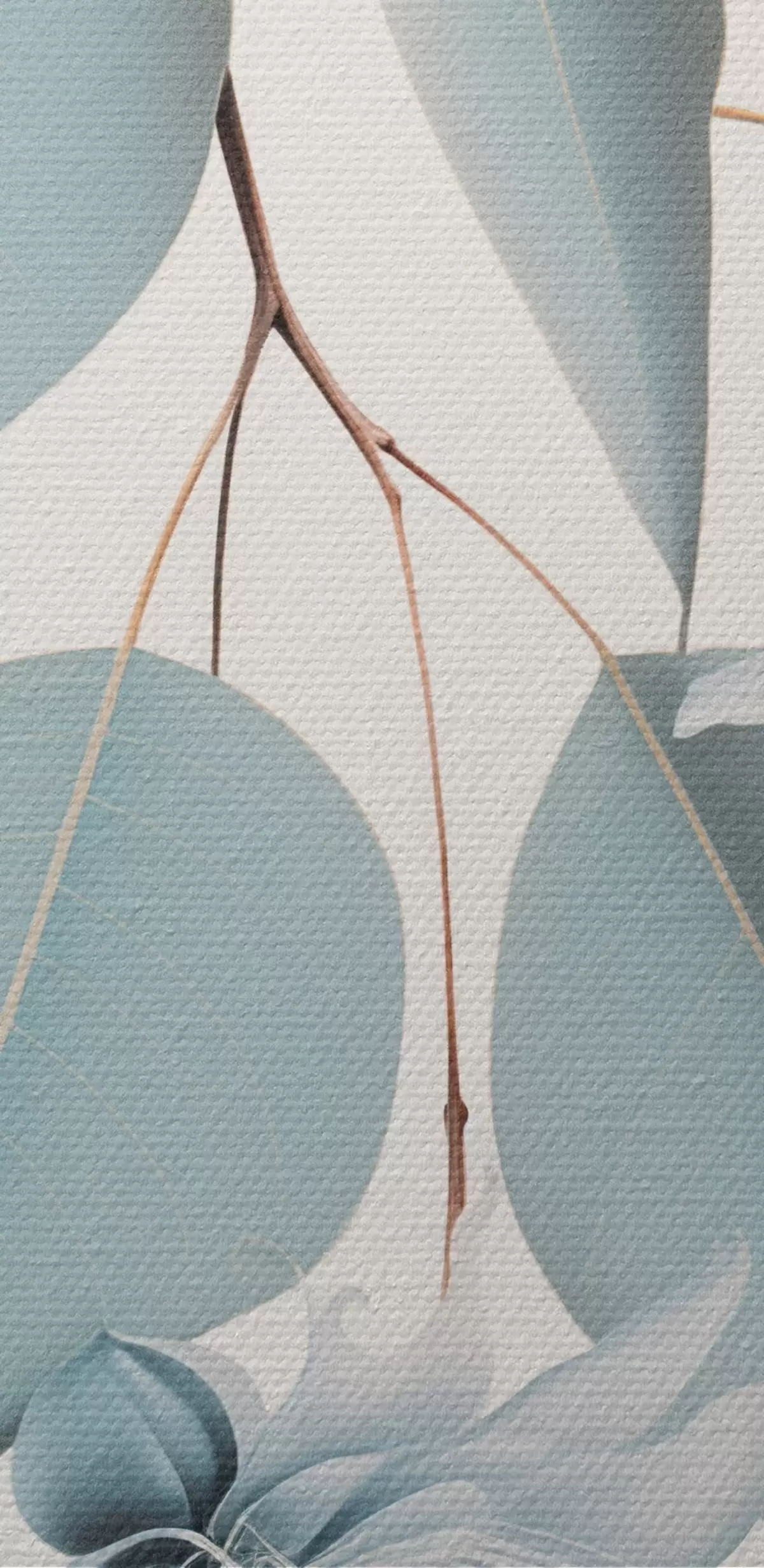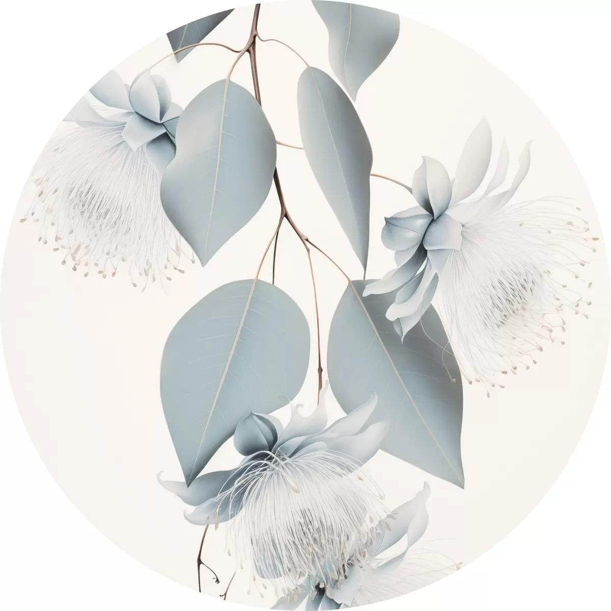 Picturi rotunde Ramură de eucalipt cu frunze albastre și flori albe, fundal deschis Nr r45947