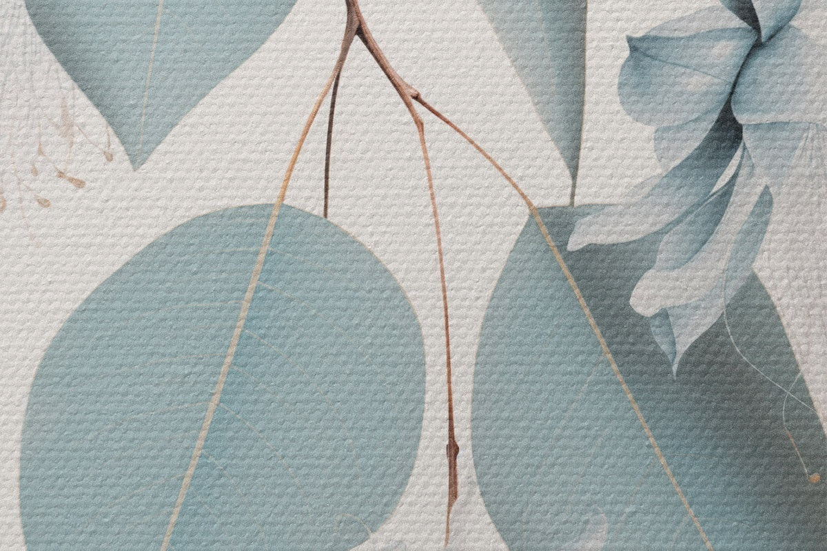 Picturi rotunde Ramură de eucalipt cu frunze albastre și flori albe, fundal deschis r45947