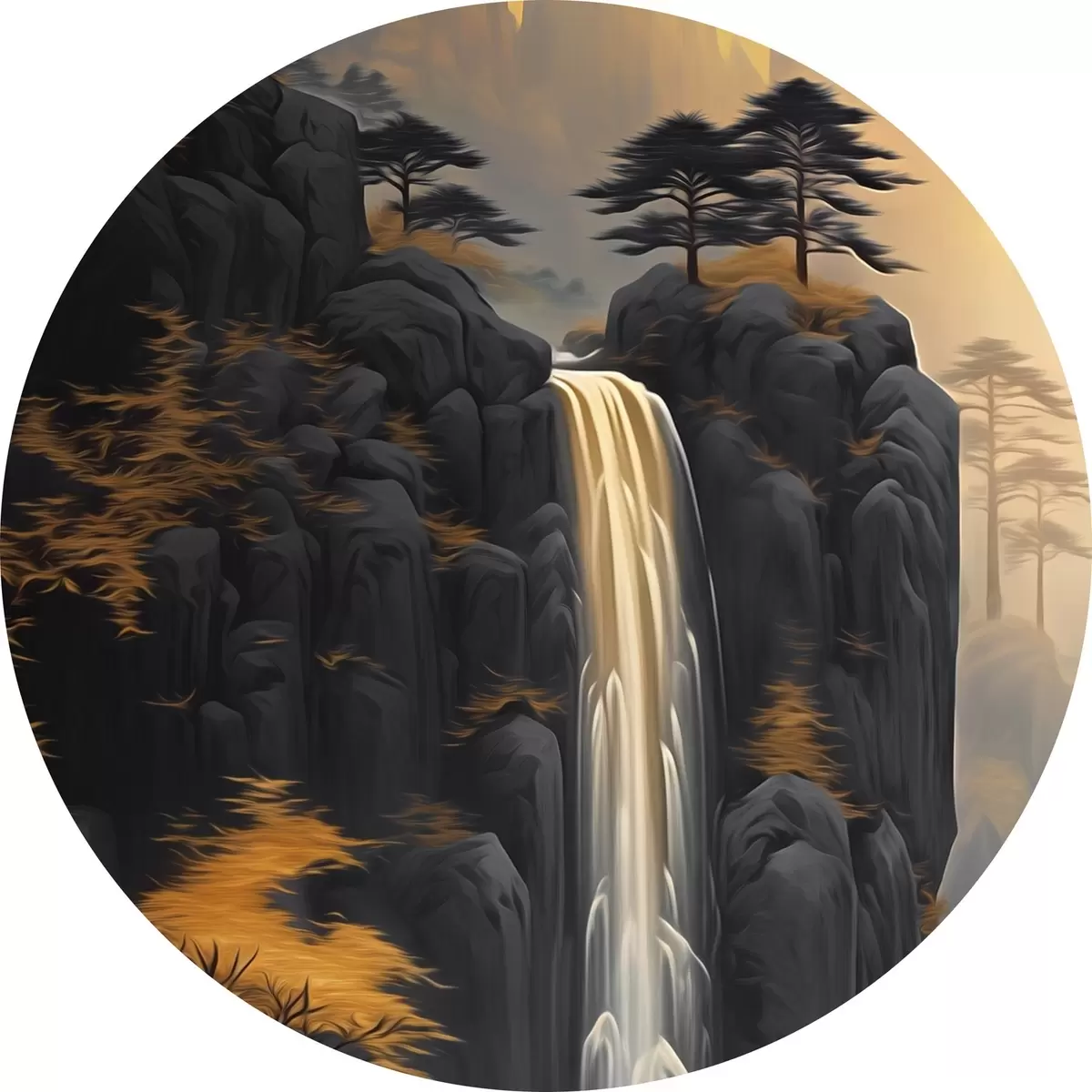 Picturi rotunde Peisaj stâncos cu o cascadă în tonuri calde de apus de soare Nr r46177