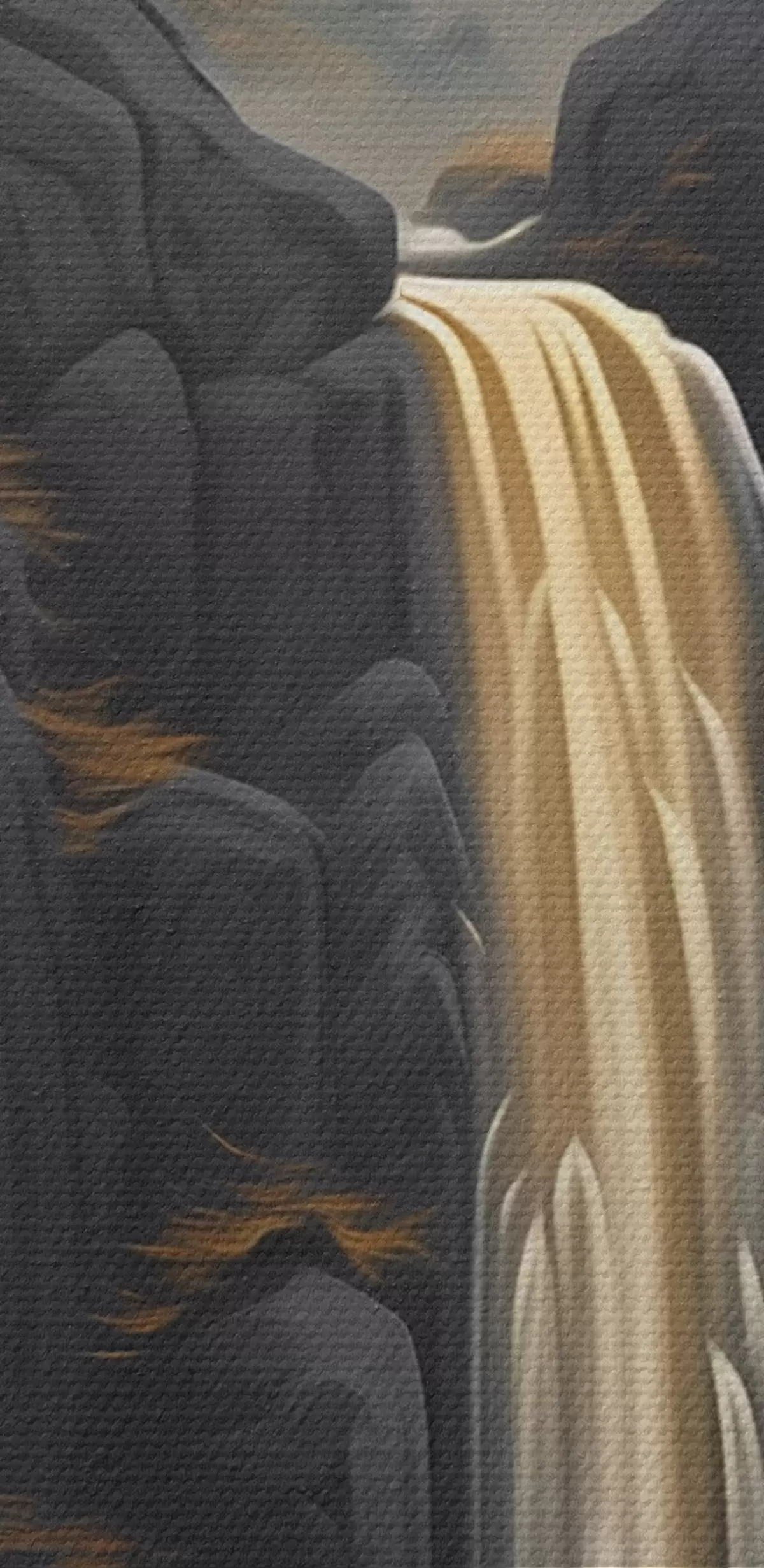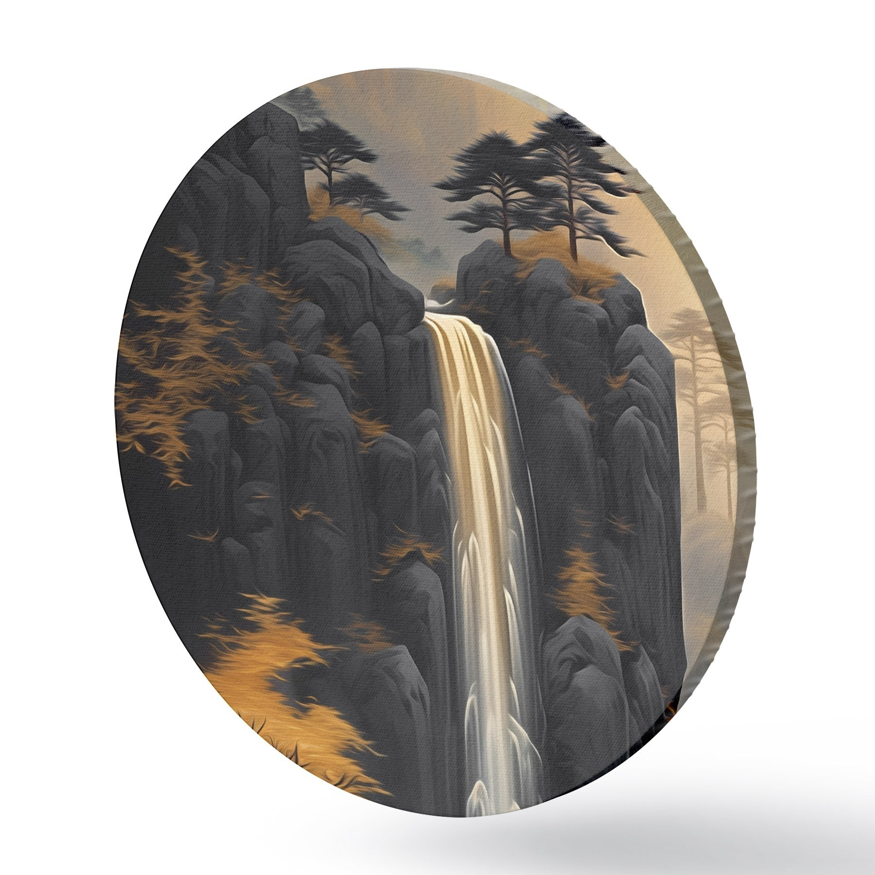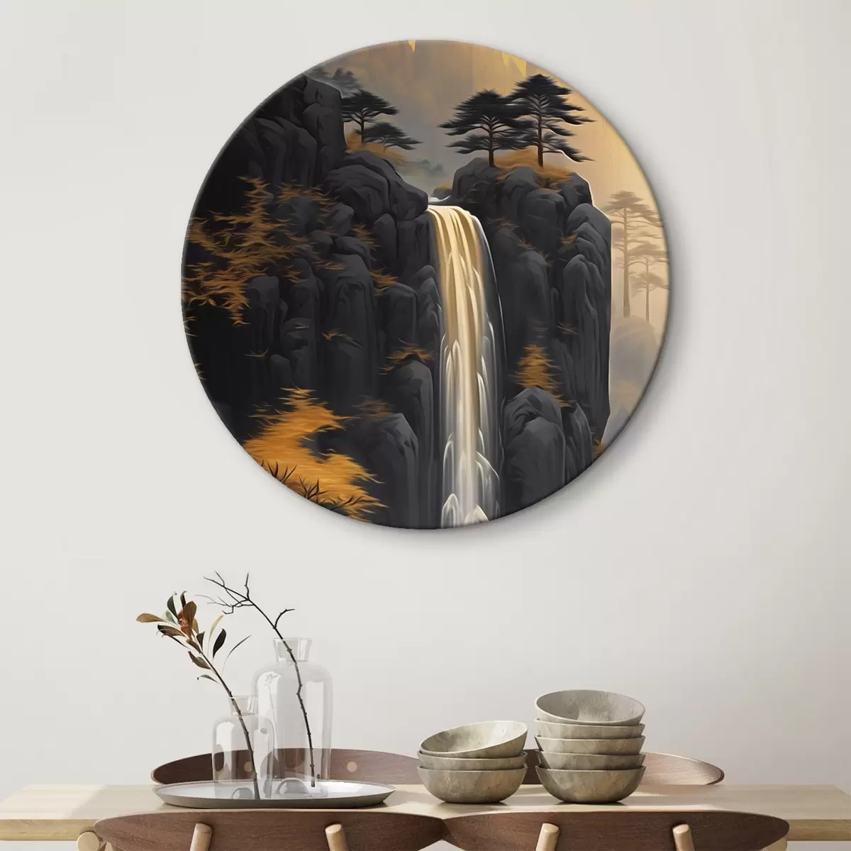 Picturi rotunde Peisaj stâncos cu o cascadă în tonuri calde de apus de soare r46177