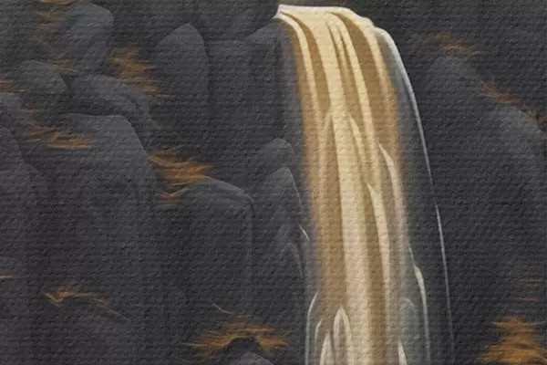 Picturi rotunde Peisaj stâncos cu o cascadă în tonuri calde de apus de soare r46177