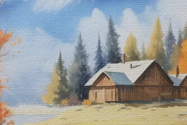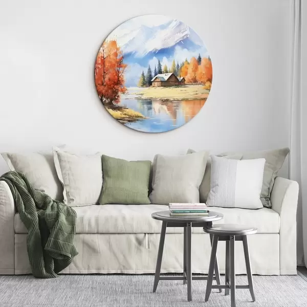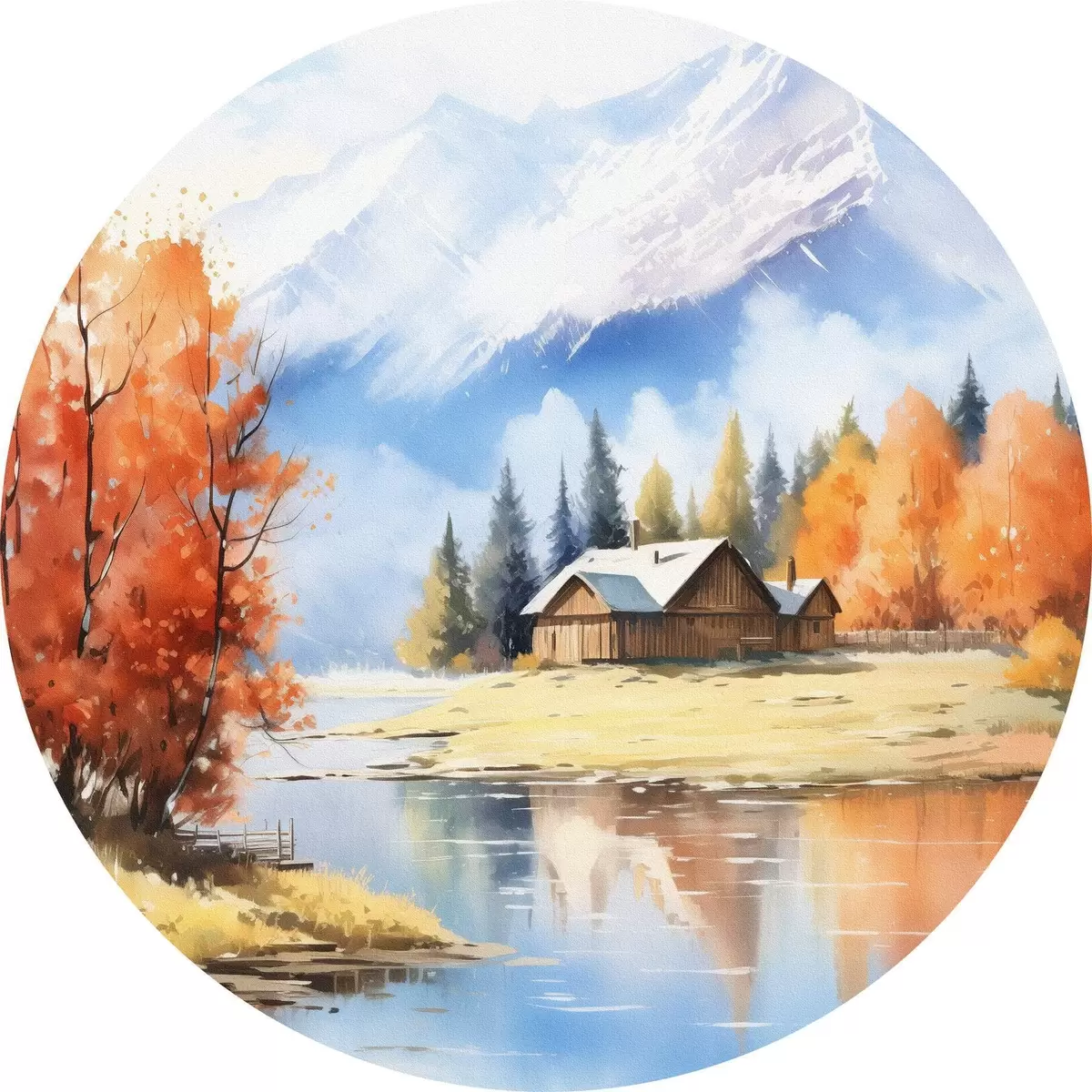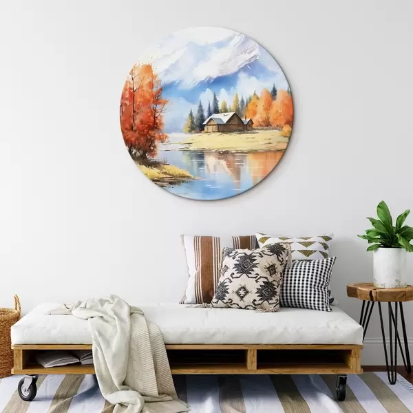 Picturi rotunde Peisaj de toamnă lângă lac, cu o casă și munți Nr r46184