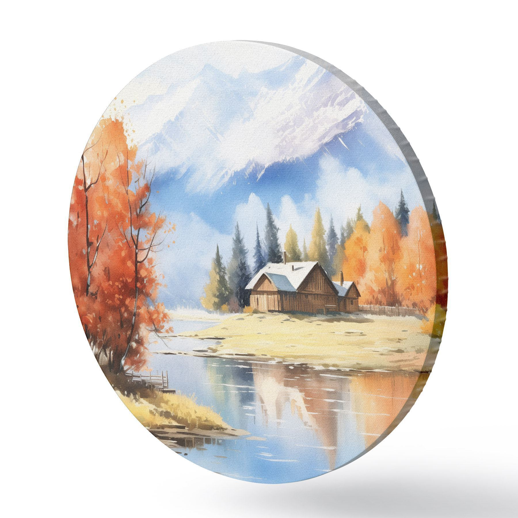 Picturi rotunde Peisaj de toamnă lângă lac, cu o casă și munți r46184
