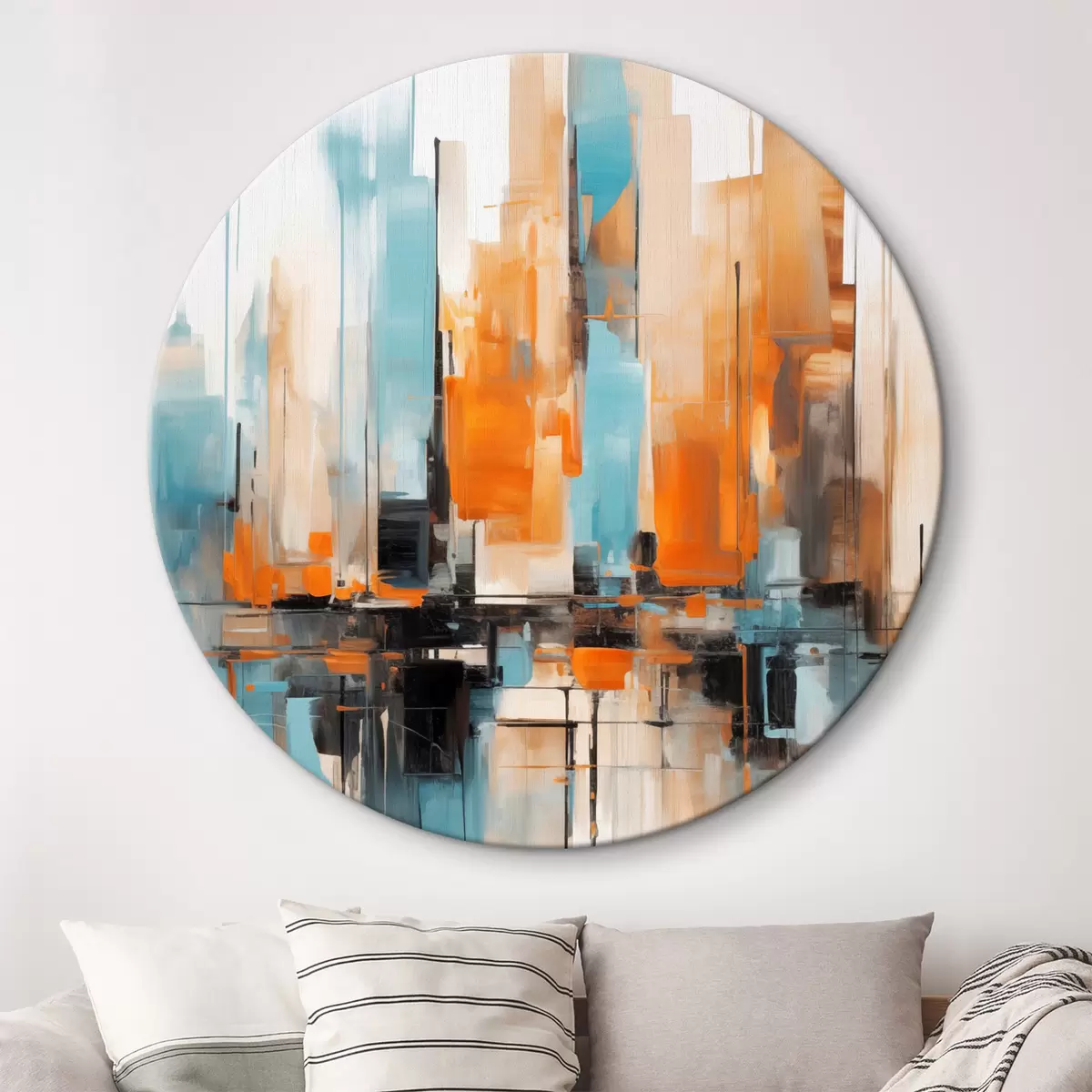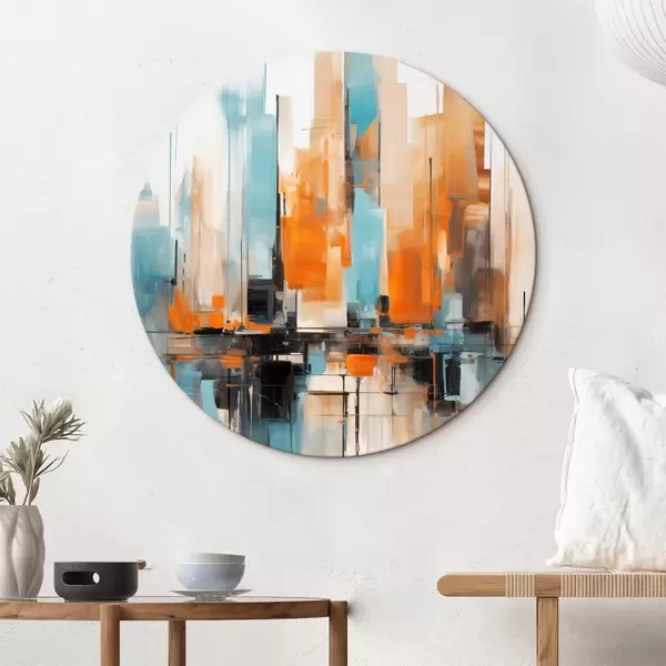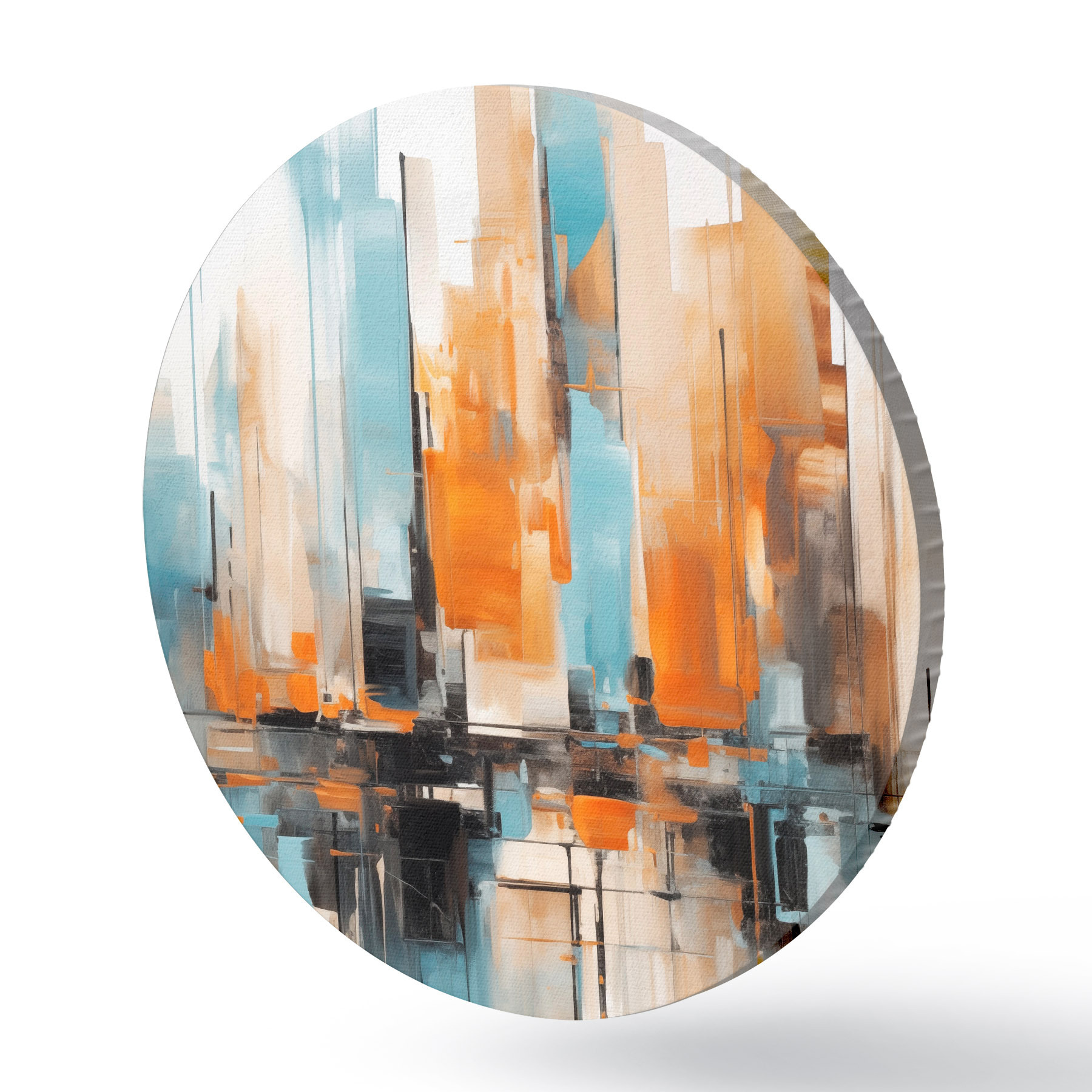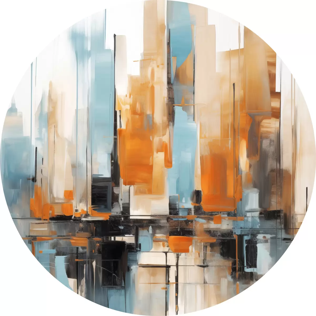 Picturi rotunde Peisaj urban abstract cu tușe verticale în nuanțe de portocaliu, albastru și alb, stil pictural Nr r46267