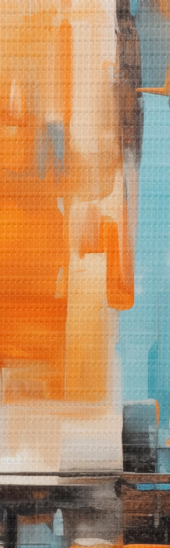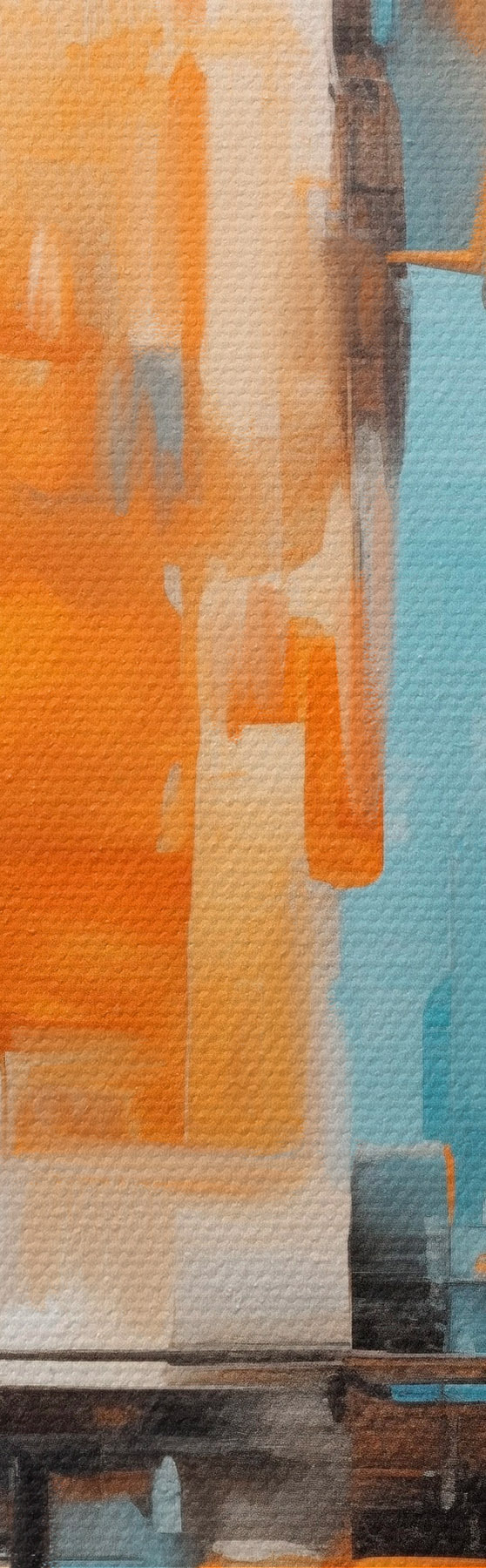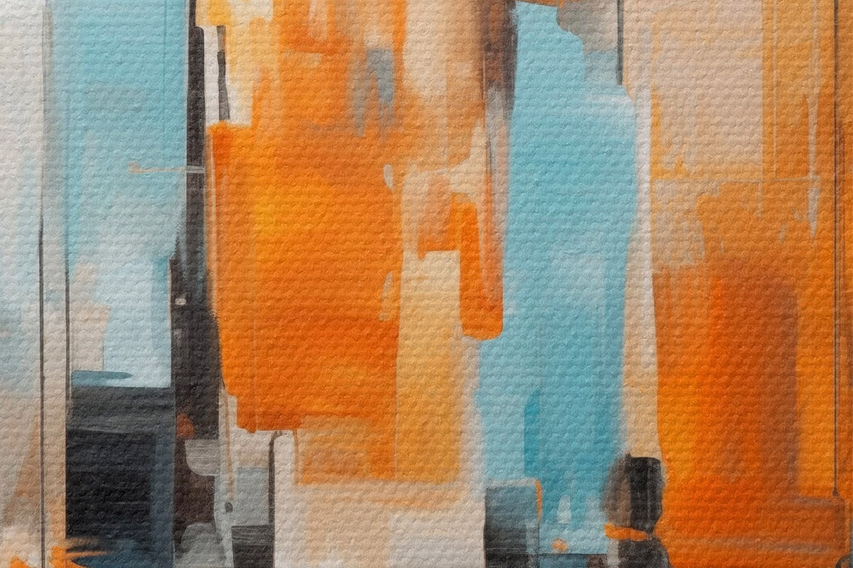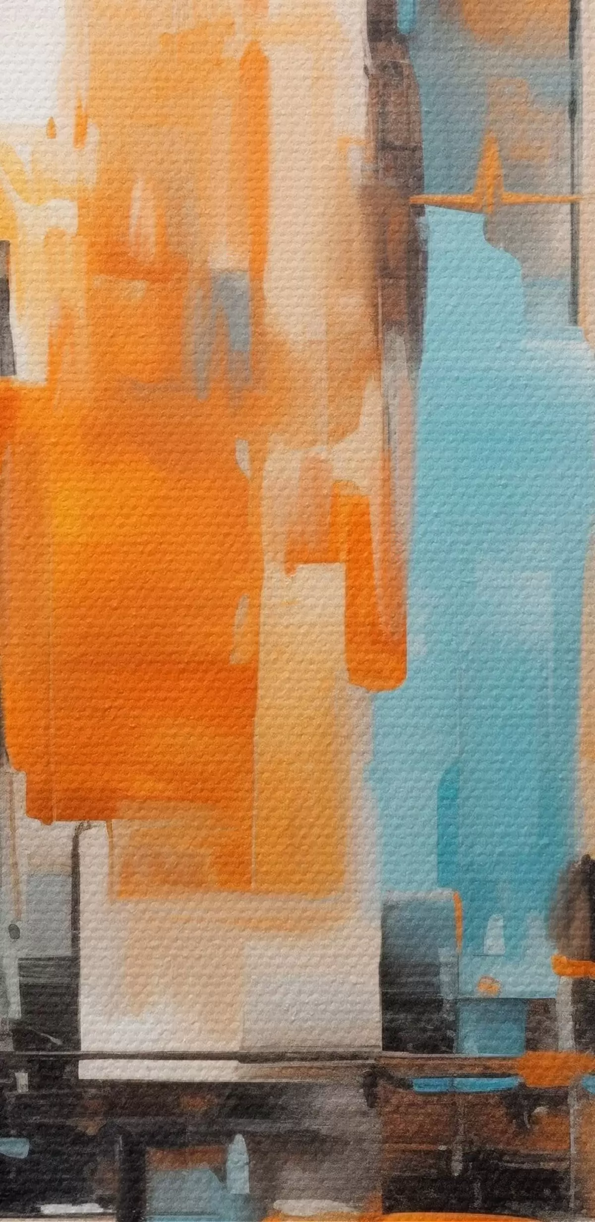 Picturi rotunde Peisaj urban abstract cu tușe verticale în nuanțe de portocaliu, albastru și alb, stil pictural Nr r46267