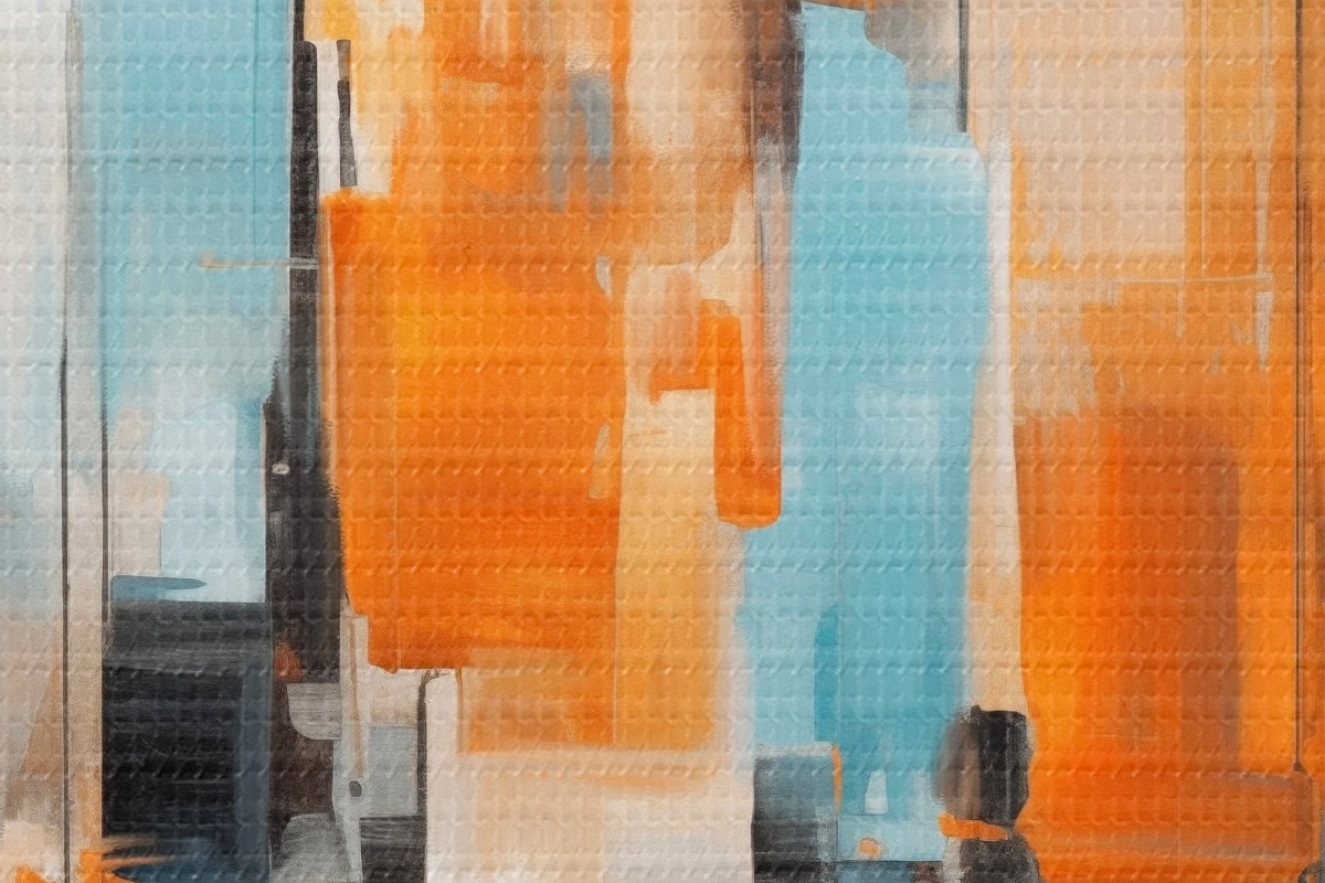 Picturi rotunde Peisaj urban abstract cu tușe verticale în nuanțe de portocaliu, albastru și alb, stil pictural r46267