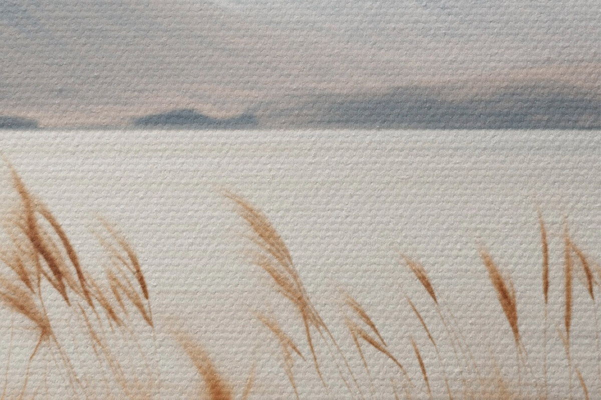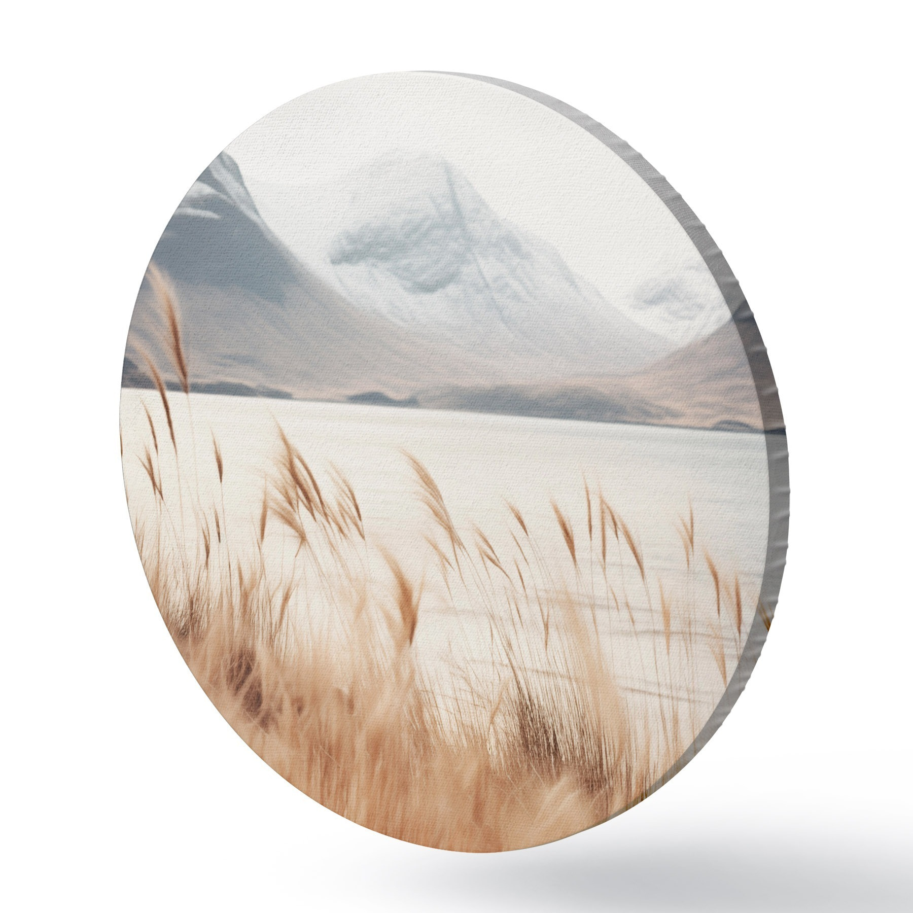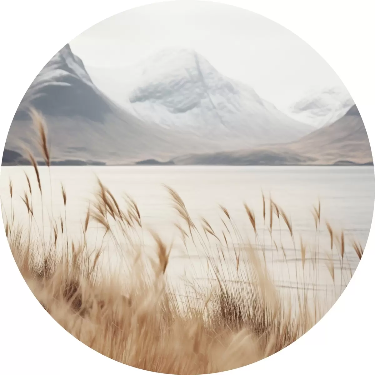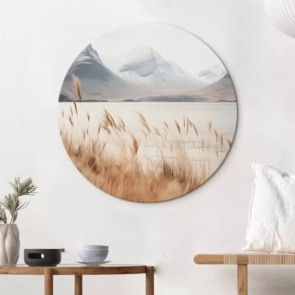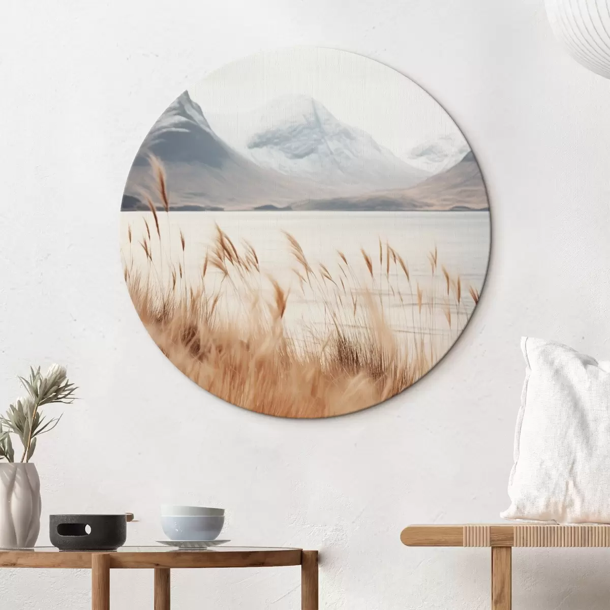 Picturi rotunde Câmp de iarbă pampas în fața unui peisaj lacustru, cu munți înzăpeziți în fundal, lumină difuză r46282