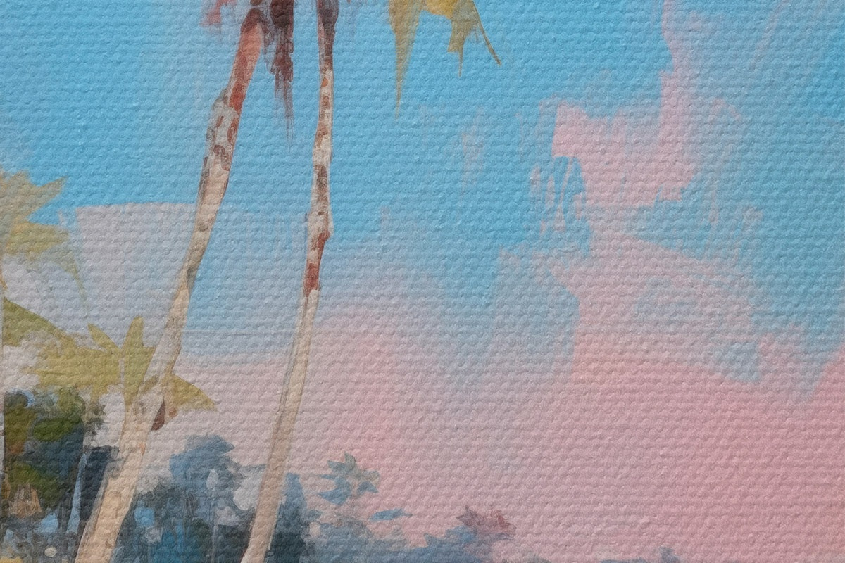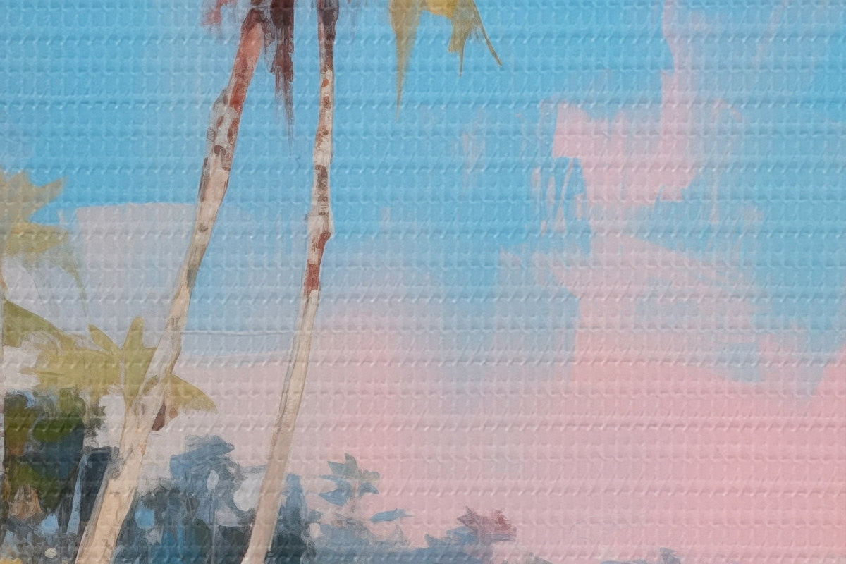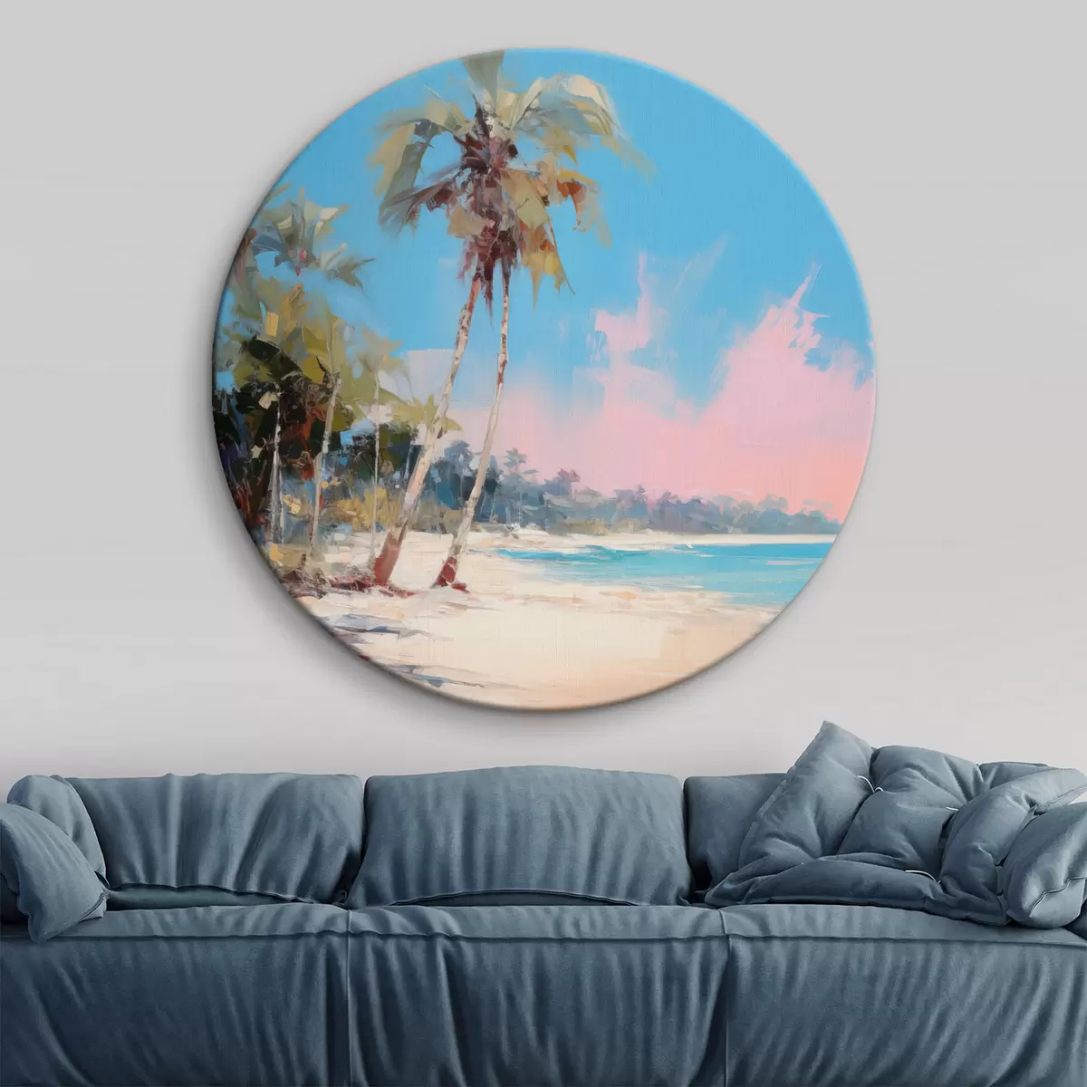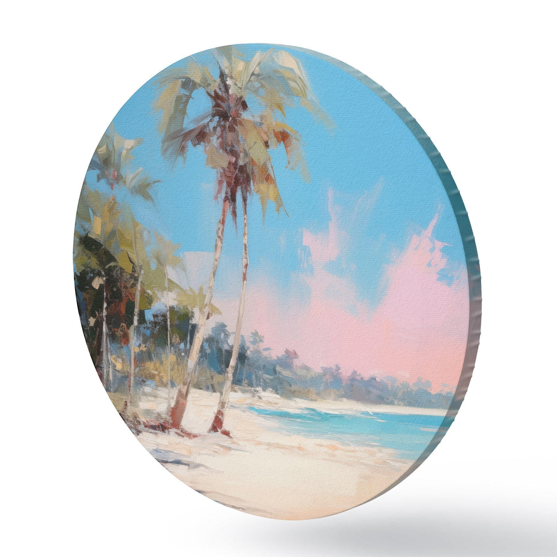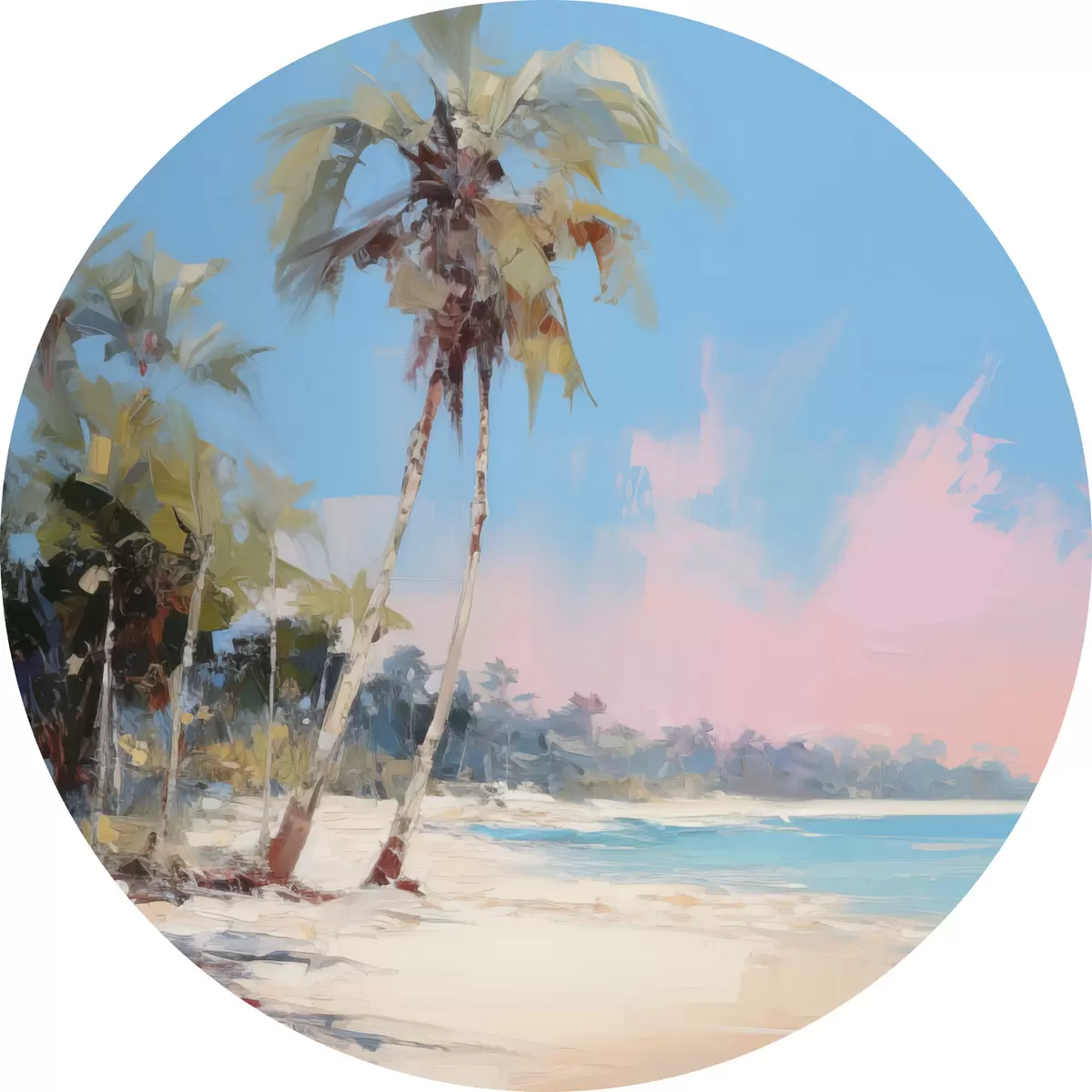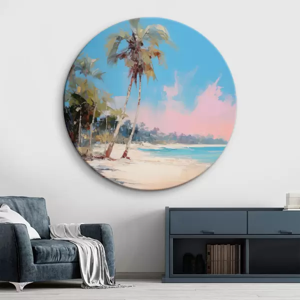 Picturi rotunde Plajă tropicală abstractă cu nisip alb și palmieri, cer albastru cu nori albi Nr r46285