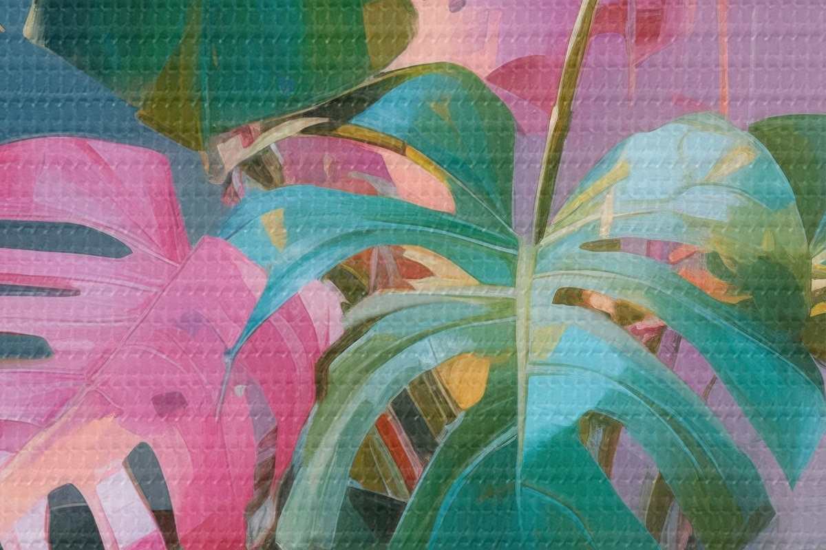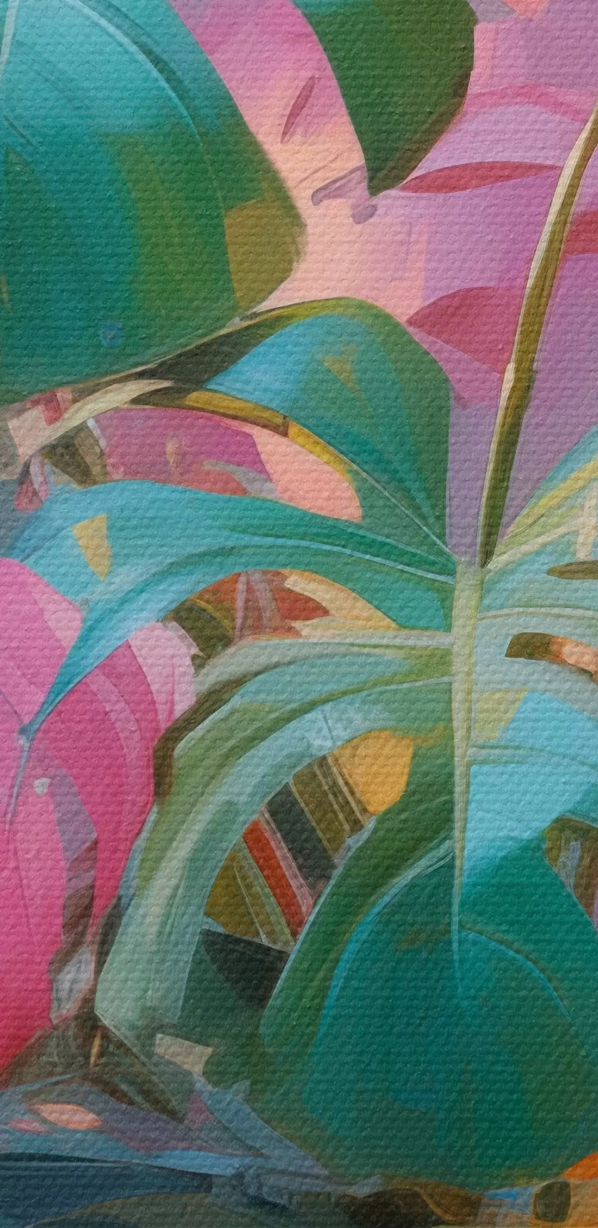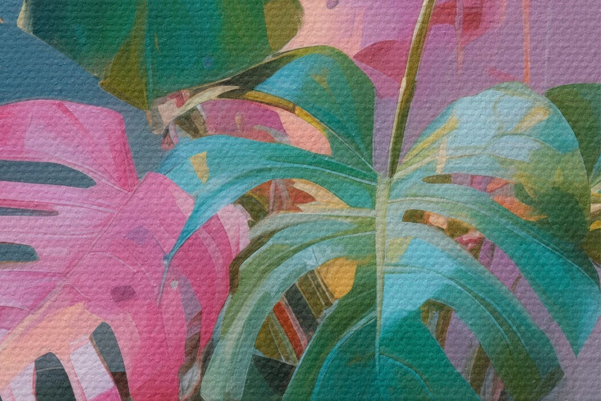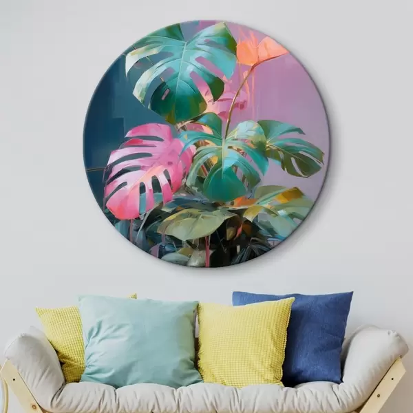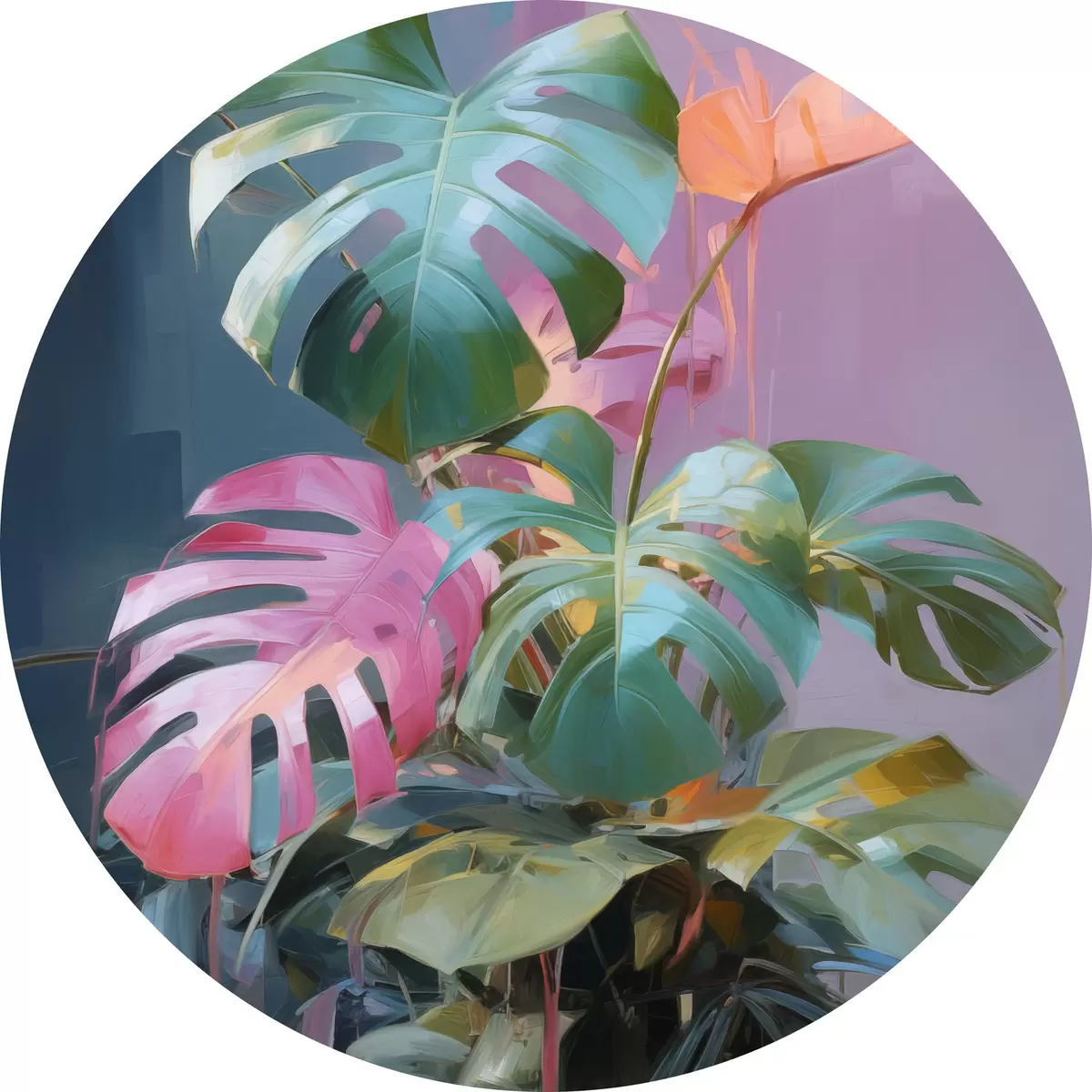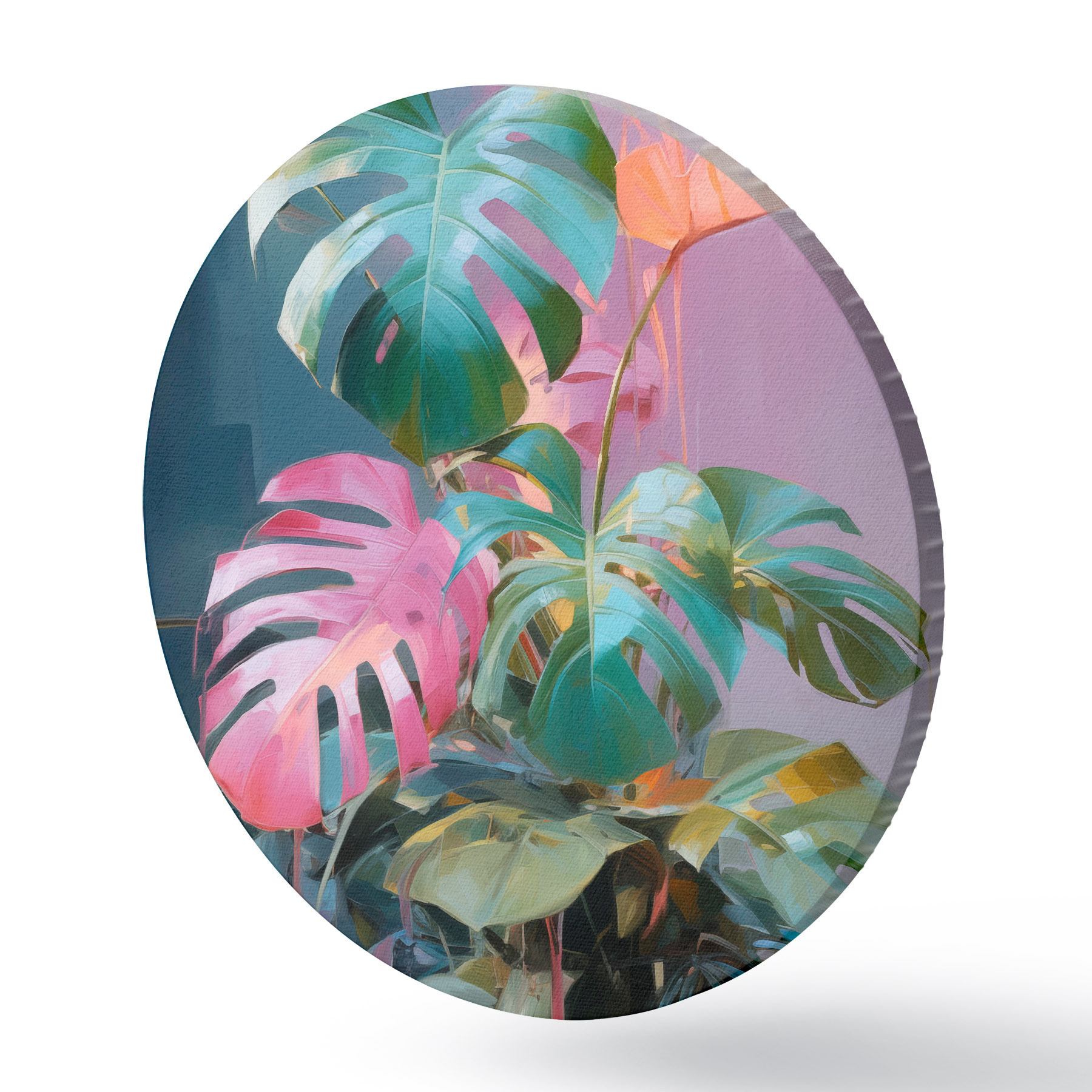 Picturi rotunde Plantă abstractă monstera cu frunze roz și verzi, culori vibrante, pe un fundal estompat r46287