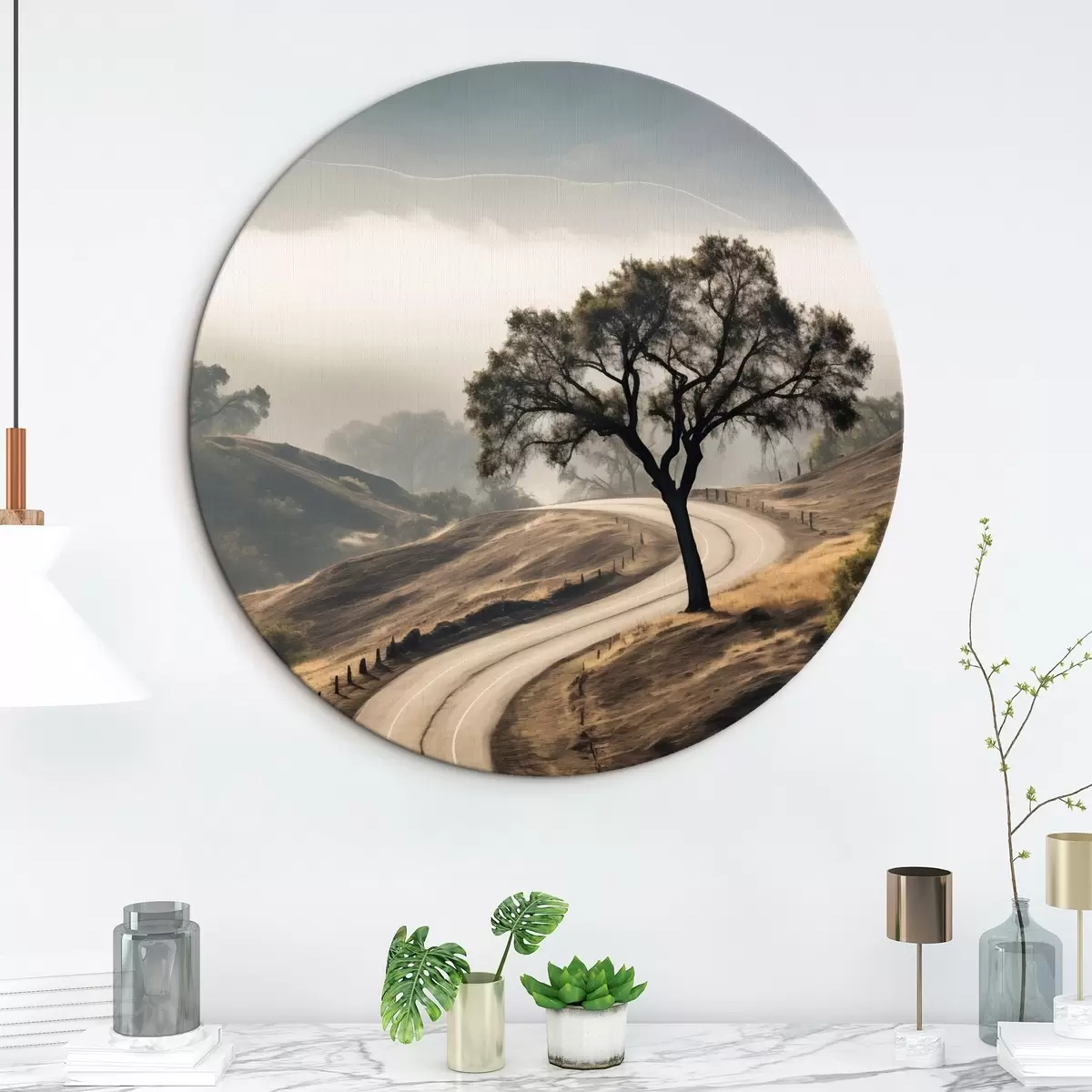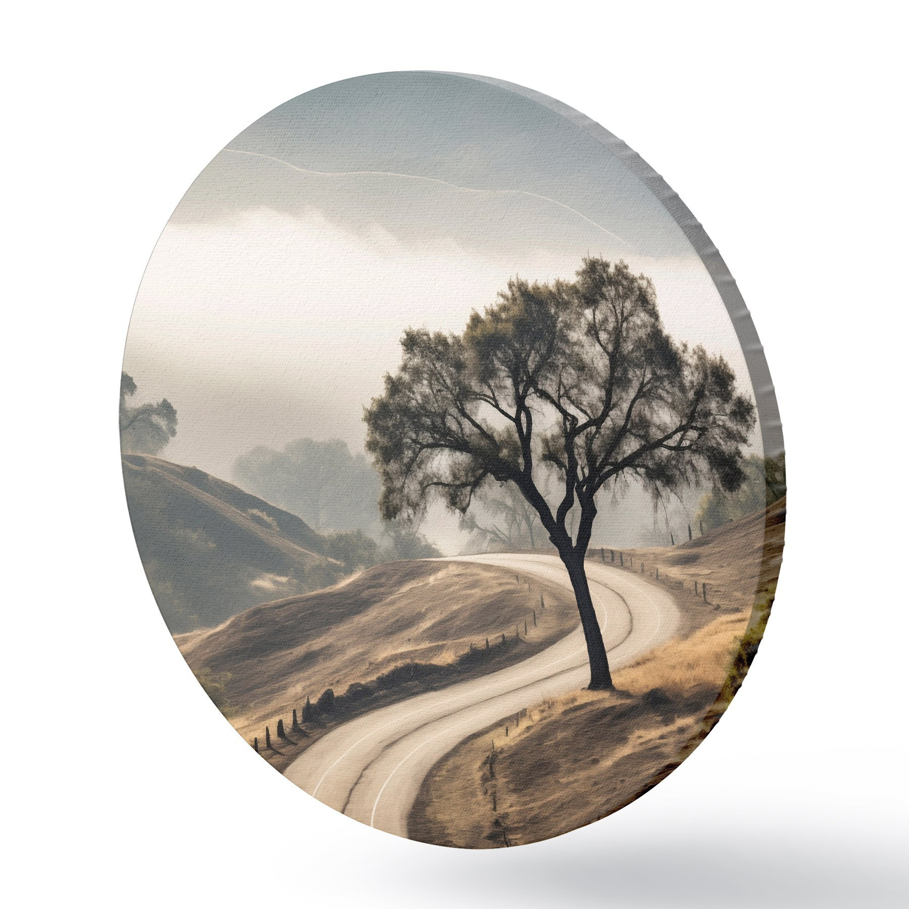 Picturi rotunde Un drum șerpuitor prin dealuri ondulate, cu un copac în prim-plan, fundalul cu ceață și munți r46288