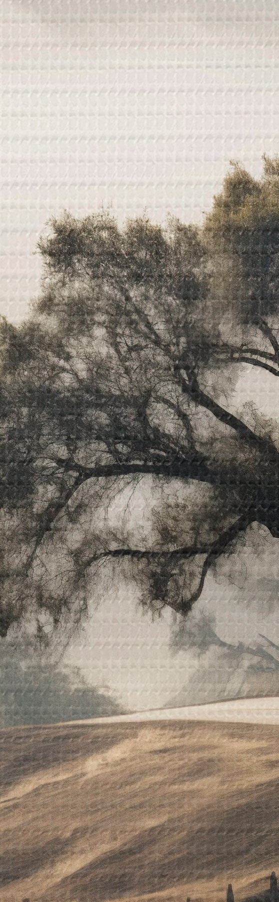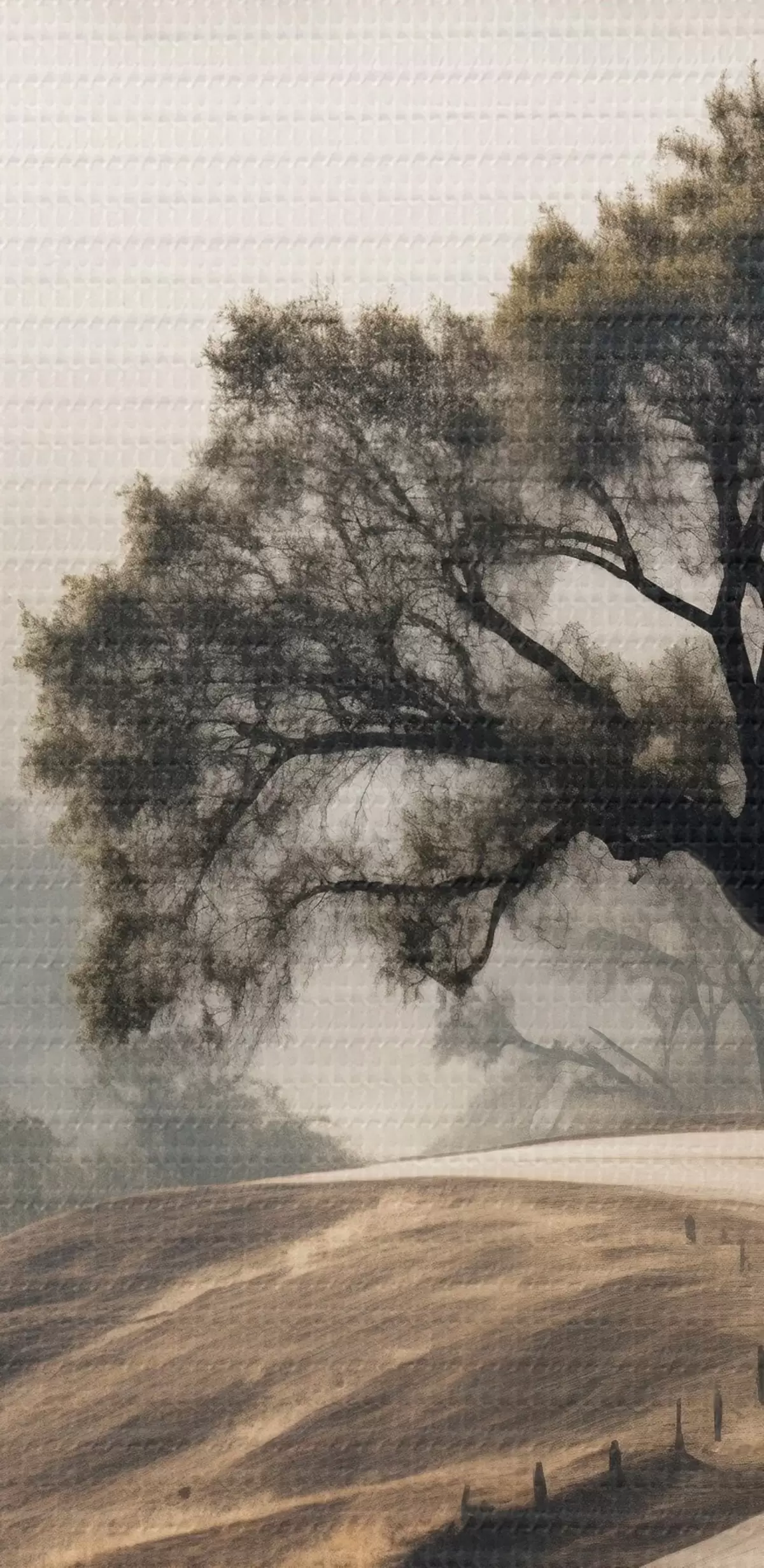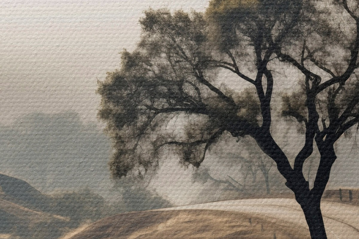 Picturi rotunde Un drum șerpuitor prin dealuri ondulate, cu un copac în prim-plan, fundalul cu ceață și munți Nr r46288