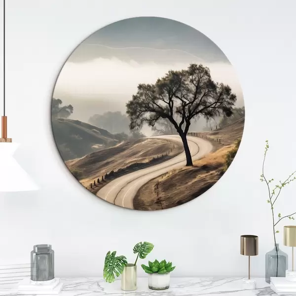 Picturi rotunde Un drum șerpuitor prin dealuri ondulate, cu un copac în prim-plan, fundalul cu ceață și munți Nr r46288