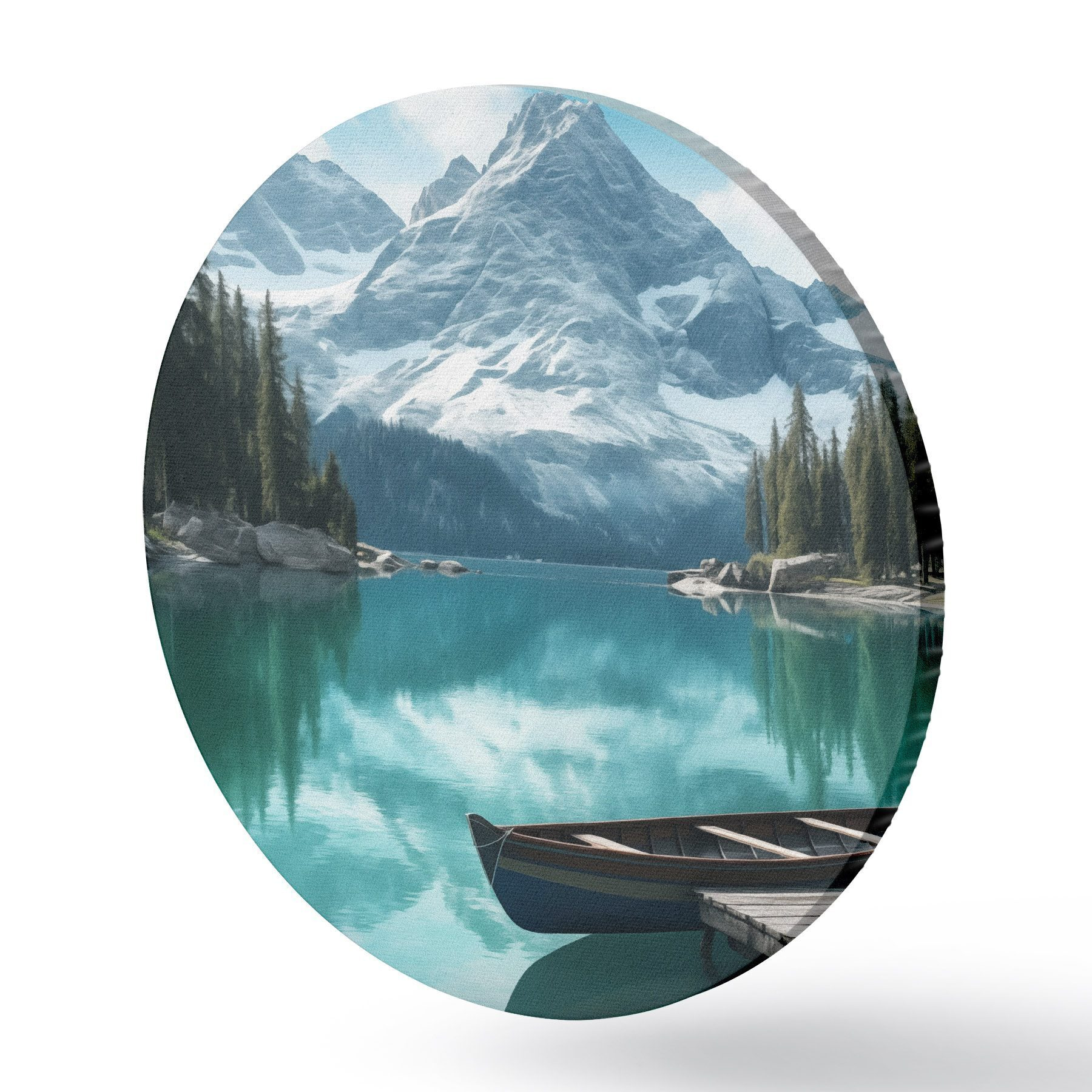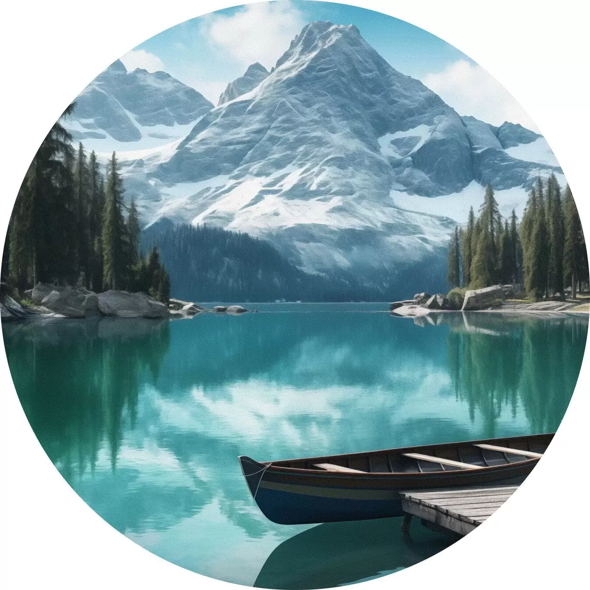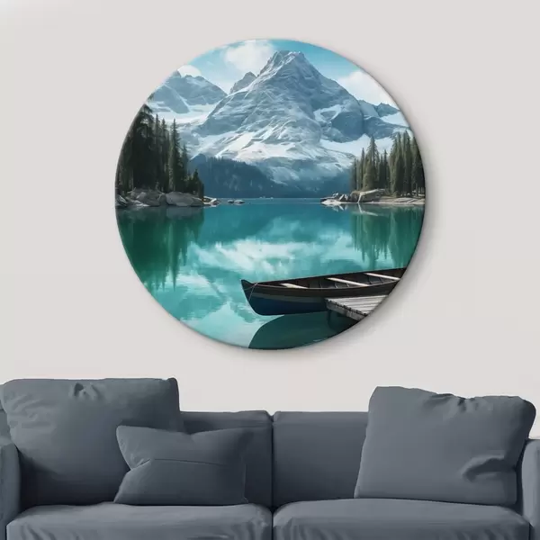 Picturi rotunde Lac alpin cu canoe și vârfuri înzăpezite Nr r46481