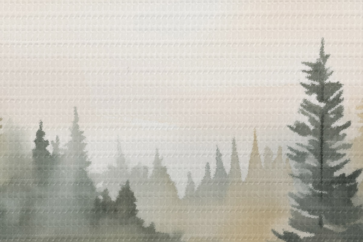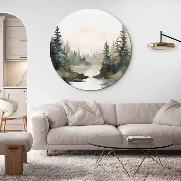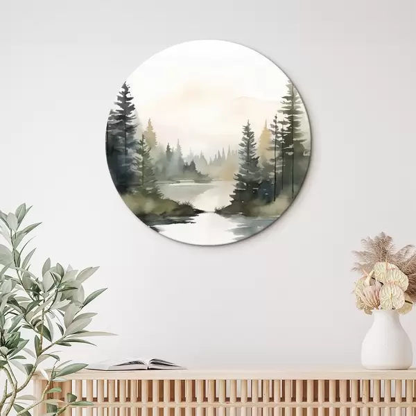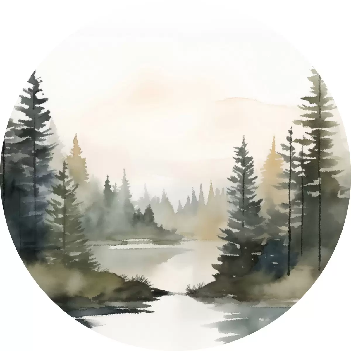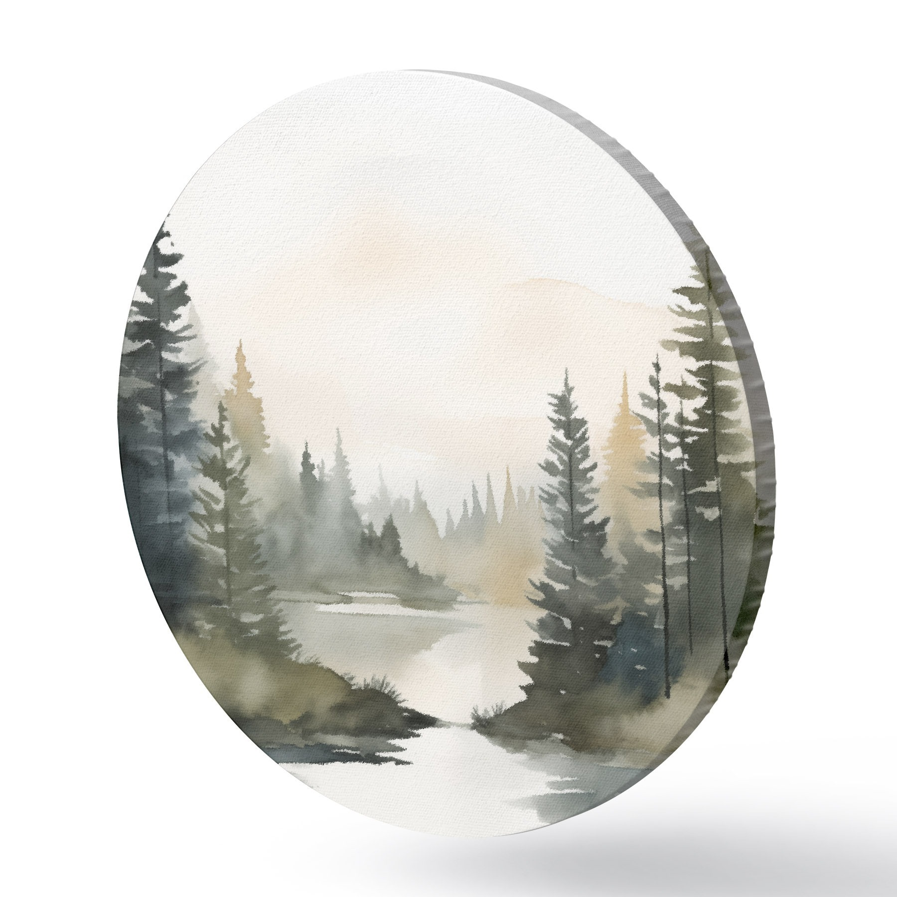 Picturi rotunde Pădure de conifere ceață peste râul calm, stil acuarelă Nr r46507