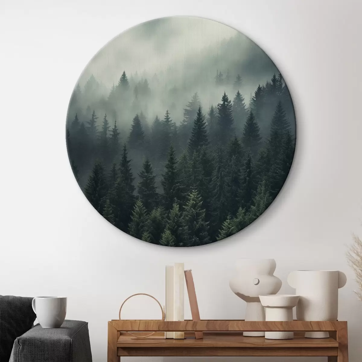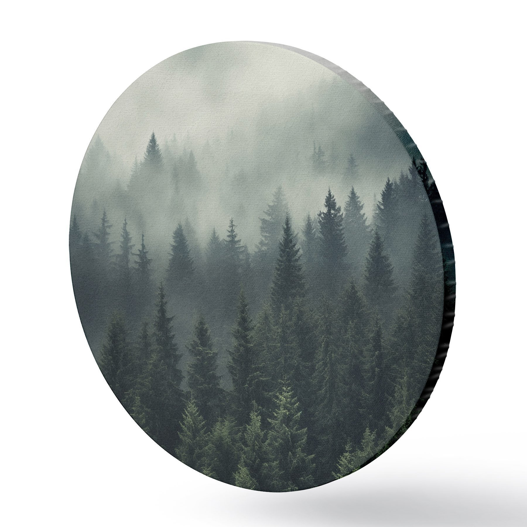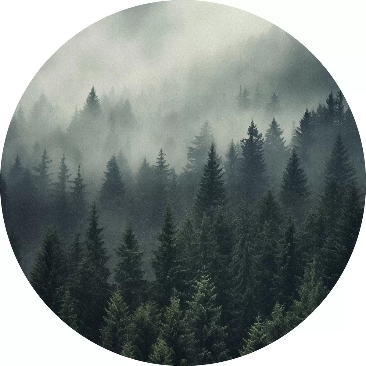Picturi rotunde Ceață care se rostogolește peste pădurea densă de conifere Nr r46512