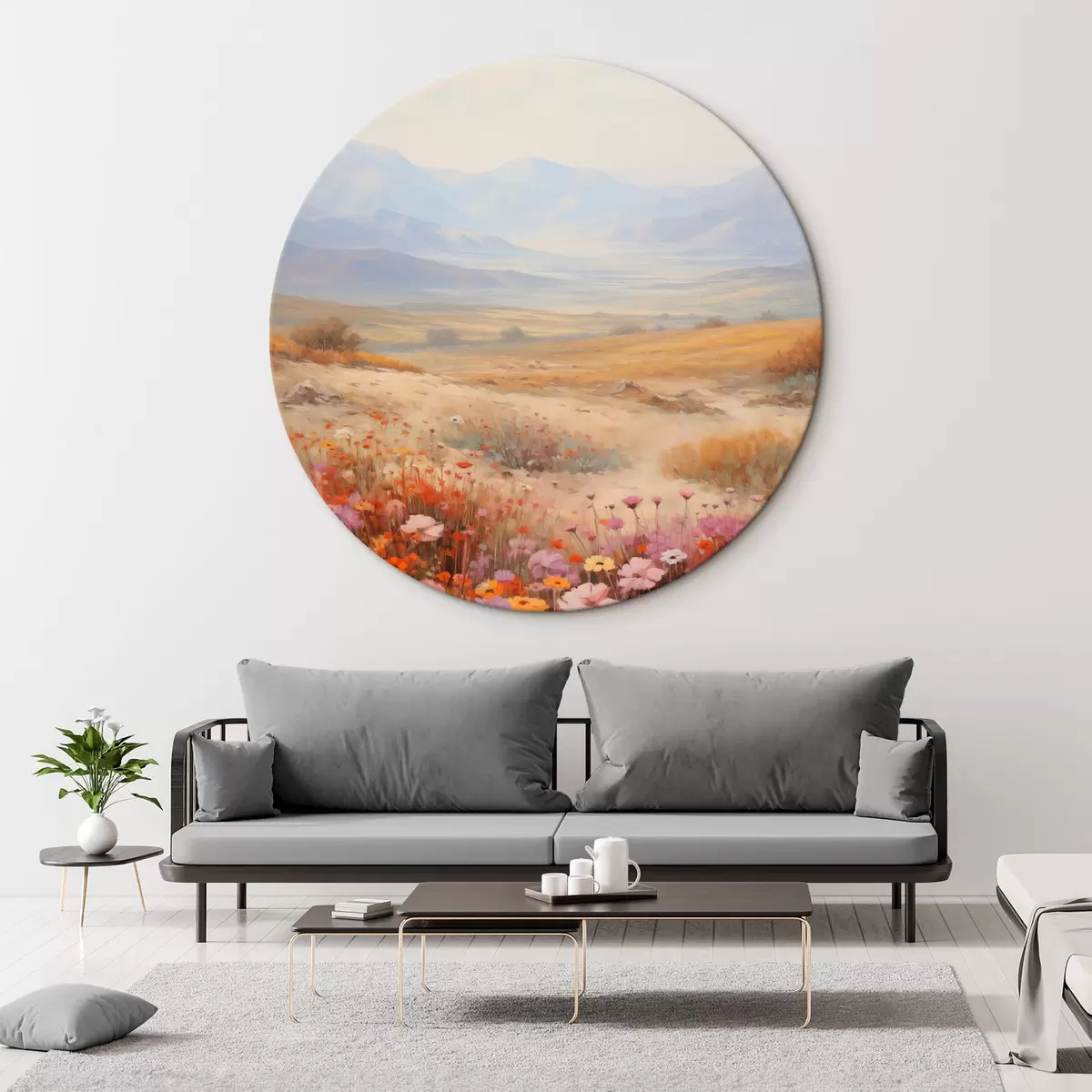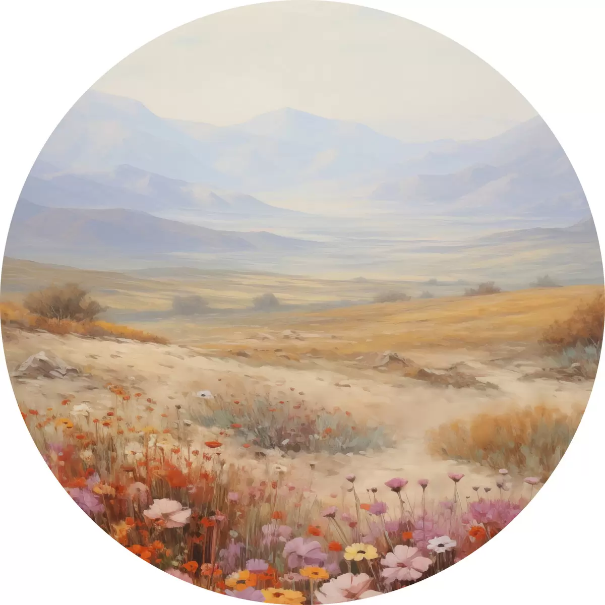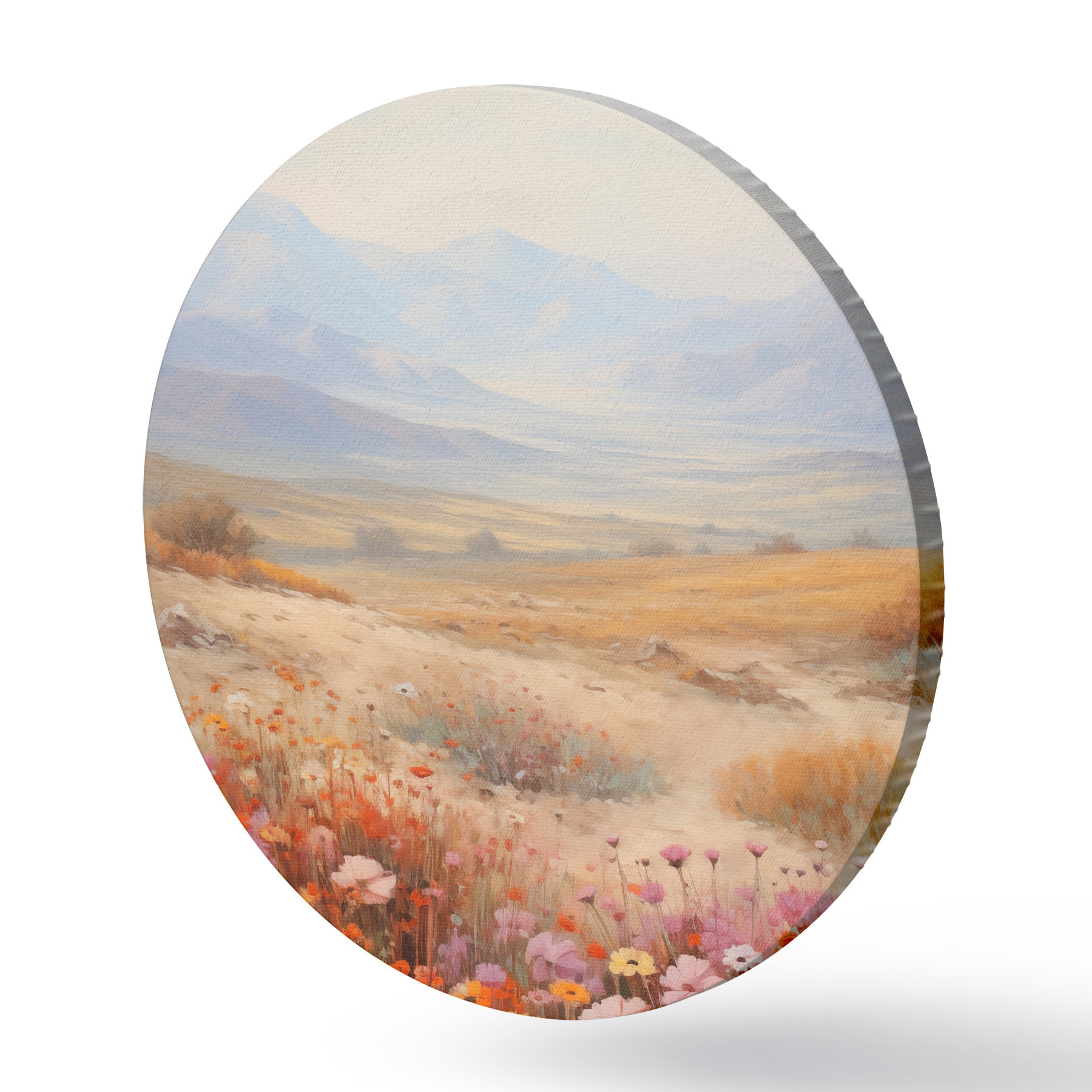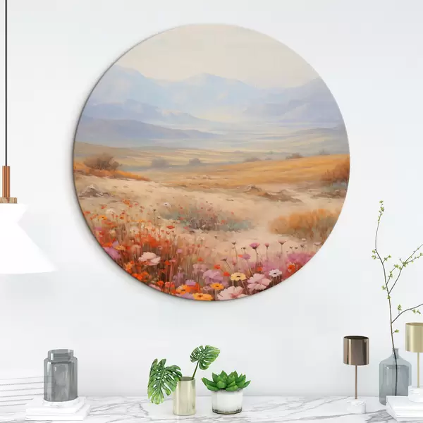 Picturi rotunde Peisaj, un câmp cu flori colorate și munți în fundal, culori delicate și pastelate r46685