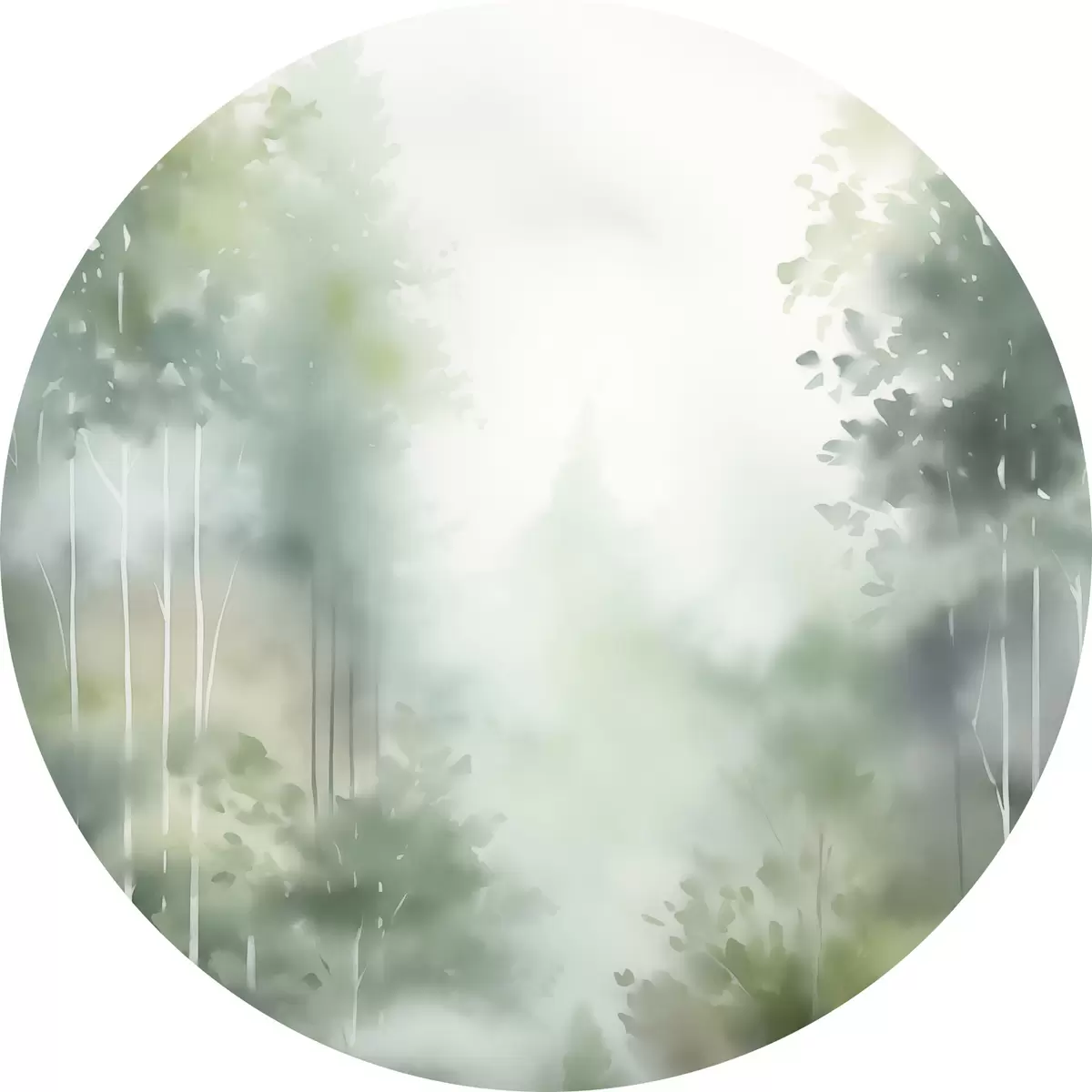 Picturi rotunde Imitatie de pictura in acuarela reprezentand o padure abstracta cu copaci inalti si frunziș verde, culori delicate si discrete Nr r46689