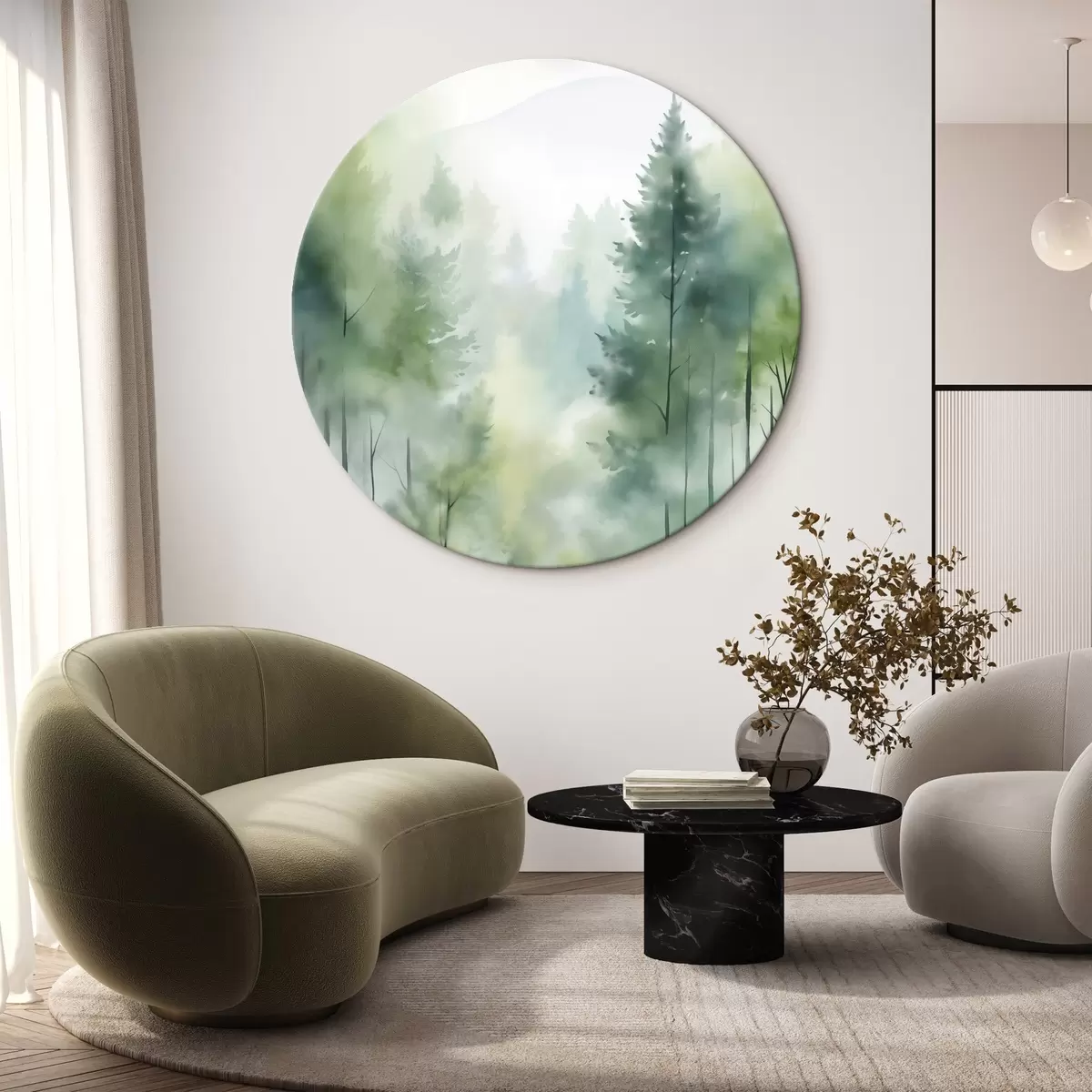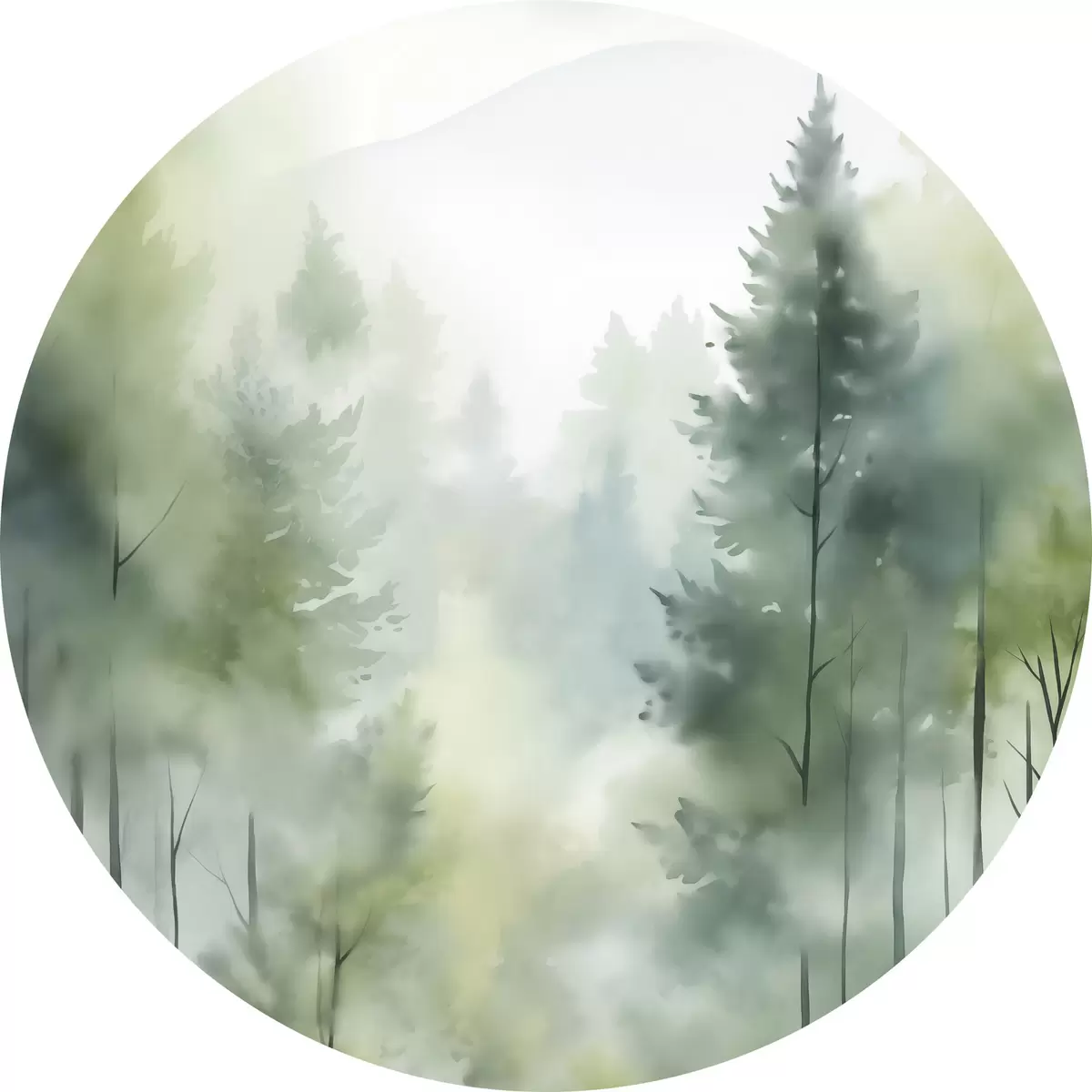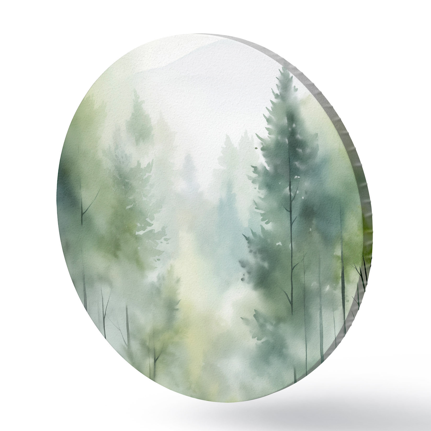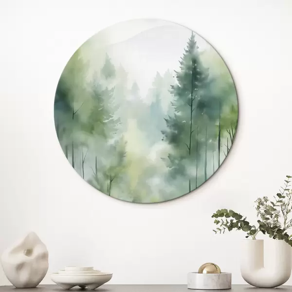 Picturi rotunde Imitatie de pictura in acuarela a unei pustiuri cețoase, cu pini înalți și munți în fundal Nr r46690