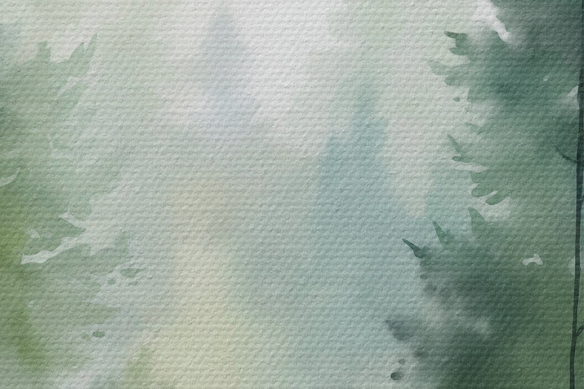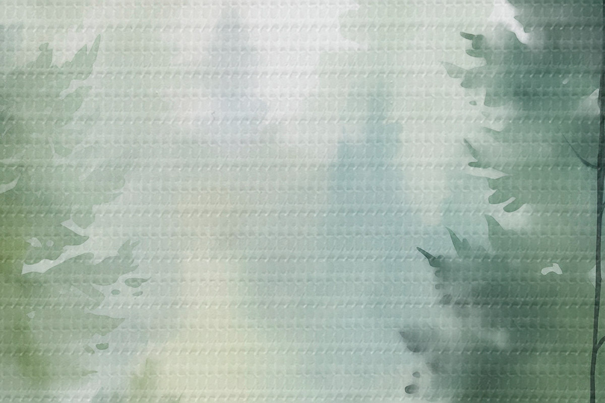 Picturi rotunde Imitatie de pictura in acuarela a unei pustiuri cețoase, cu pini înalți și munți în fundal r46690
