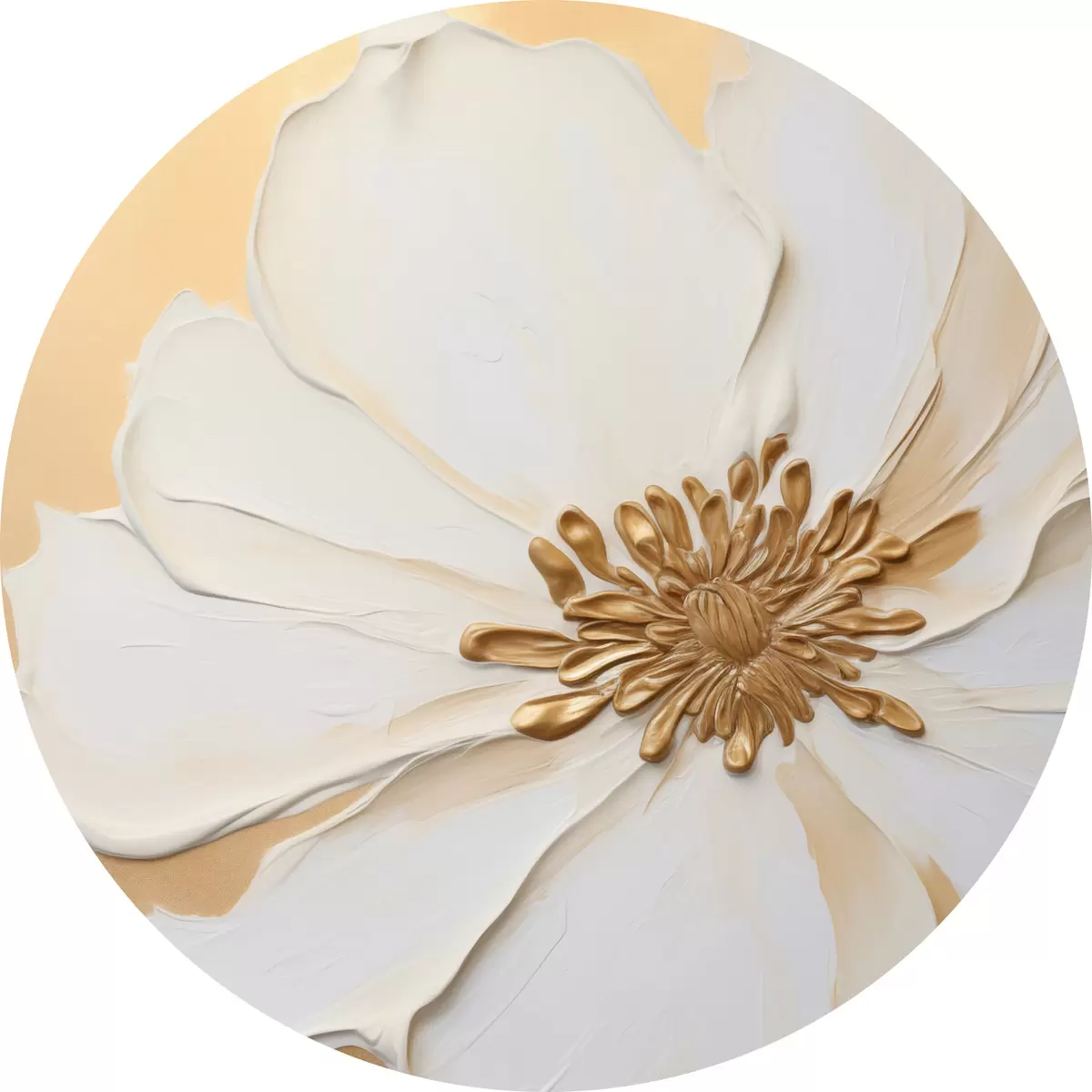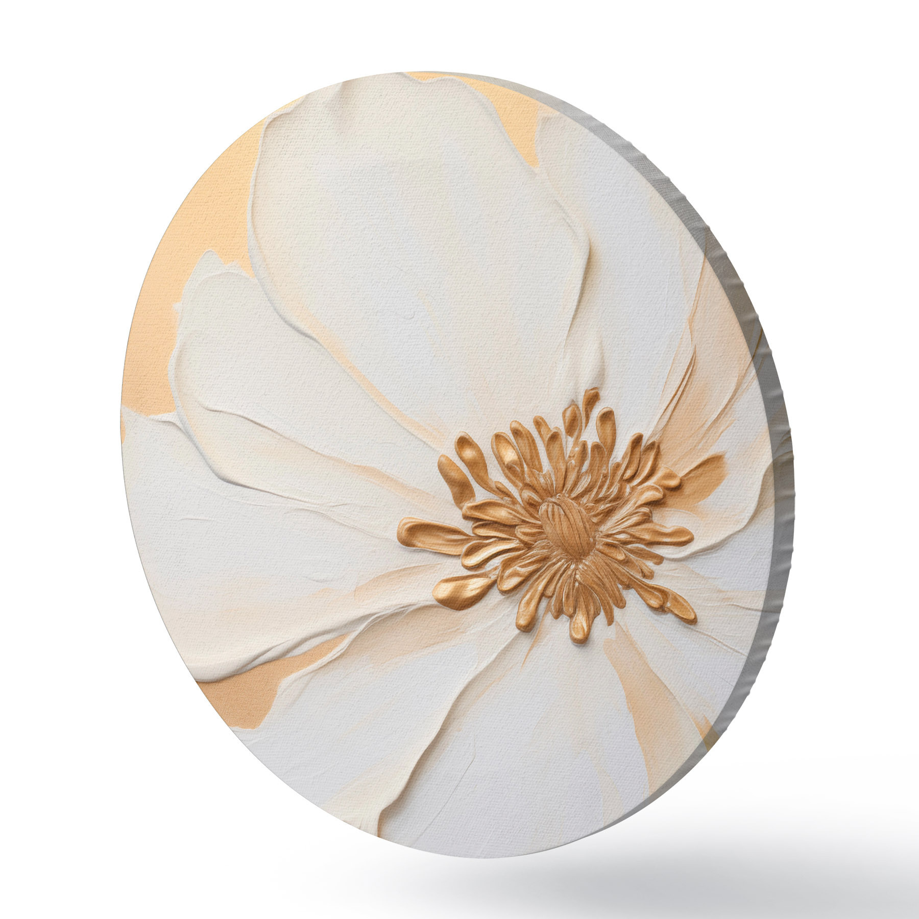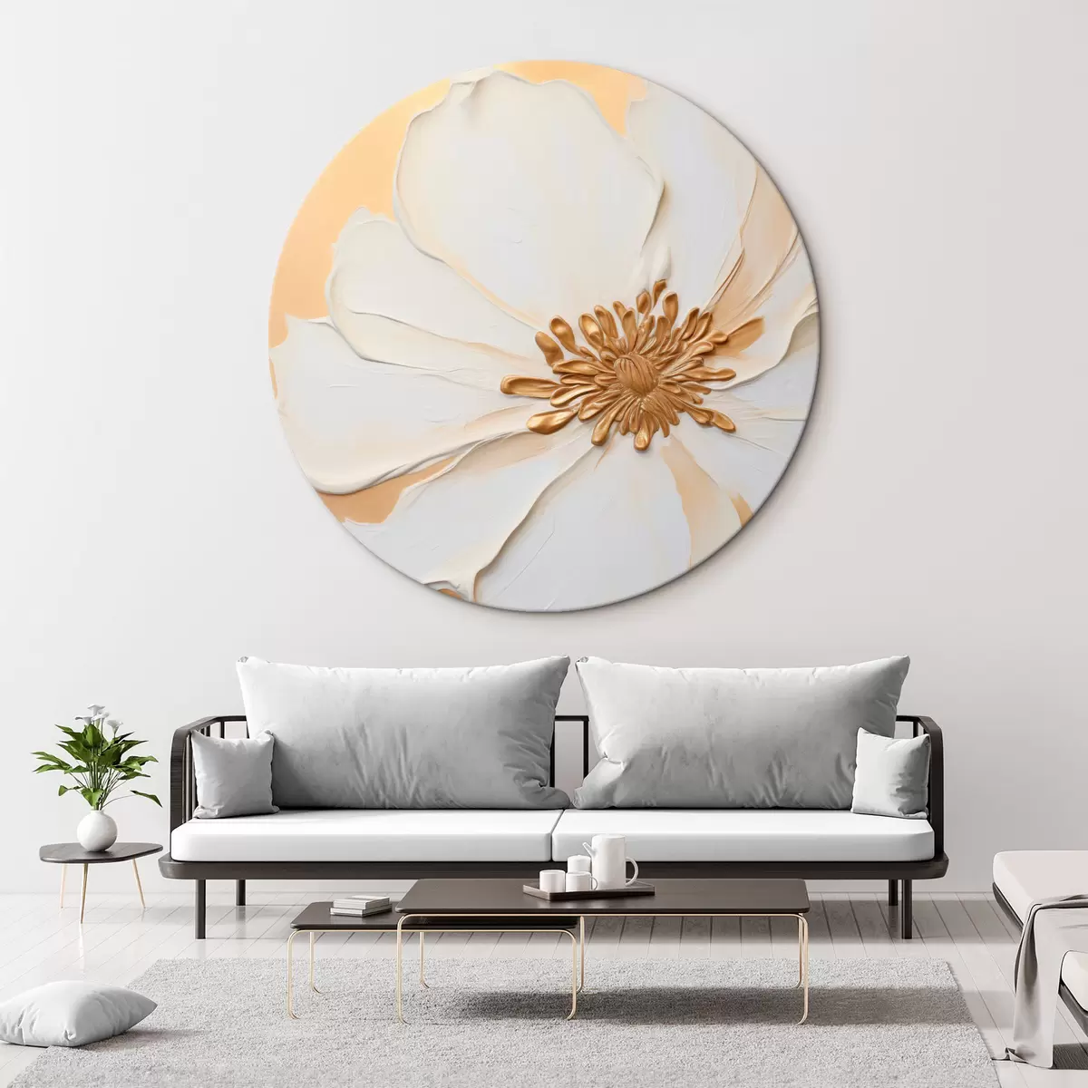 Picturi rotunde Floare albă cu petale delicate, imitație de pensule groase, pe un fundal texturat de culoare portocaliu deschis. Nr r46691