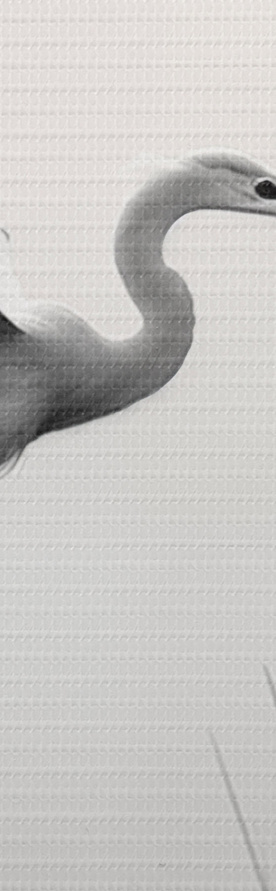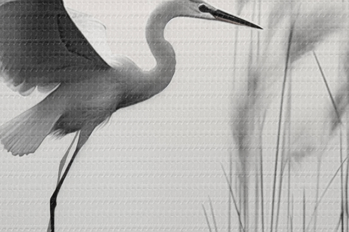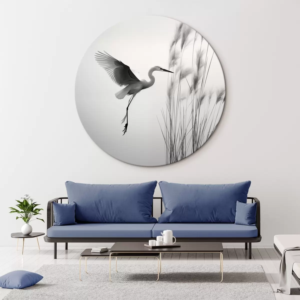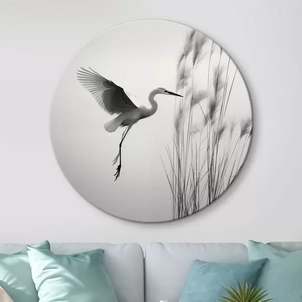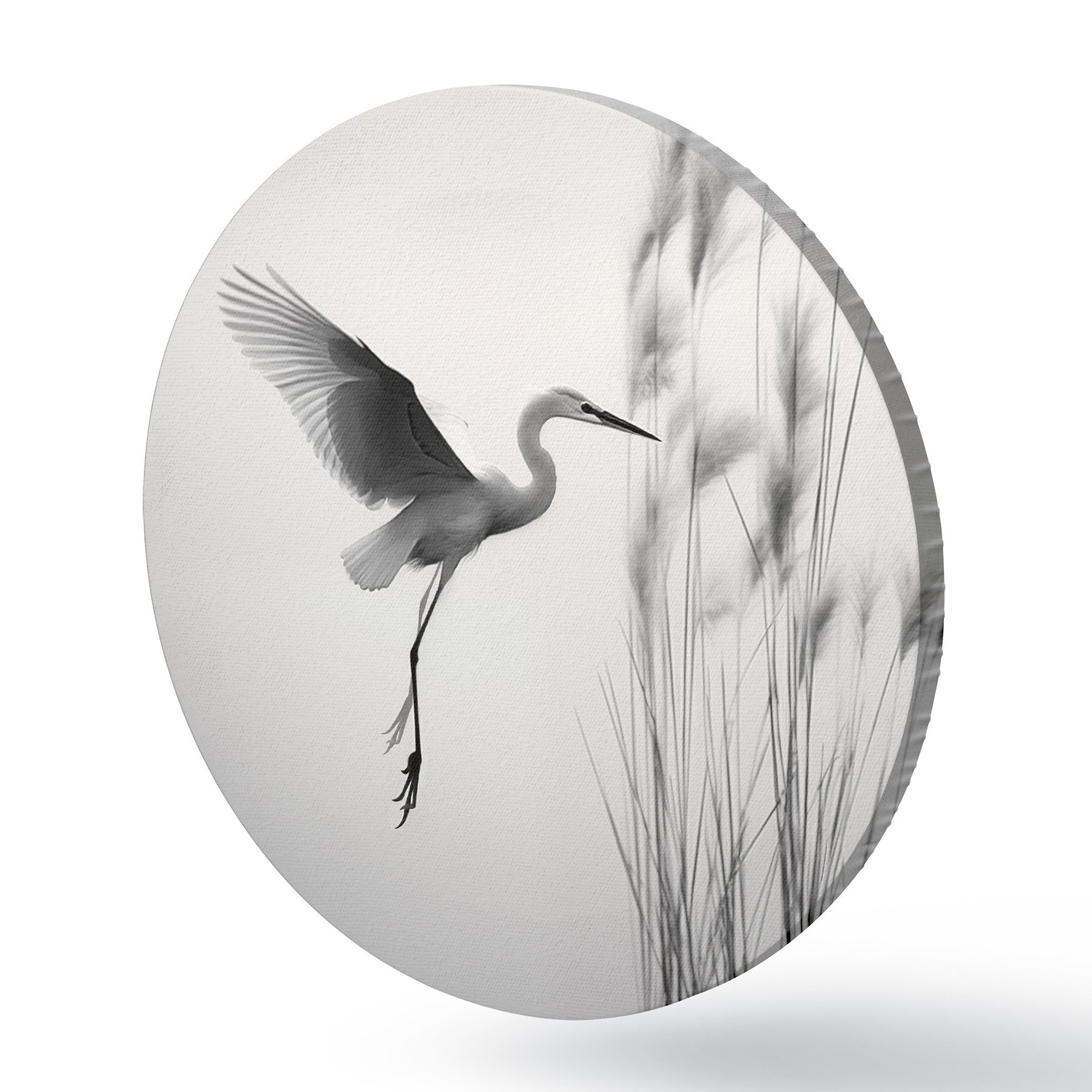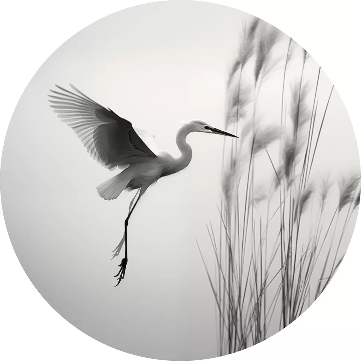 Picturi rotunde O stârcă albă cu aripile întinse, zburând lângă stufărișuri înalte, compoziție minimalistă în alb și negru Nr r46693